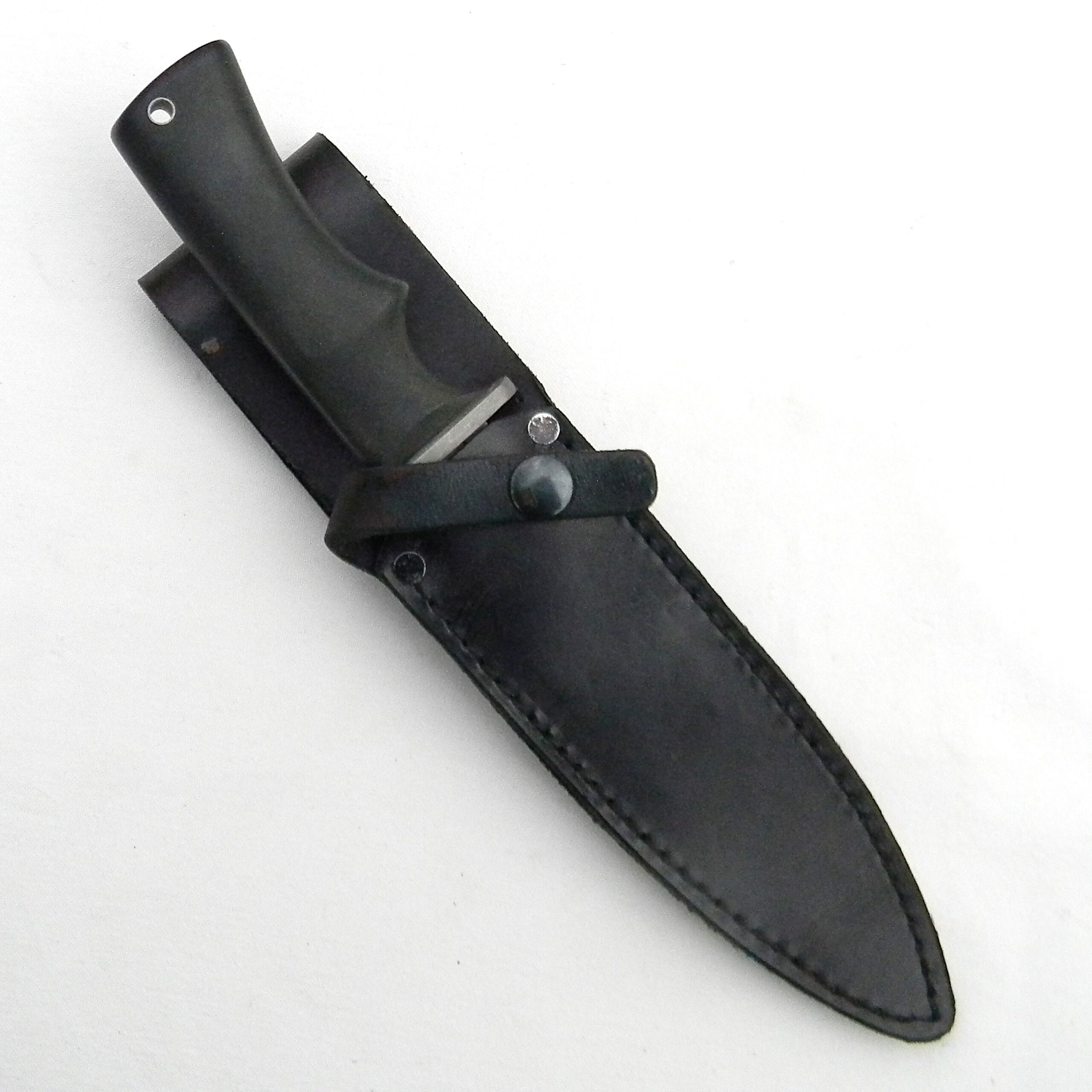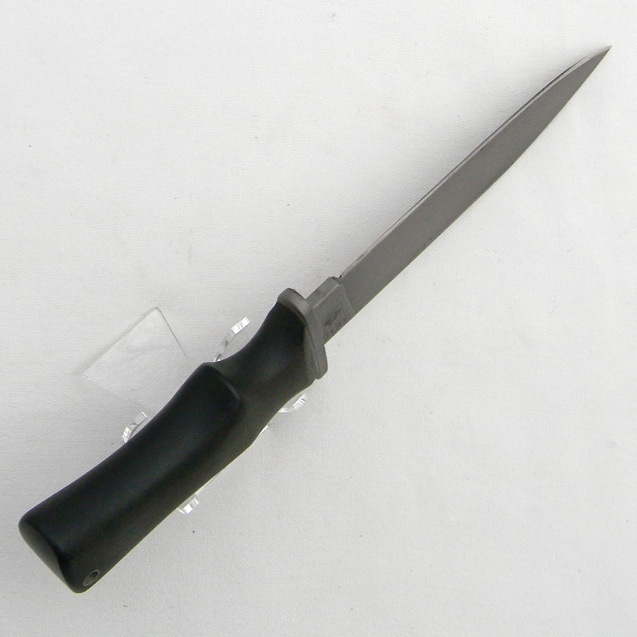This AWAC fighter is in scarce mint condition with original black leather sheath. The knife is about 10-1/2″ / 26.6 cm overall; bead-blasted blade is about 6″ / 15.2 cm; original factory is razor-sharp; the tip is intact. A few very light pots on the spine are just dirt I noticed later and wiped the blade clean. Black non-slip plastic handle with a solid iron guard; all parts are tight. Original black leather sheath is also unused; the leather is soft and supple. Rare short-lived AWAC fighter in very hard-to-find unused condition; this knife will be a welcome addition to any collection.