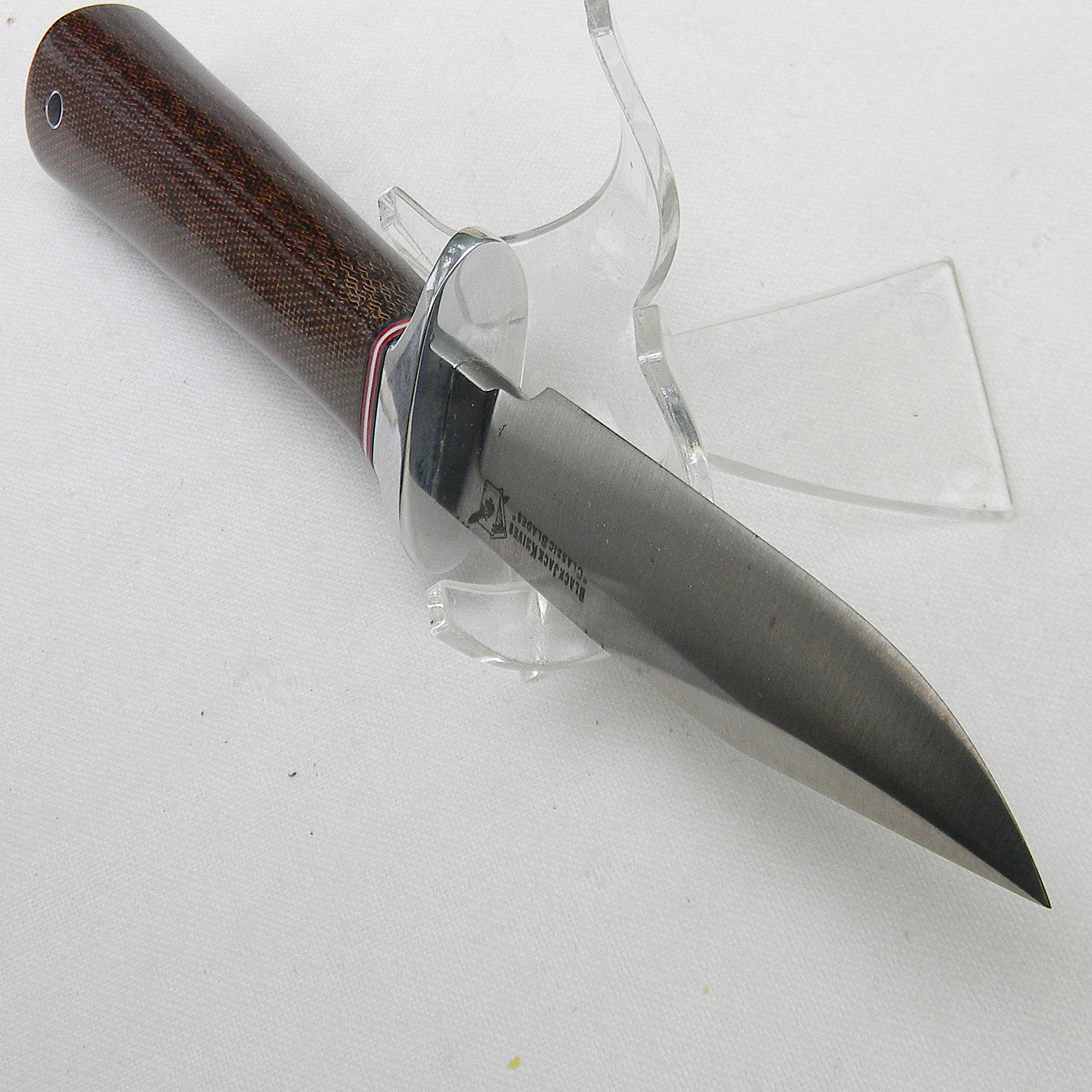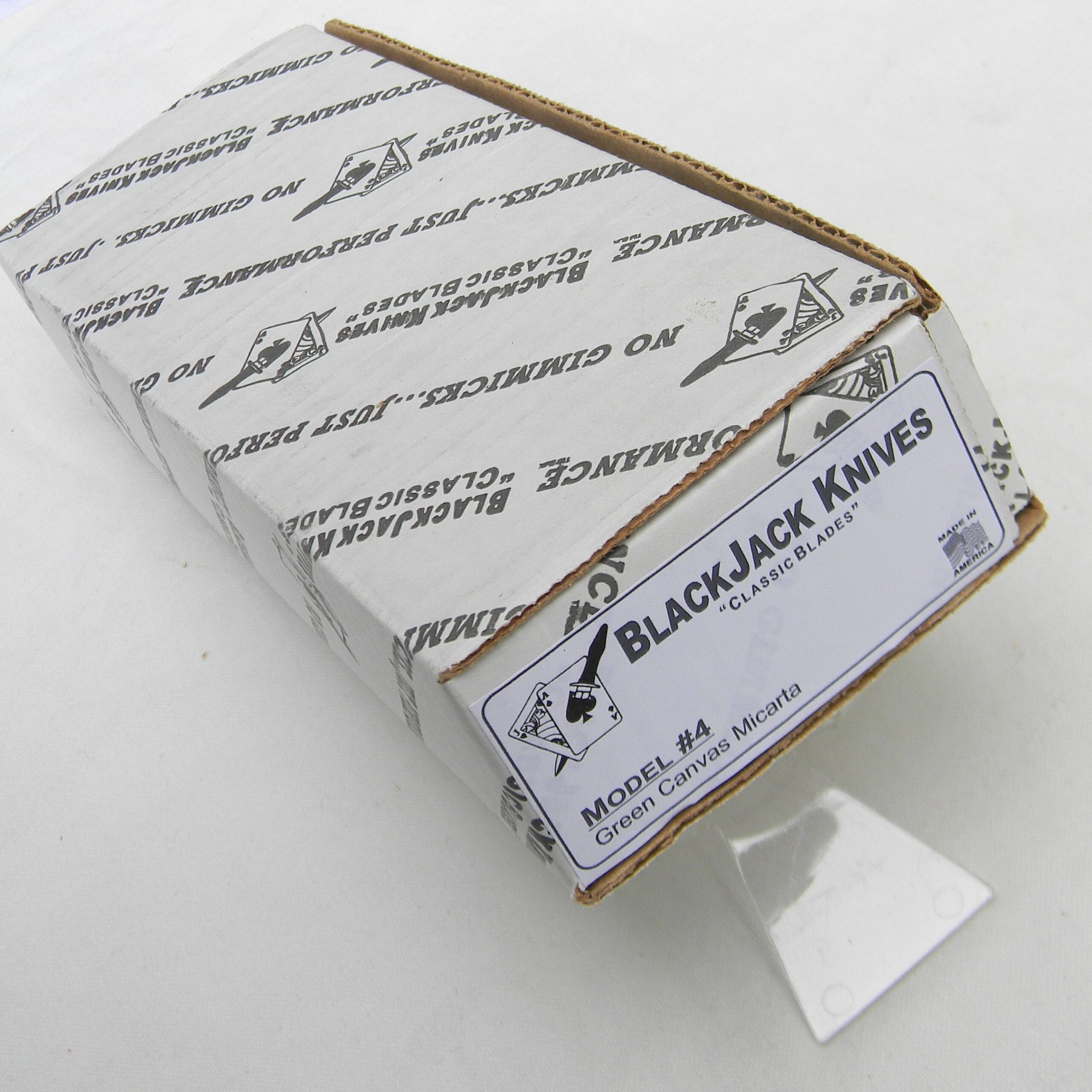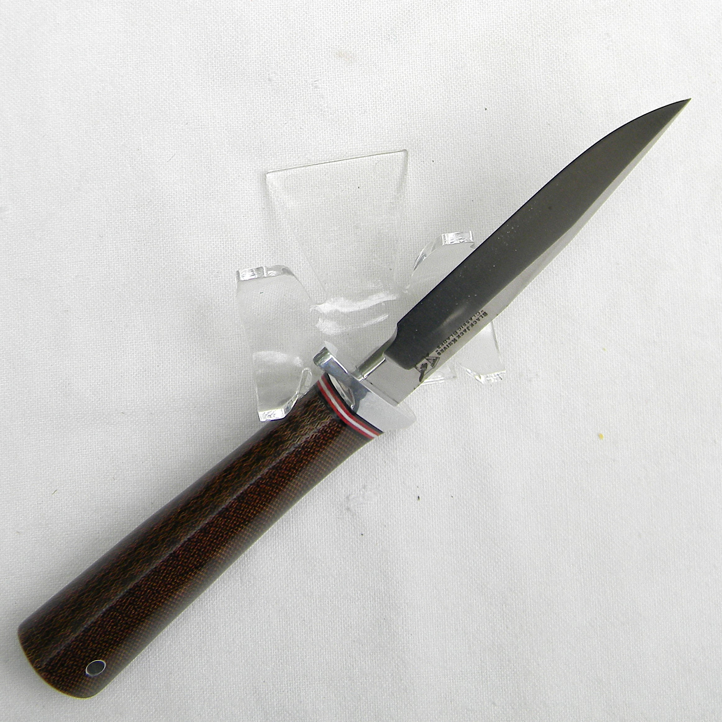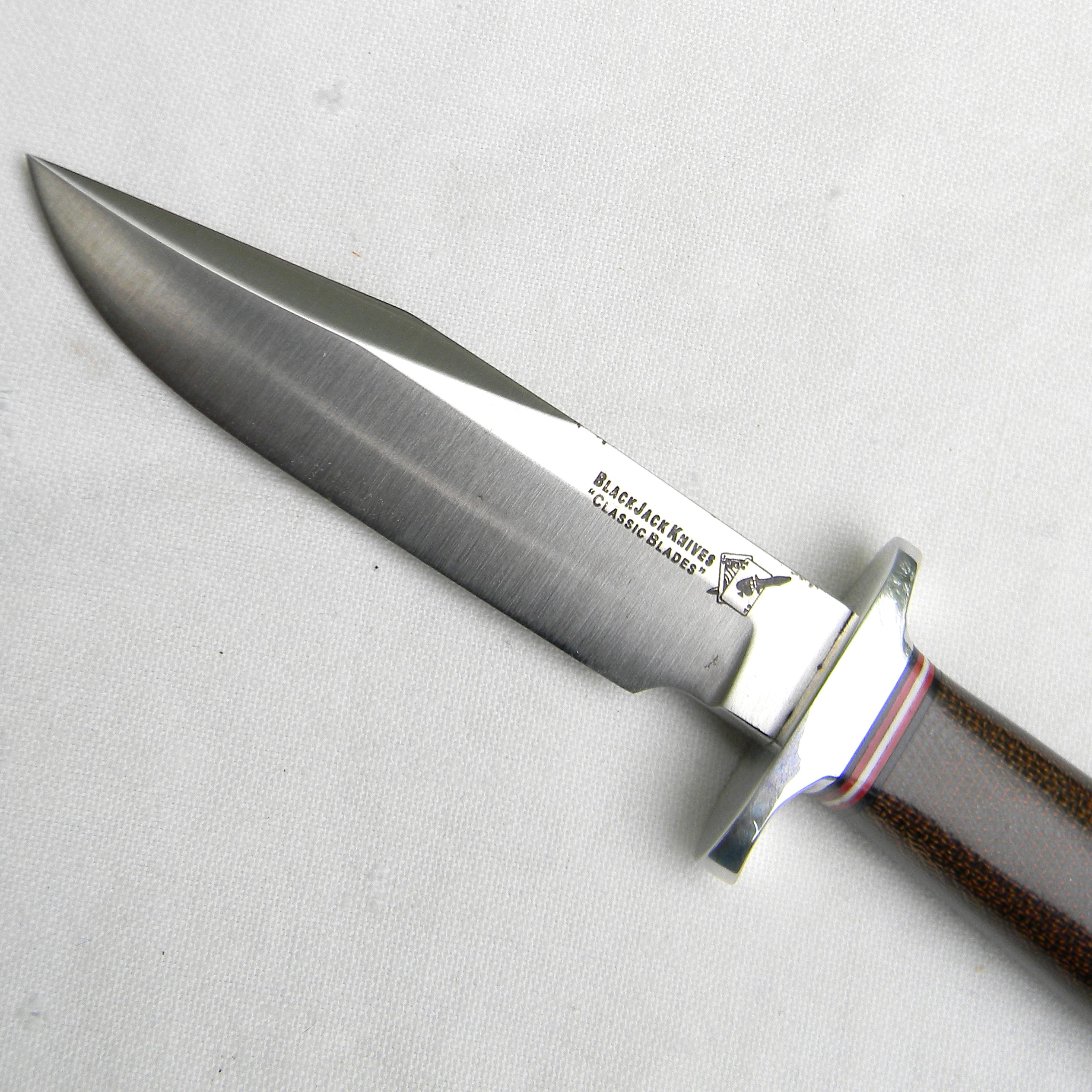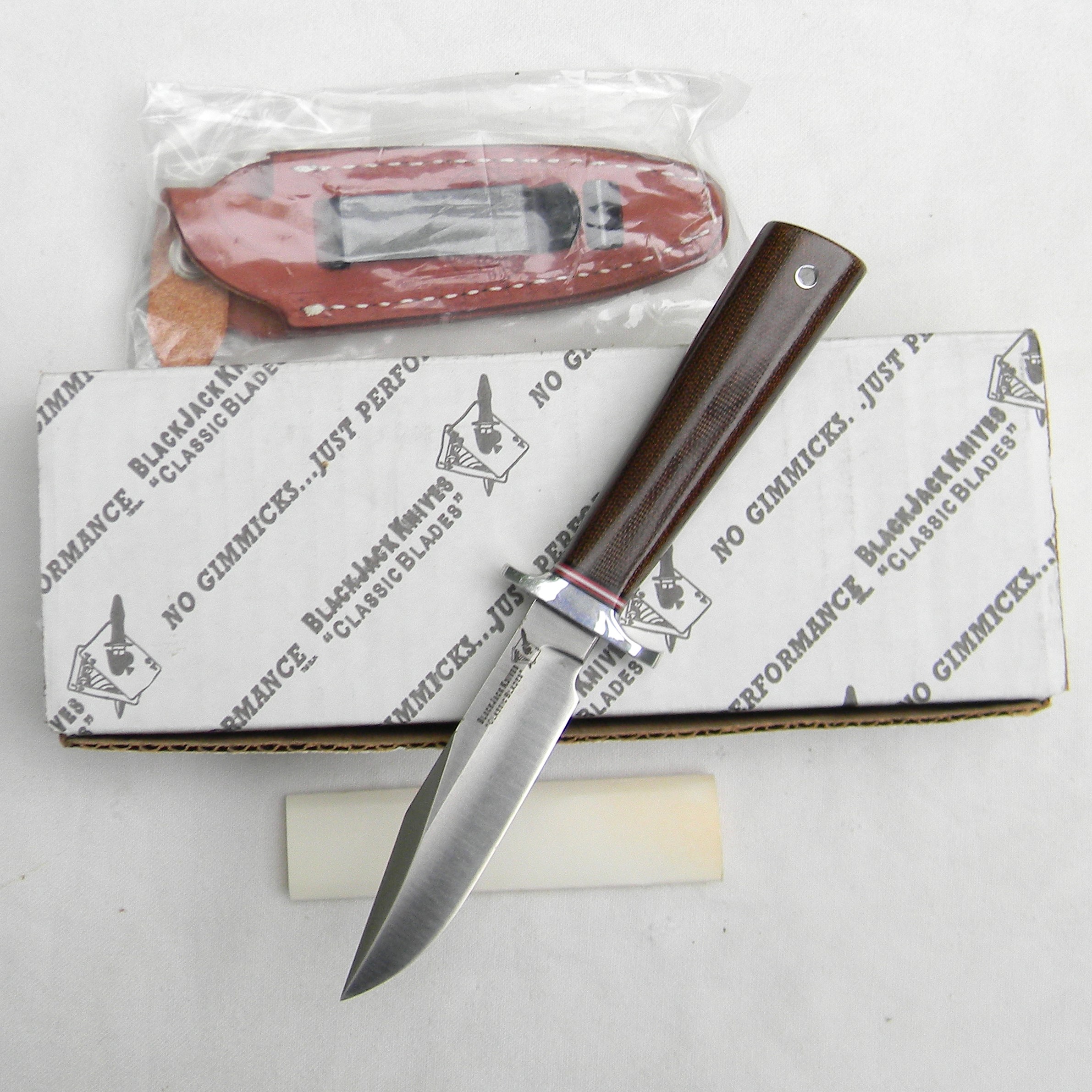 Excellent quality original US-made Model 4 Boor Knife A-2 tool steel blade fighting knife made by Blackjack Knives. This scarce model is unused, still in the original correctly-labeled retail box with a cardboard blade protector and “clip-on” brown leather sheath. This is Model #4 of Blackjack’s Classic Blades lineup; this knife is of the highest quality. Blackjack had always made extremely well-made knives from the best materials available. But their labor intensive production also made it hard to compete with cheap mass-produced Chinese junk. This was one of the main reasons why Blackjack went bankrupt. Below is the Model 4 description: