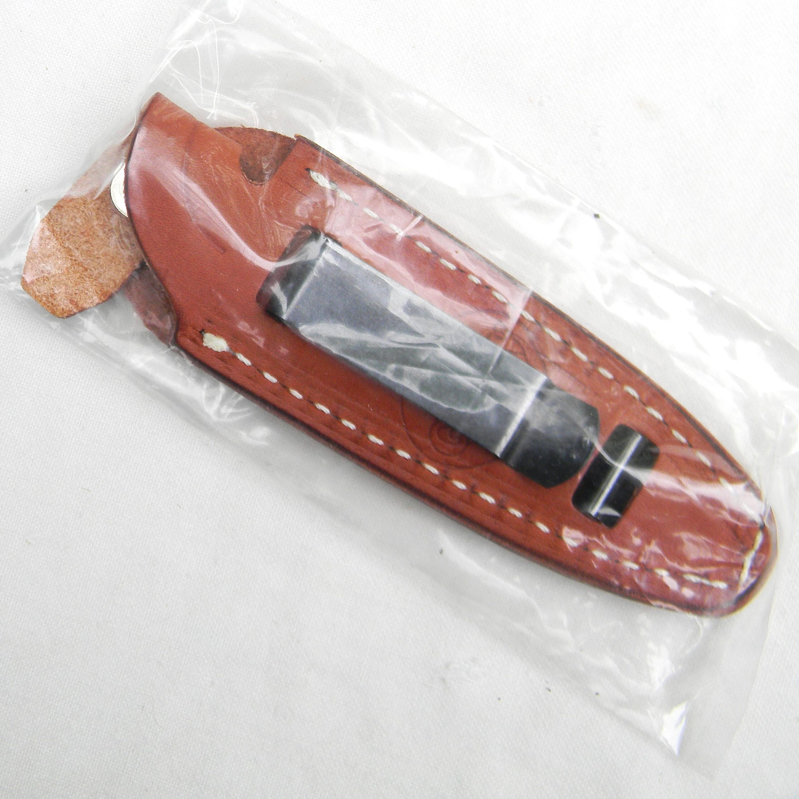 The handle is solid, all parts are tight. Original “lip-on “boot carry” brown leather sheath is also unused; the leather is soft and supple. This well-made Blackjack model 4 boot knife in hard-to-find unused condition will be a welcome addition to any collection.