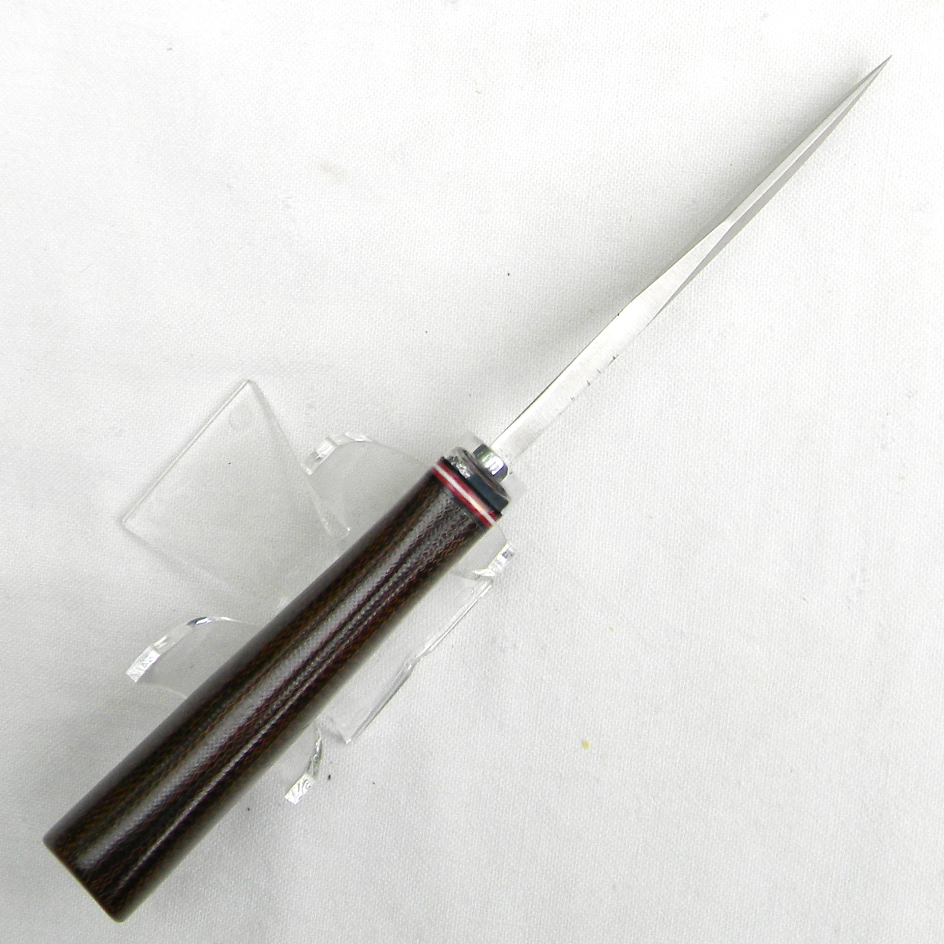 This small combat/survival style knife balances perfectly in the hand and will take hard rugged use in any situation. The hand convex ground blade is made from solid A2 tool steel and triple tempered to 58 Rockwell C hardness. The knife is equipped with a thick aluminum alloy double quillion guard.