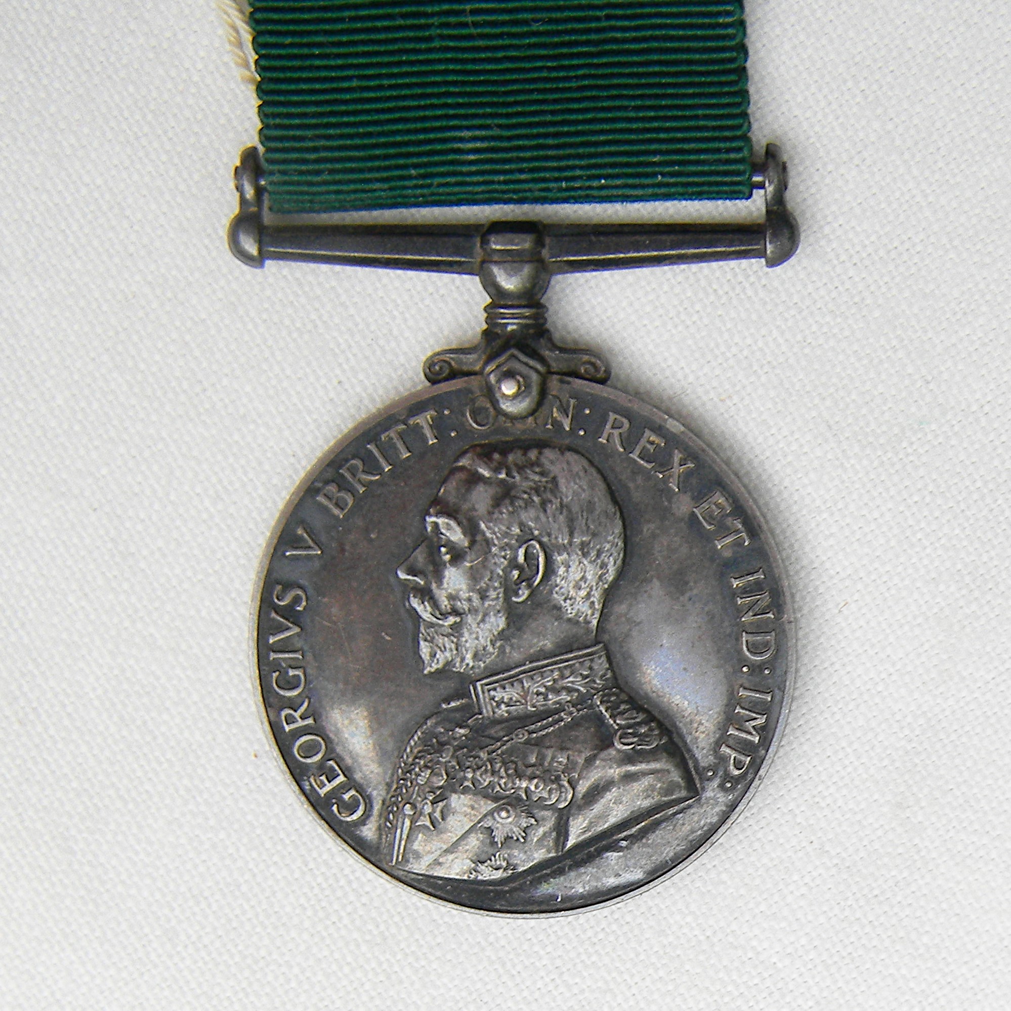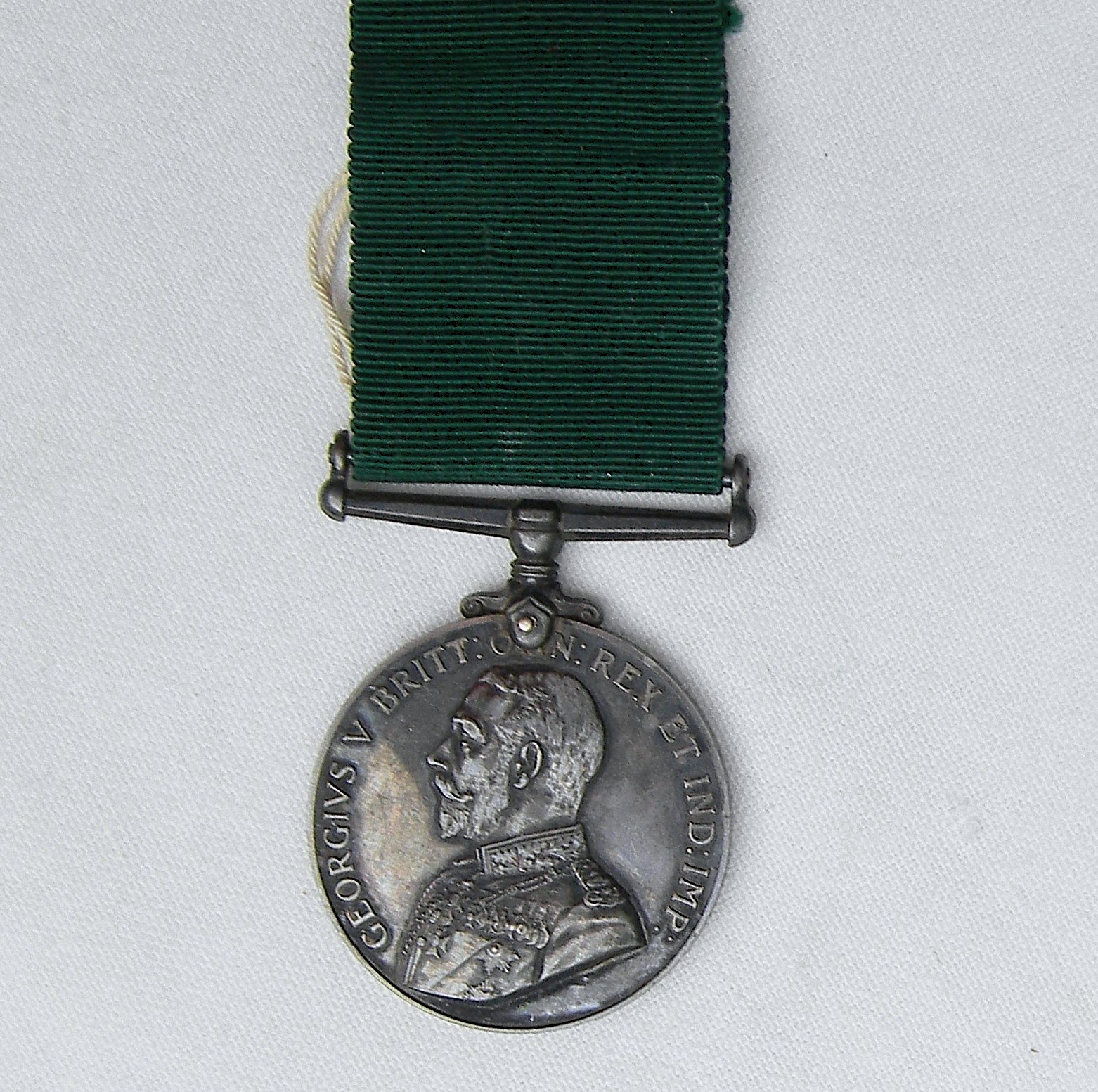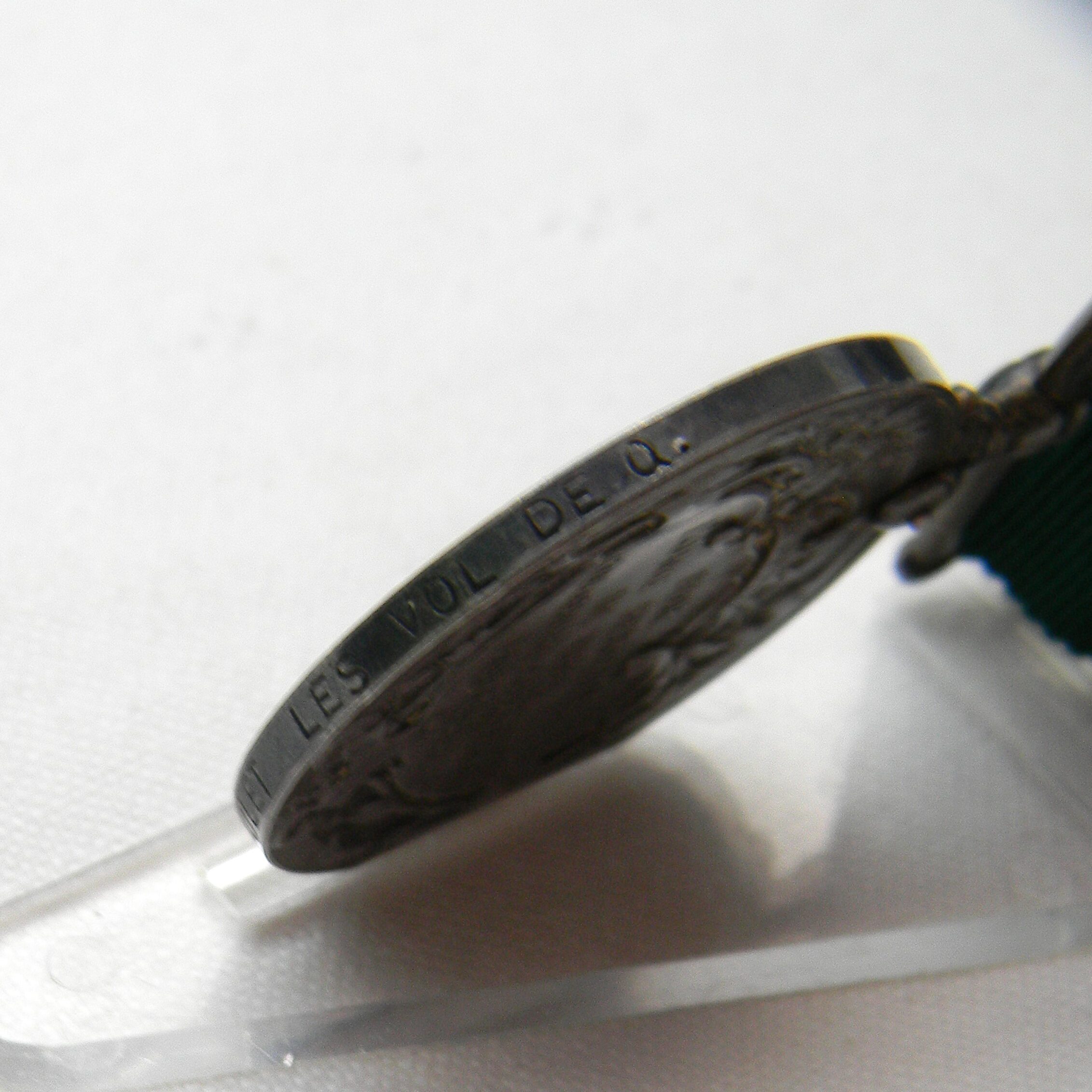 Hard to find original pre-WW2 issue British Empire Colonial Auxiliary Forces silver medal awarded circa 1910-1930. This type was awarded for 20 years of service and was discontinued in 1930; a scarce type. This specimen was awarded to Canadian Private P. Poulet: the inscription punched on the edge reads “PTE. P. POULET LES VOL DE Q.” The inscription stands for “Les Voltigeurs de Québec” – a regiment in the Canadian militia. Original silk ribbon and vintage collector’s tag are included. This medal is in excellent overall condition for the type and rare this nice and complete. The medal is about 36.4 mm in diameter; total weight with the ribbon and pin is about 36.4 grams. Not cleaned with very attractive original dark-gray patina throughout, all parts are tight with no play.