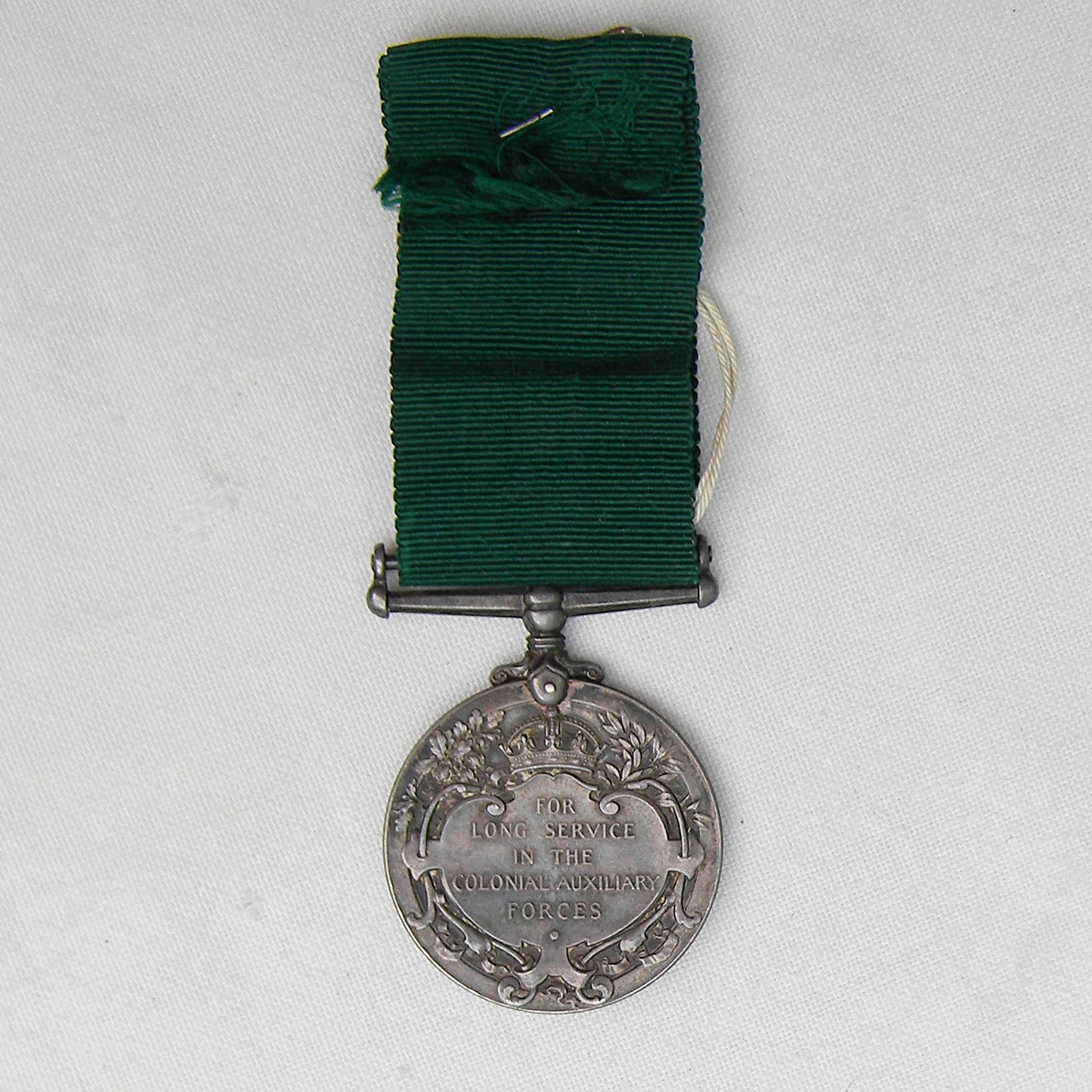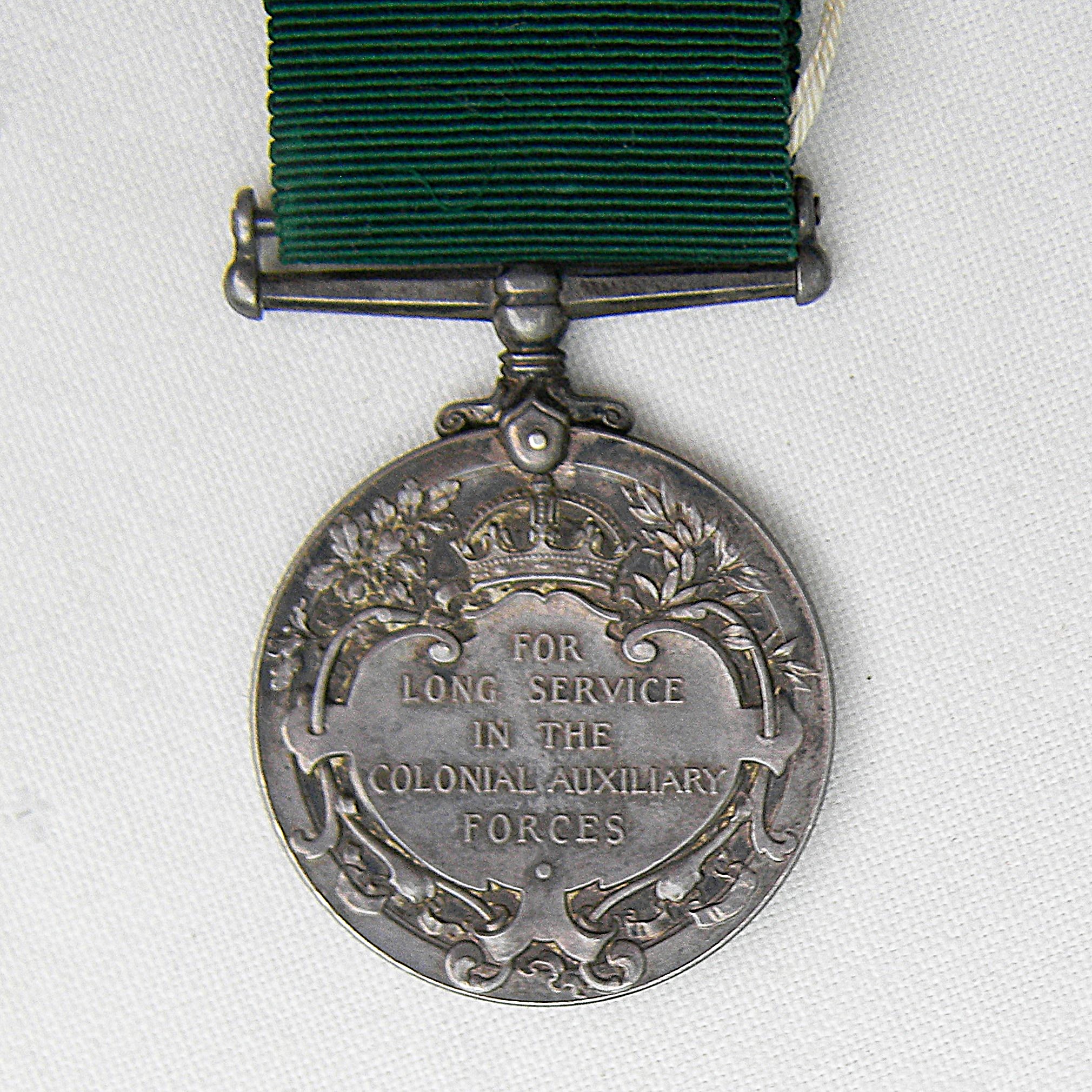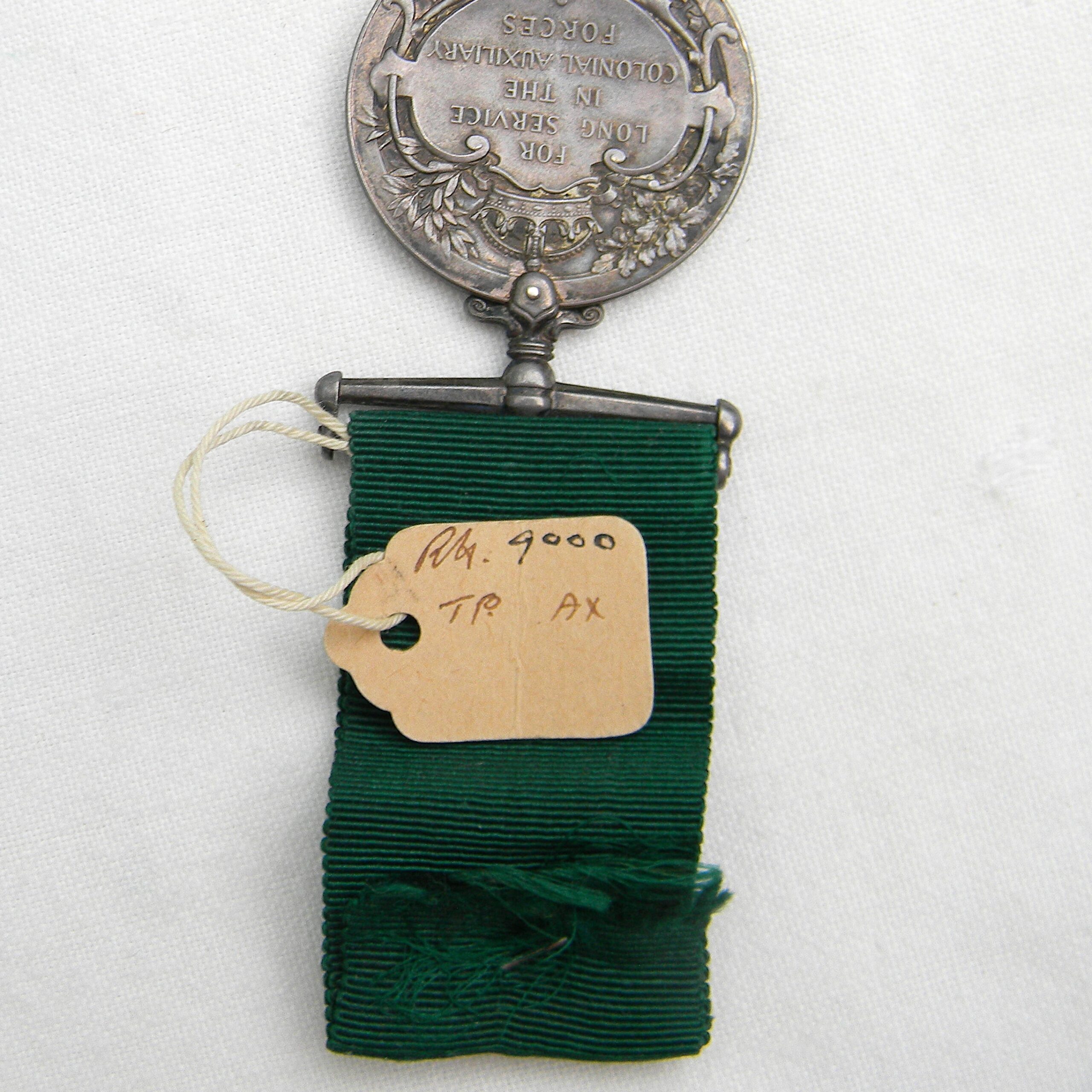 British Empire Colonial Auxiliary Forces silver medal awarded circa 1910-1930 to Canadian Pvt. P Poulet. Original silk ribbon, collector’s tag included; excellent overall condition, considering the age. FREE SHIPPING WITHIN THE U.S. FOR THIS ITEM.
