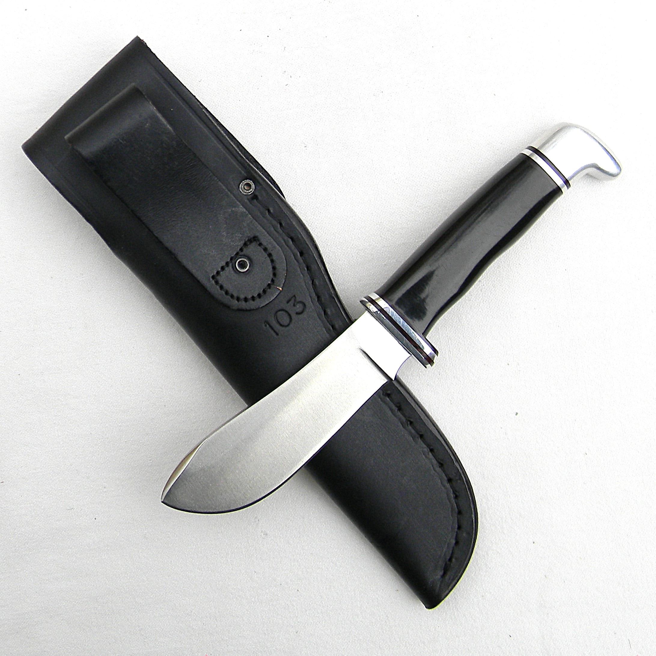 Vintage “good-old days” US-made BUCK KNIVES model 103 SKINNER in the original old-style “pistol” all-leather sheath – unused and still in the original correctly-labeled retail box with papers. Made in the USA circa 1972-1985 (4 Bakelite spacers, 3-liner logo on ricasso). This vintage 103 Skinner set is in excellent overall condition; these old timers are hard-to-find this nice and complete.