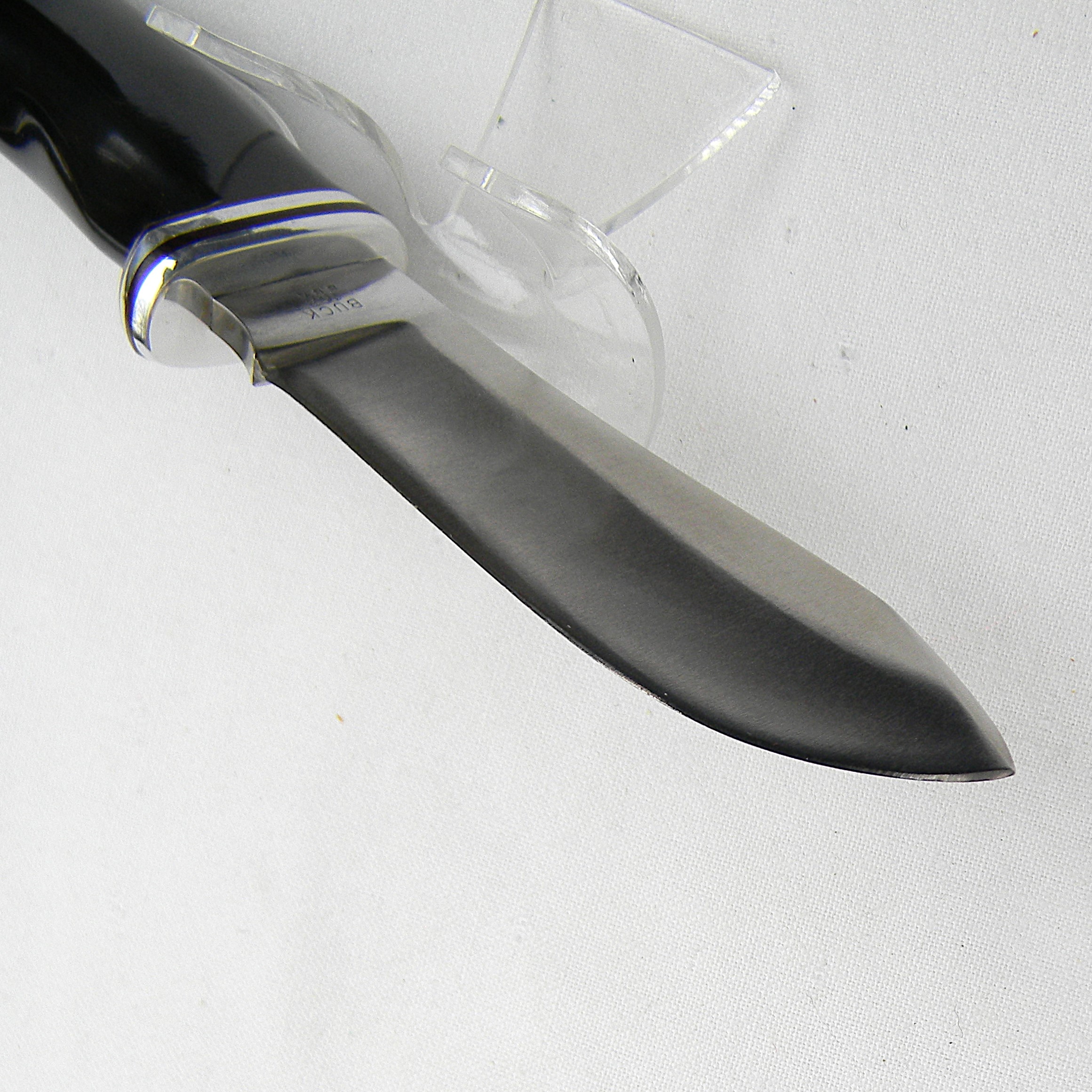 The knife is about 8-1/8″ / 20.7 cm overall; the blade is about 4″ / 10.2 cm. Original factory edge is razor-sharp; the tip is intact. Original top-flap black leather sheath is also unused; the leather is soft and supple. Original cardboard retail box is in near-excellent condition. Included are Buck’s care instructions / registration card; a “Word from the President of Buck Knives” and original wrapping paper. This excellent quality vintage Buck USA model 103 Skinner is in rare unused condition; still in the original retail box with papers; you will not be disappointed.