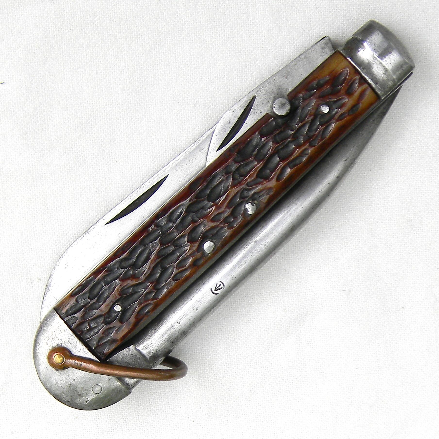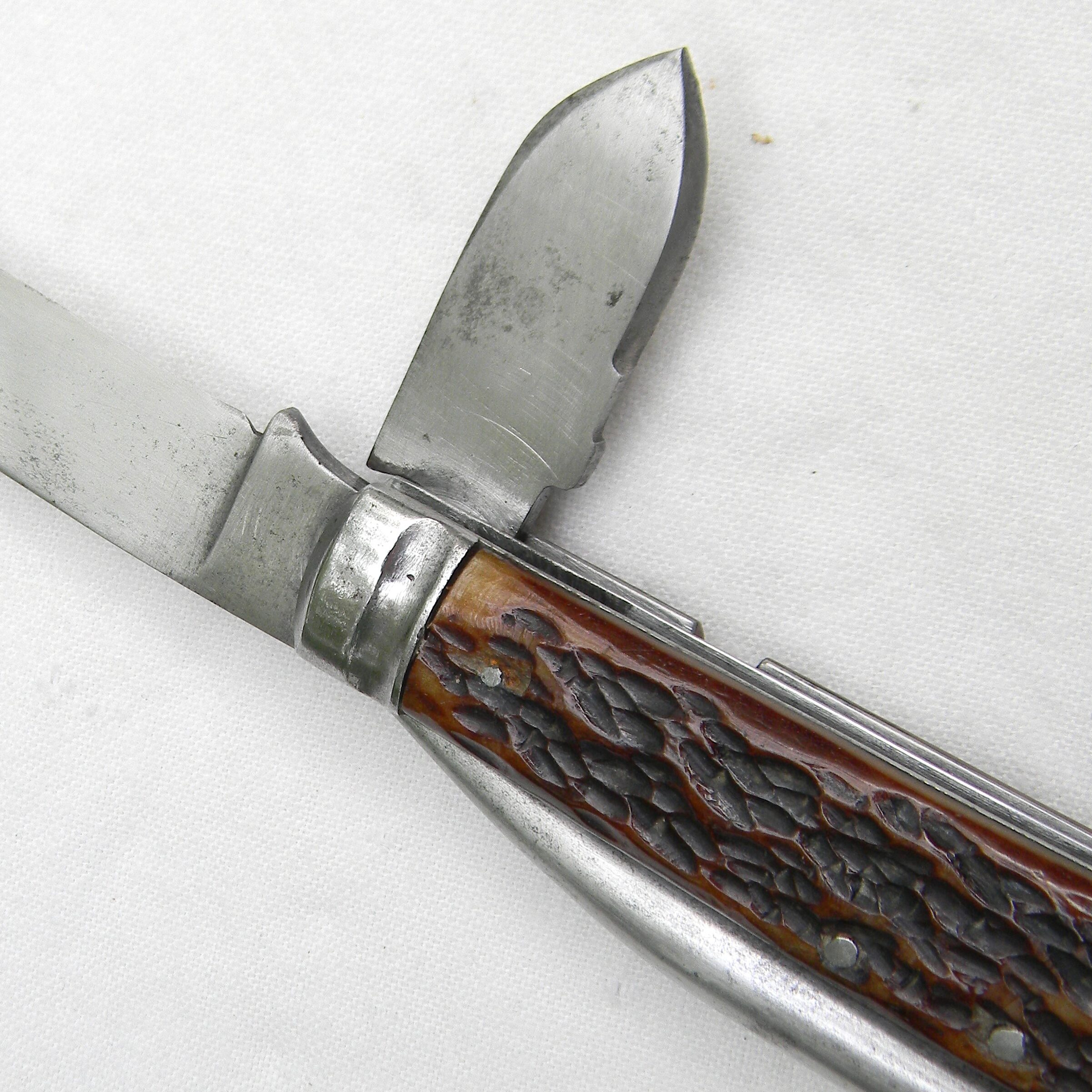 Despite the advanced age, this specimen is in excellent overall condition and very rare as such. This type was typically used in the filed as intended; exposed to the salt water and moisture, most surviving specimens are in poor shape. This large folder is about 5″ / 12.7 cm closed; heavy-duty marlin spike is about 4” / 10.2 cm long; the tip in intact; the spike is nice and tight with no play. Drop-point blade is about 4″ / 10 cm long; the edge is very sharp still; the tip is intact. All blades open and close with a snap; the tin opener blade is in great condition as well. The tang on the main blade is stamped with the Schatt & Morgan Cutlery logo; marlin spoke is stamped with the Canadian “broad arrow” inside letter C arsenal acceptance stamp. Original jigged bone handle scales in near-excellent; no chips or cracks; copper shackle is intact; all handle parts are solid with no play.