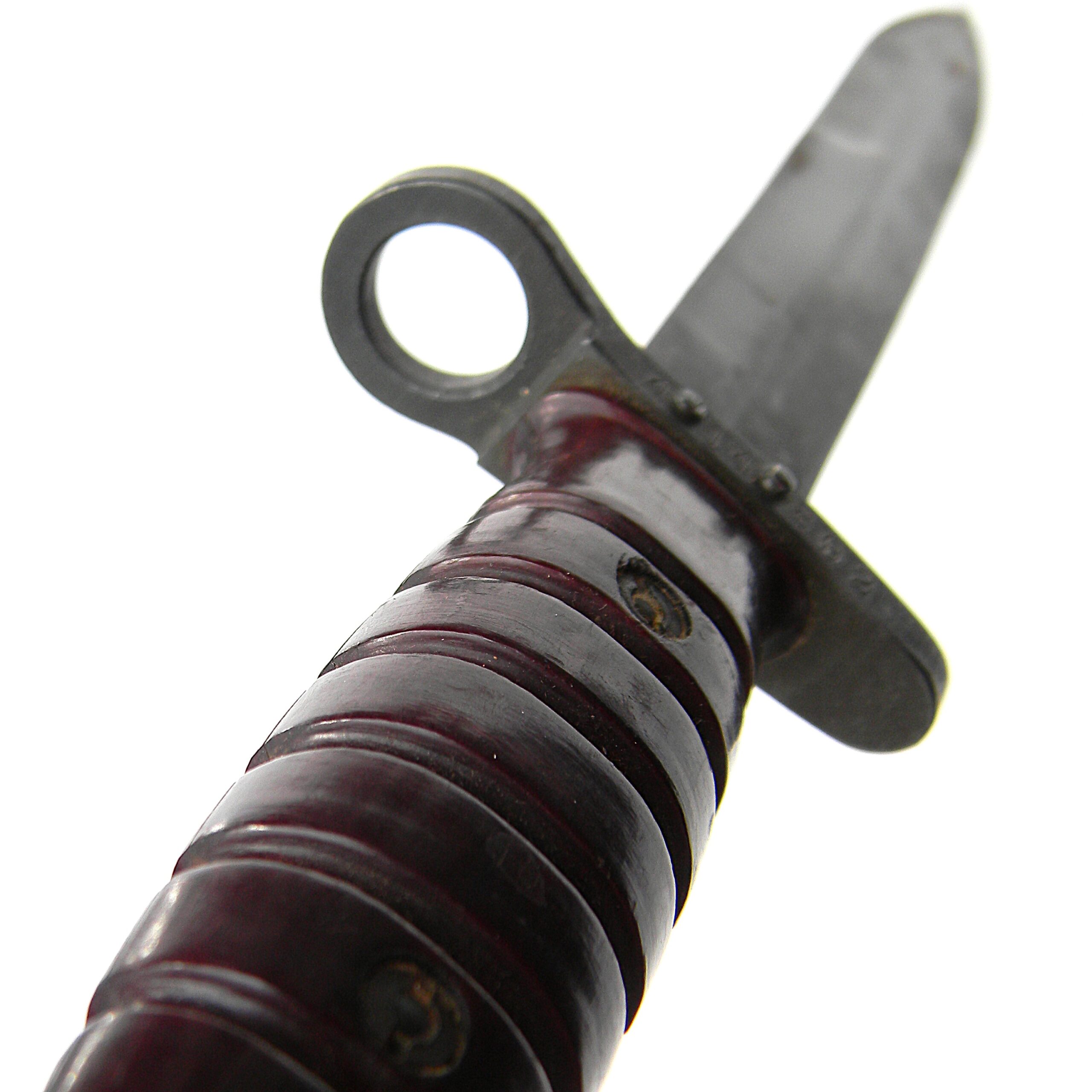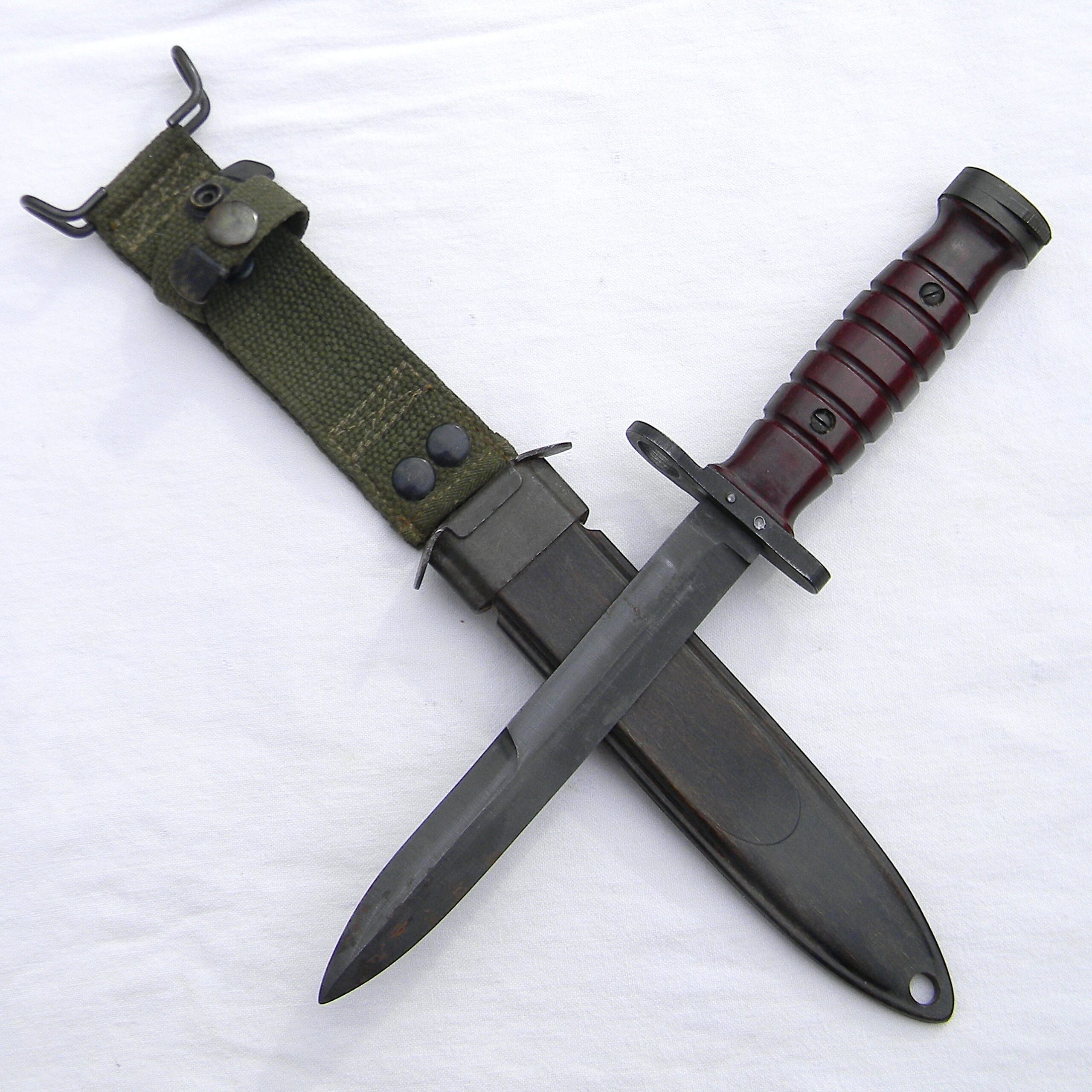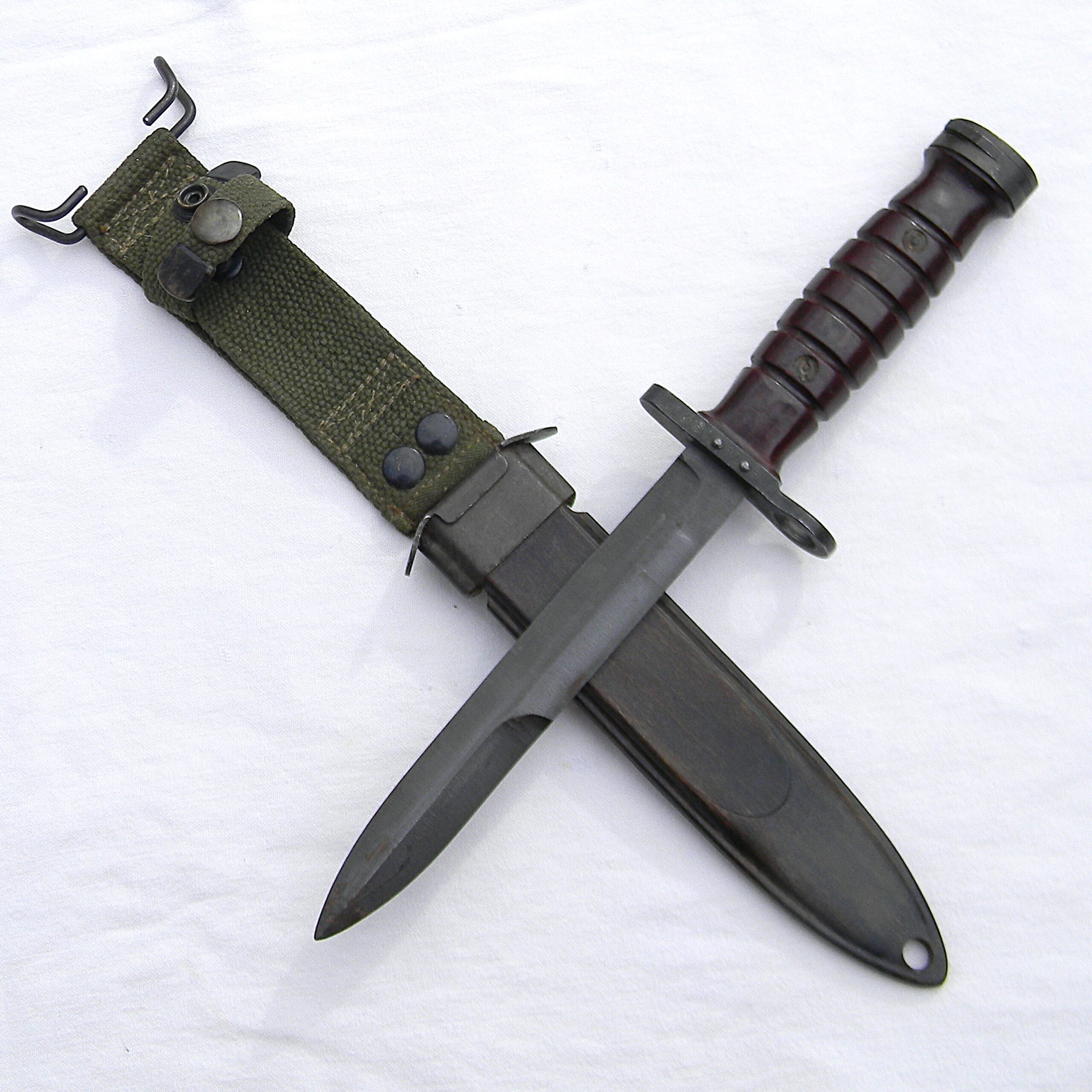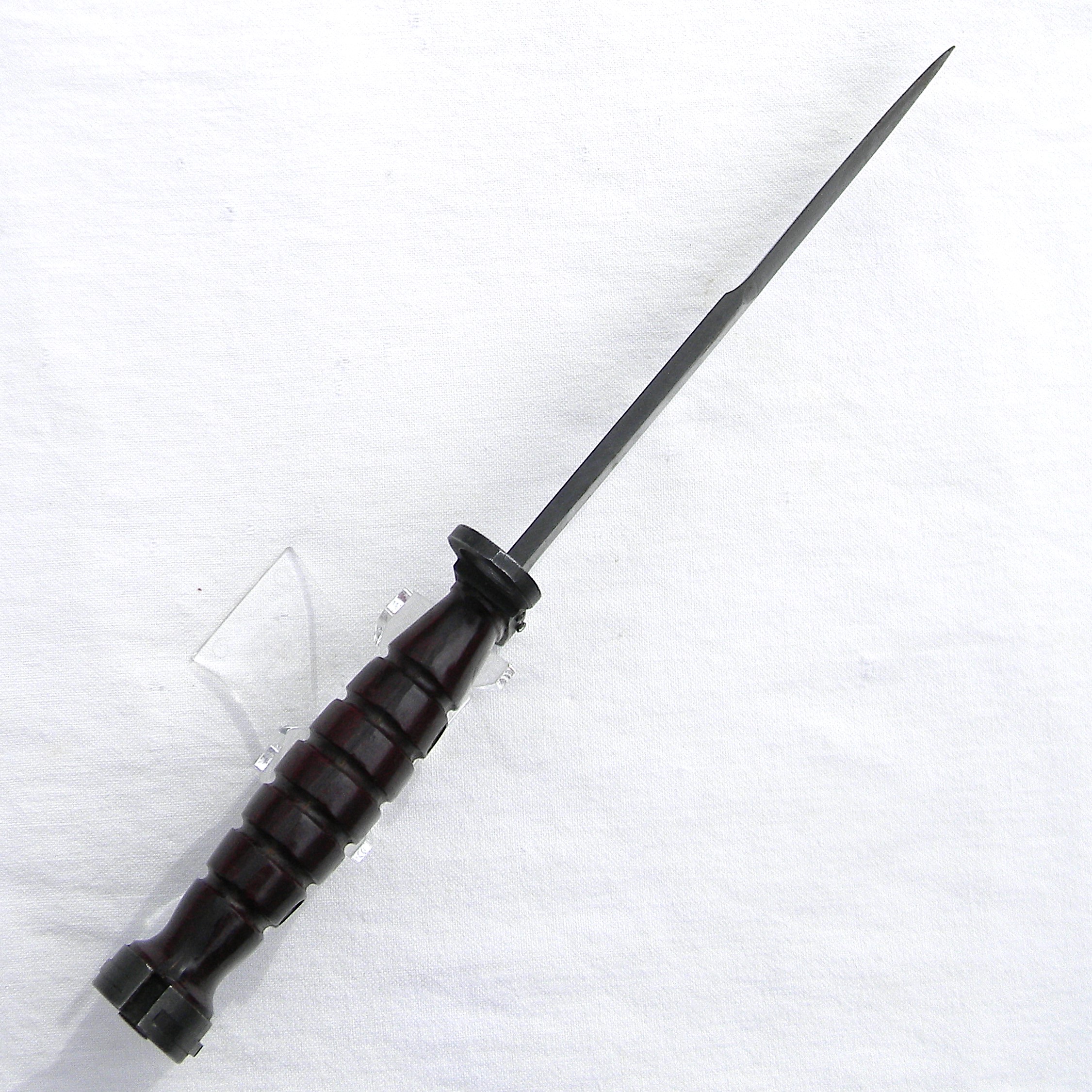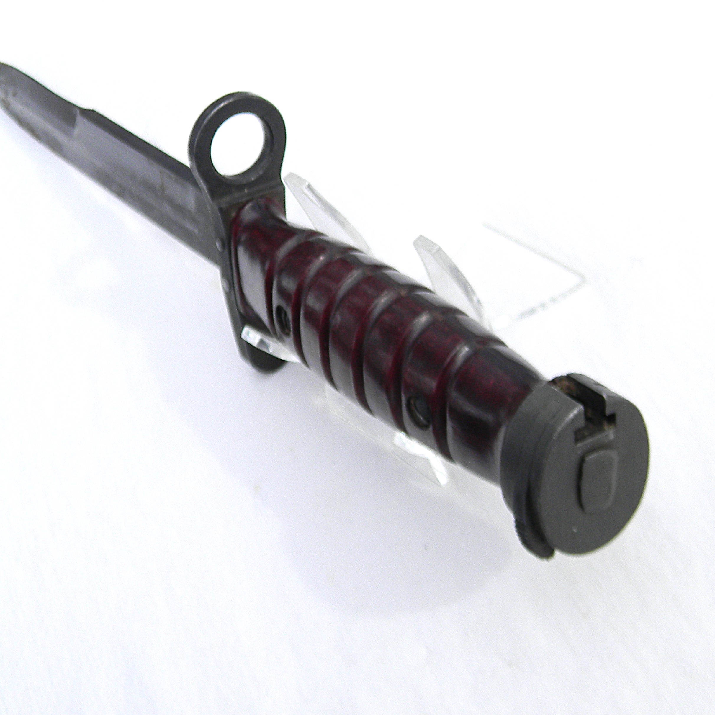 Cold War Dutch M4 bayonet made in 1951-1952 by E&F Hörster, Germany; original “wood grain” scabbard included. Scarce type in rare UNUSED condition.