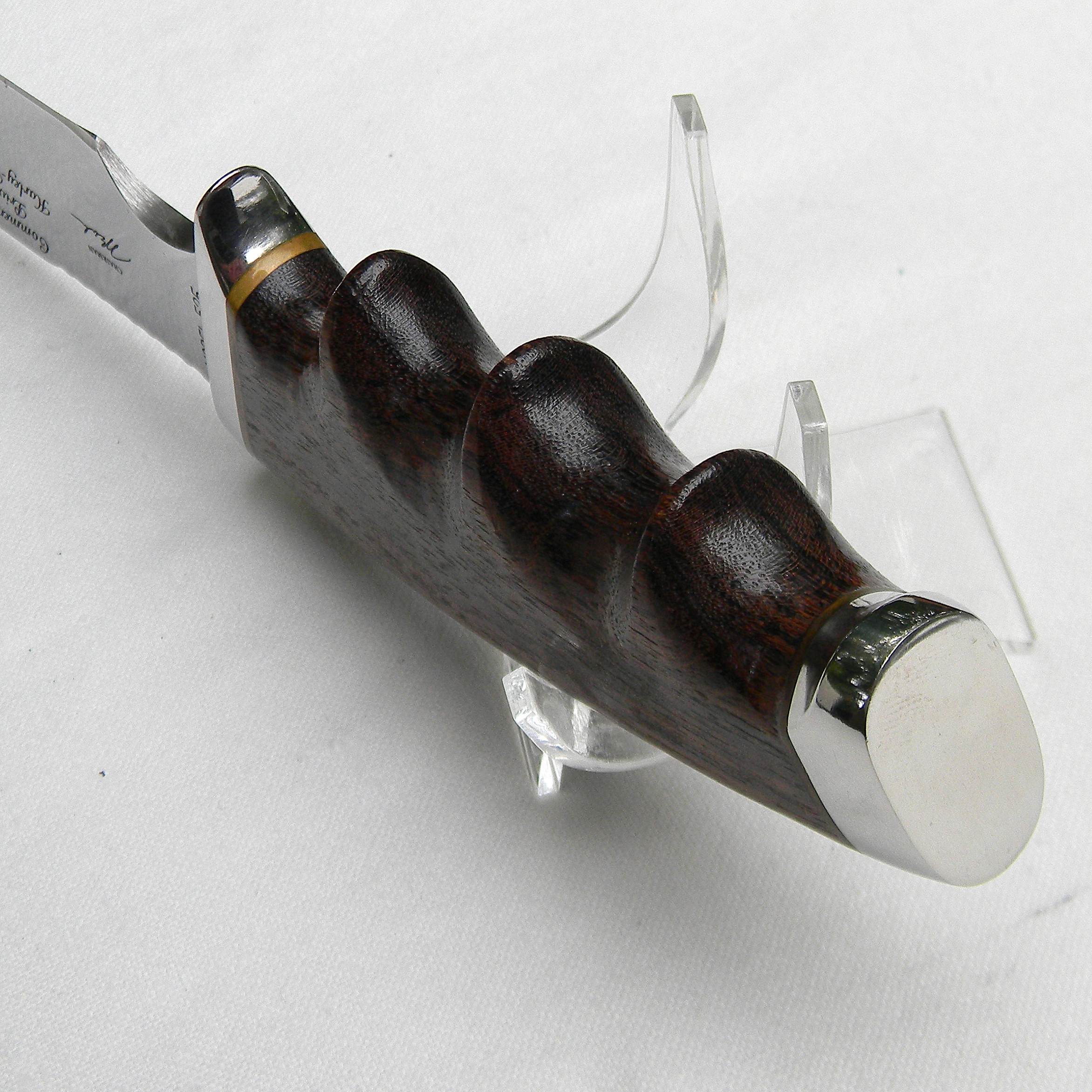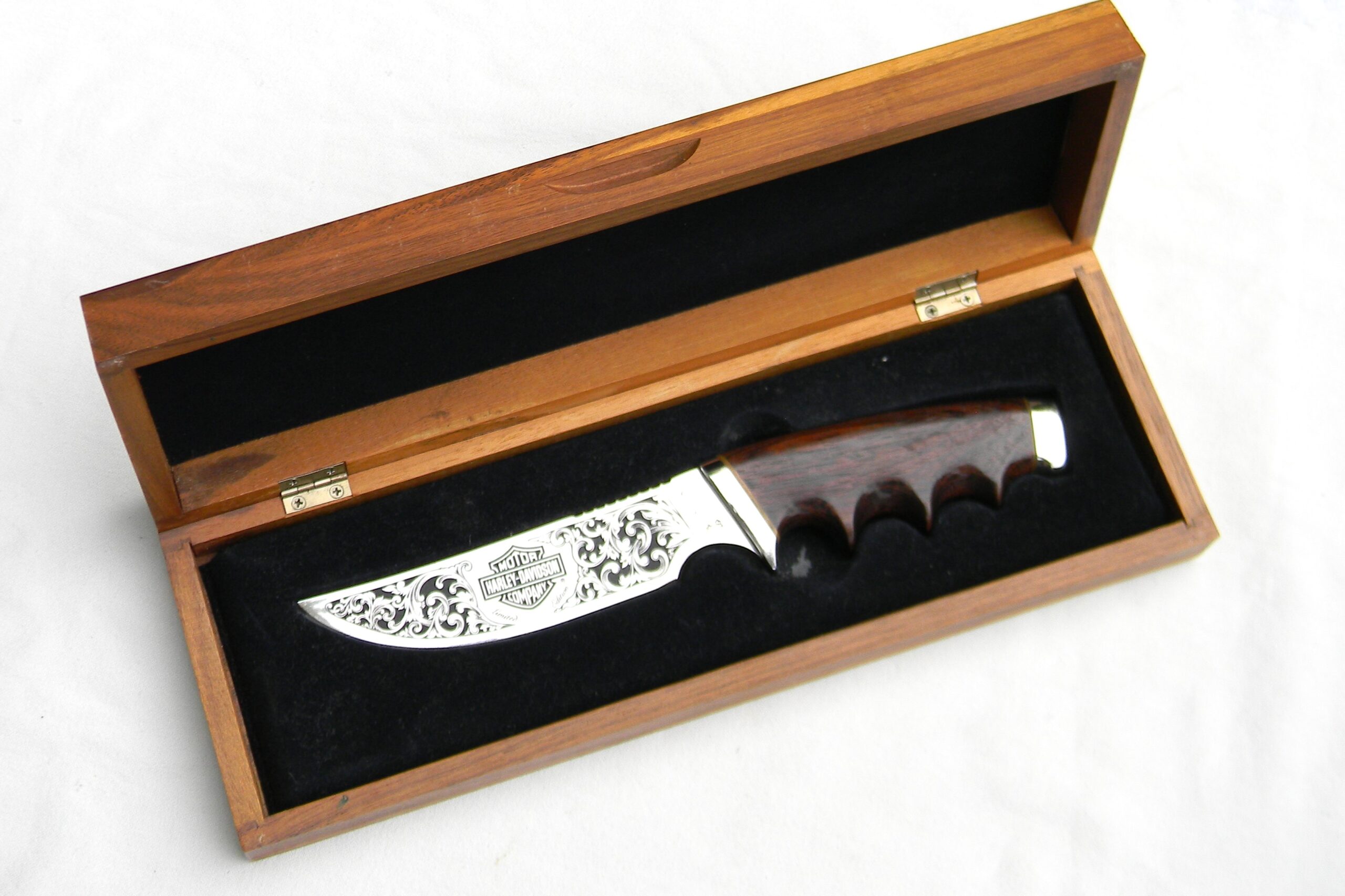 Scarce limited edition Gerber Legendary Blades presentation version of model 525 Hunter-Skinner Gerber produced for Harley Davidson Motorcycles in 1981. This scarce discontinued Gerber Hunter was hand-finished at the Gerber factory in Portland, Oregon, USA. The entire “Harley Davidson” run was limited to 3000 serial-numbered knives; this specimen’s SN is 1534/3000. The etching was done by the long-gone Aurum Etchings; exotic African Zebrawood was chosen as the handle material. This specimen is in rare unused condition with original hardwood presentation box included.