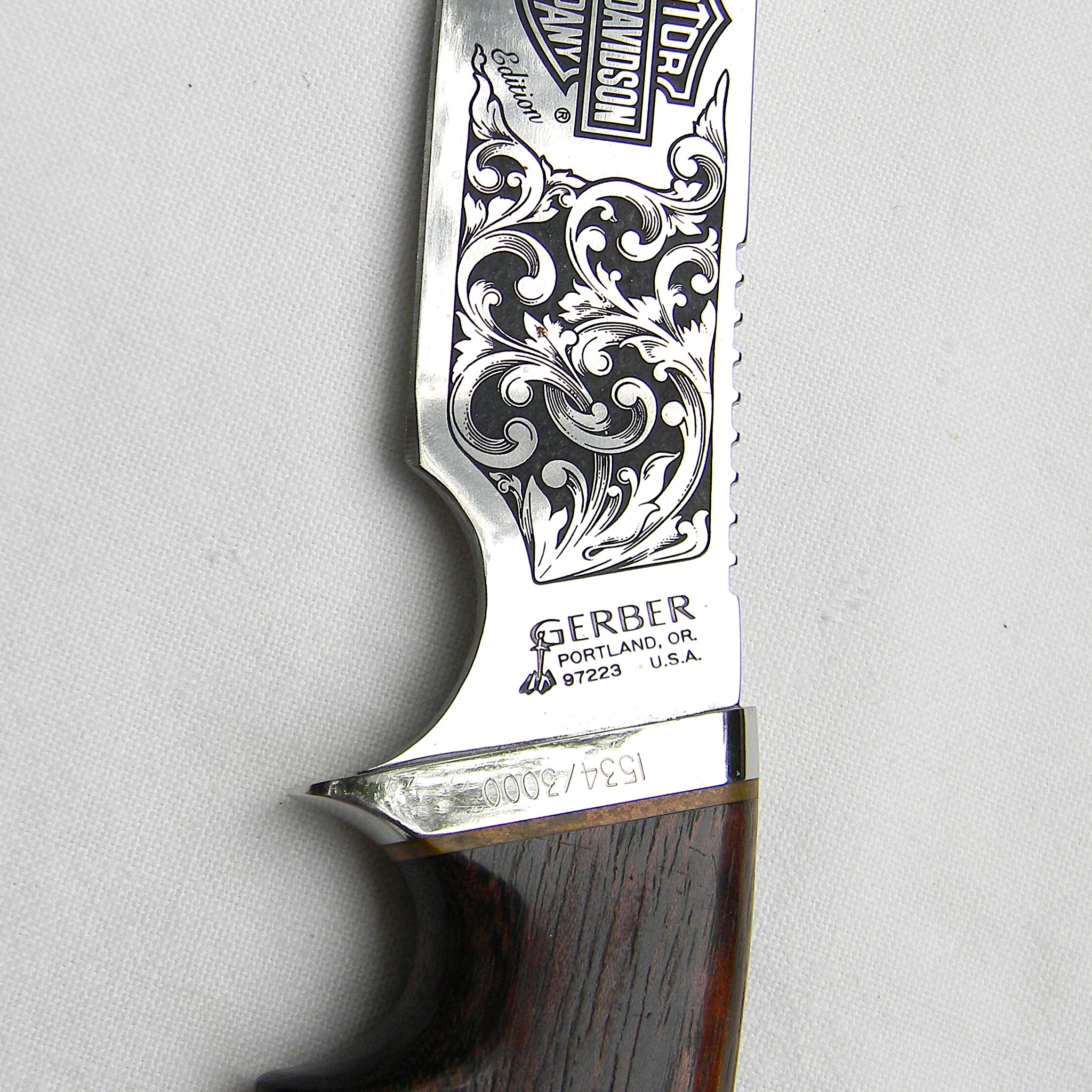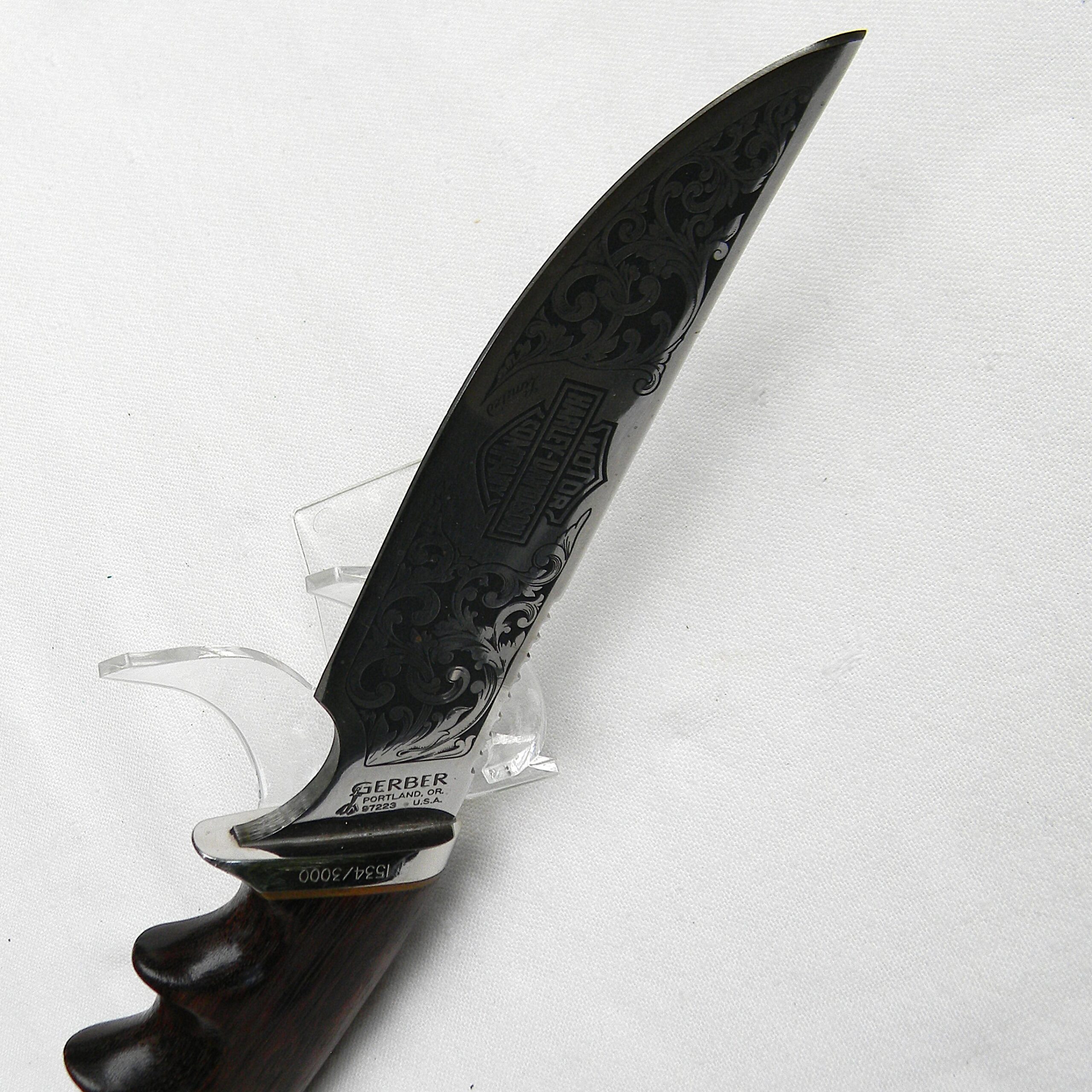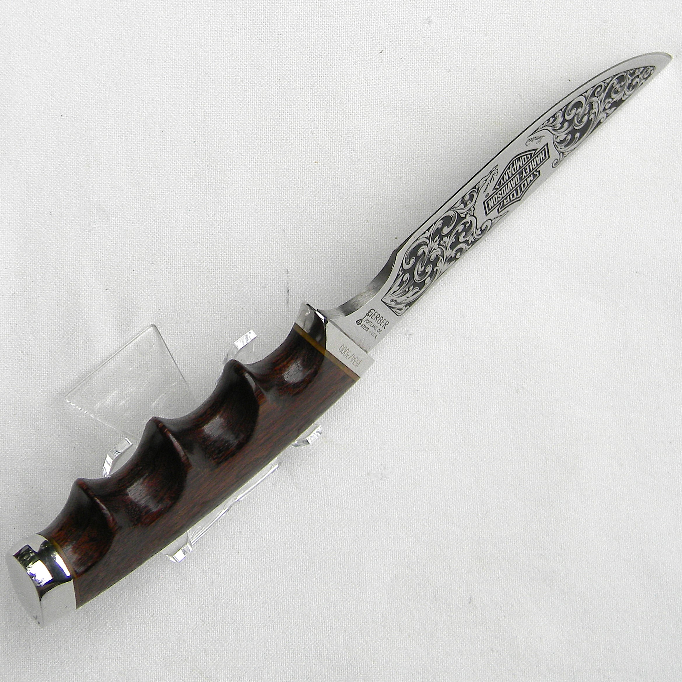 Gerber 525 Harley Davidson knife; 1981 limited edition, Aurum Etchings blade, African Zebrawood handle; SN 1534 of 3000; original hardwood presentation box; rare UNUSED.