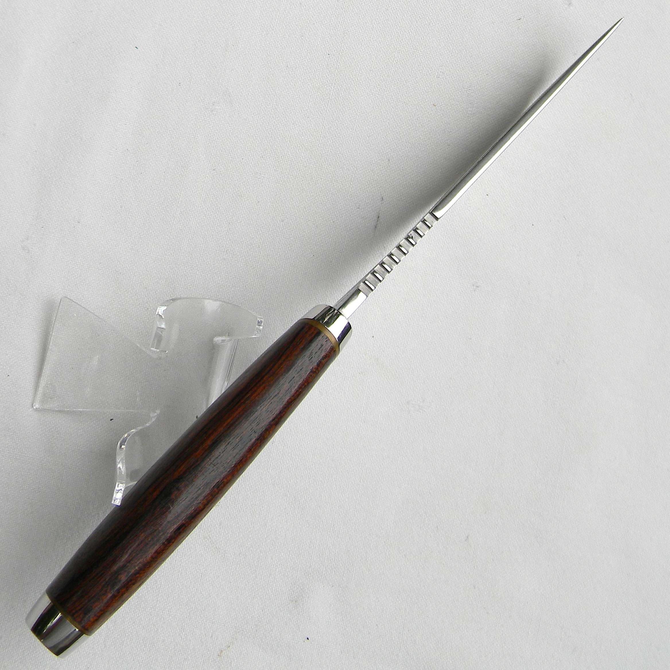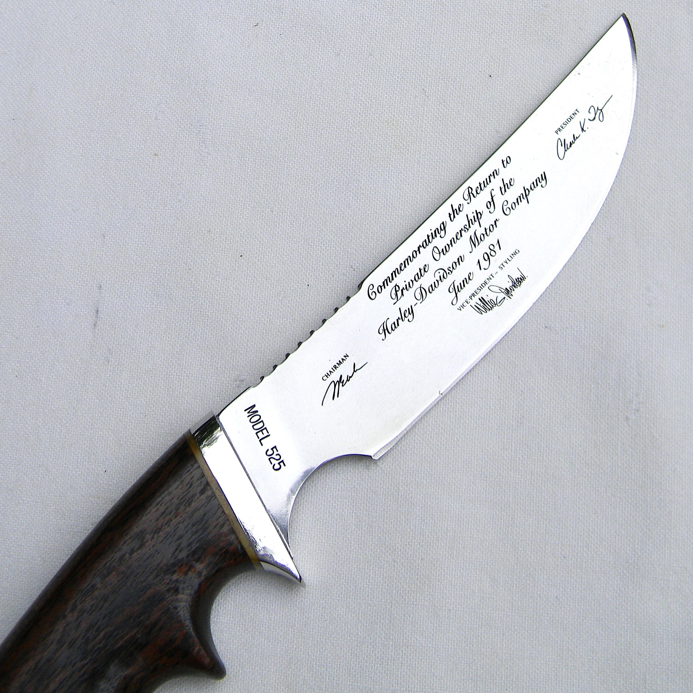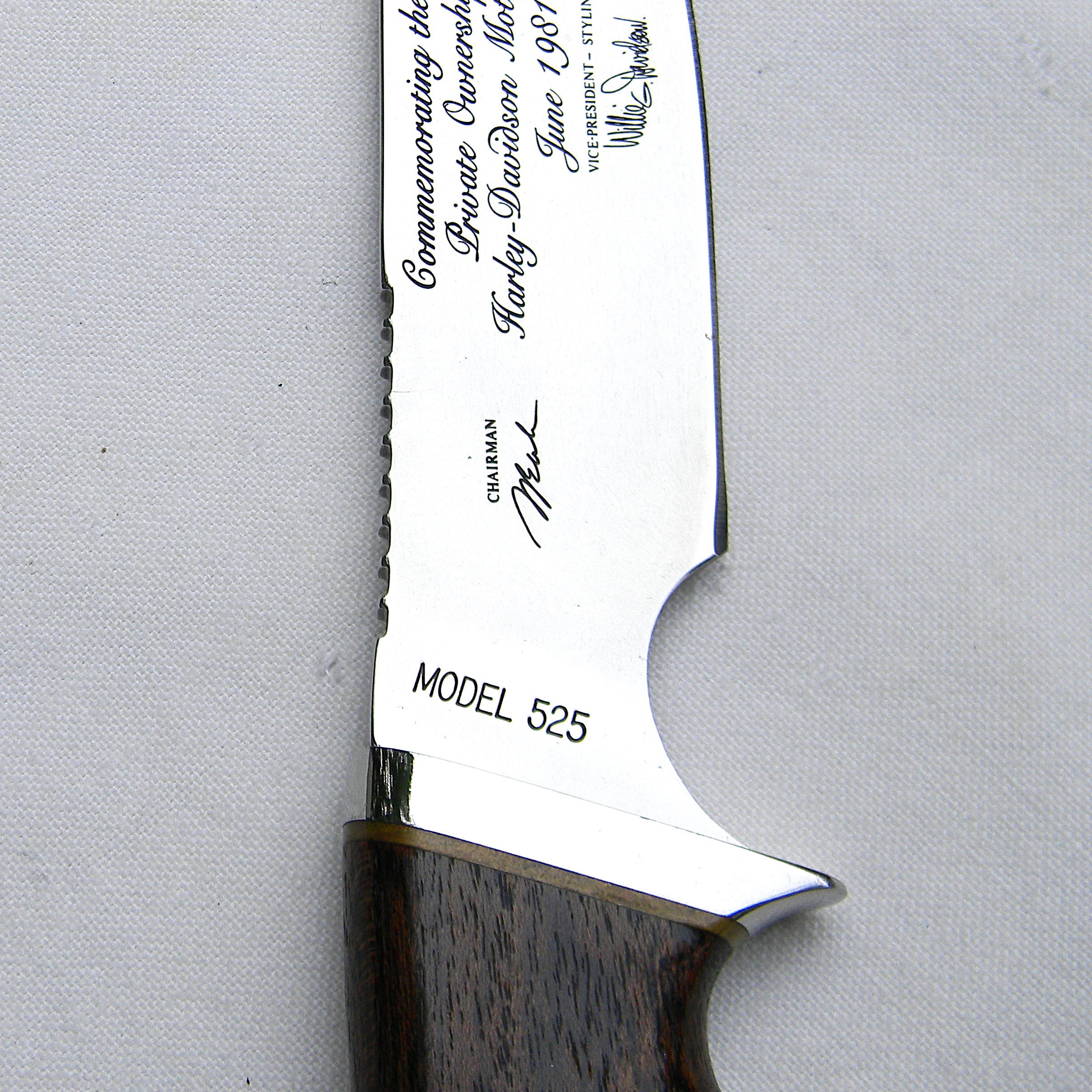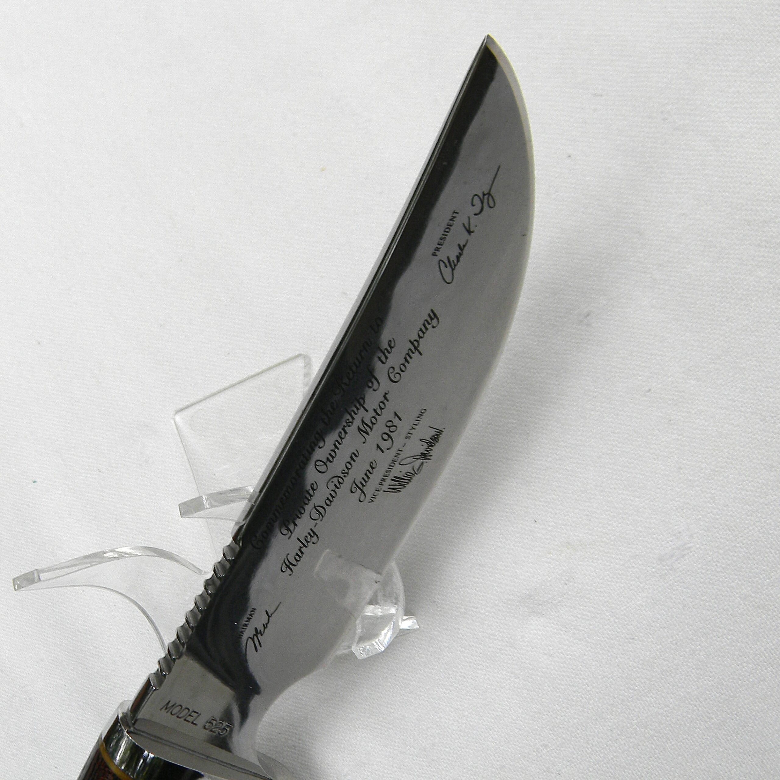 Gerber 525 Harley Davidson knife; 1981 limited edition, Aurum Etchings blade, African Zebrawood handle; SN 1534 of 3000; original hardwood presentation box; rare UNUSED.