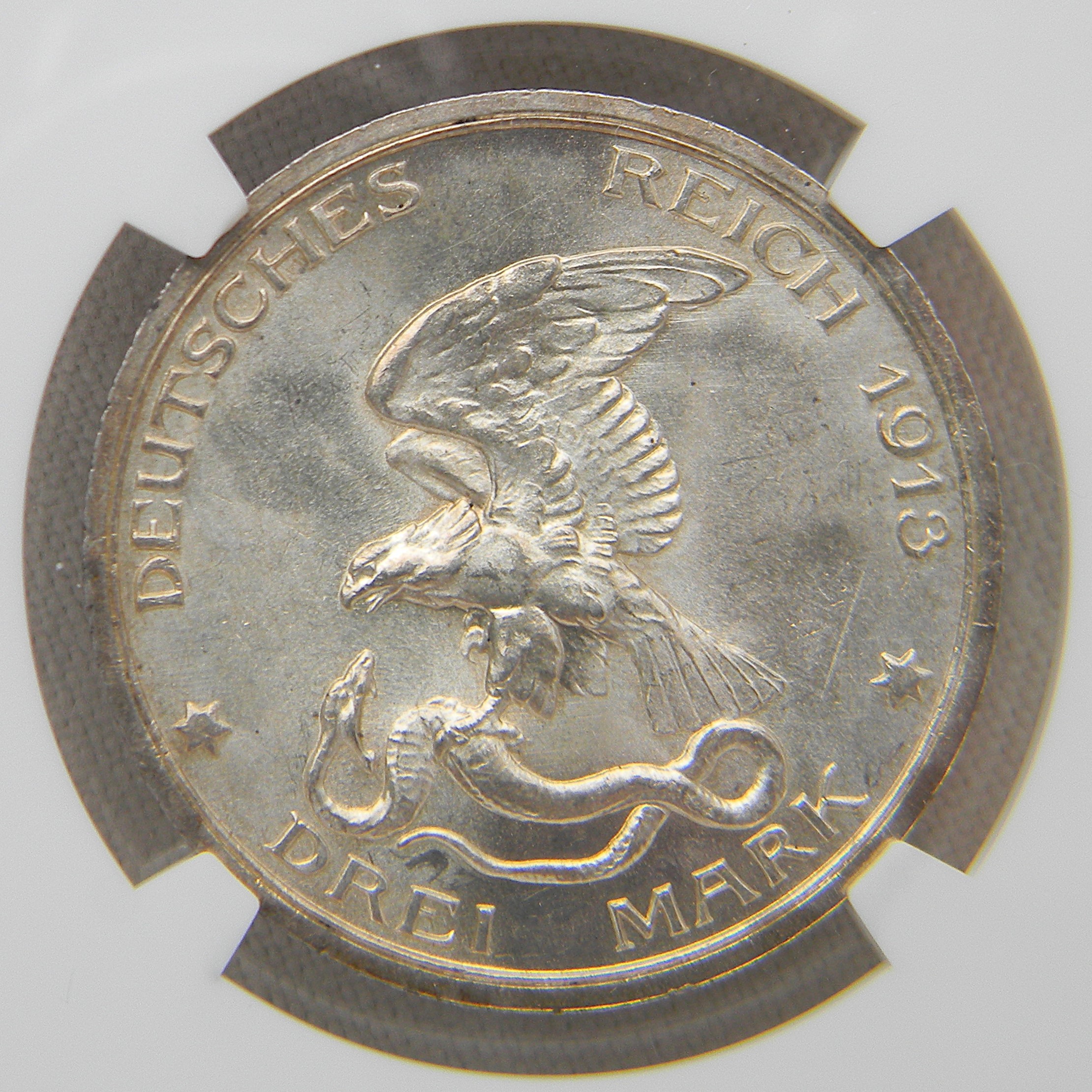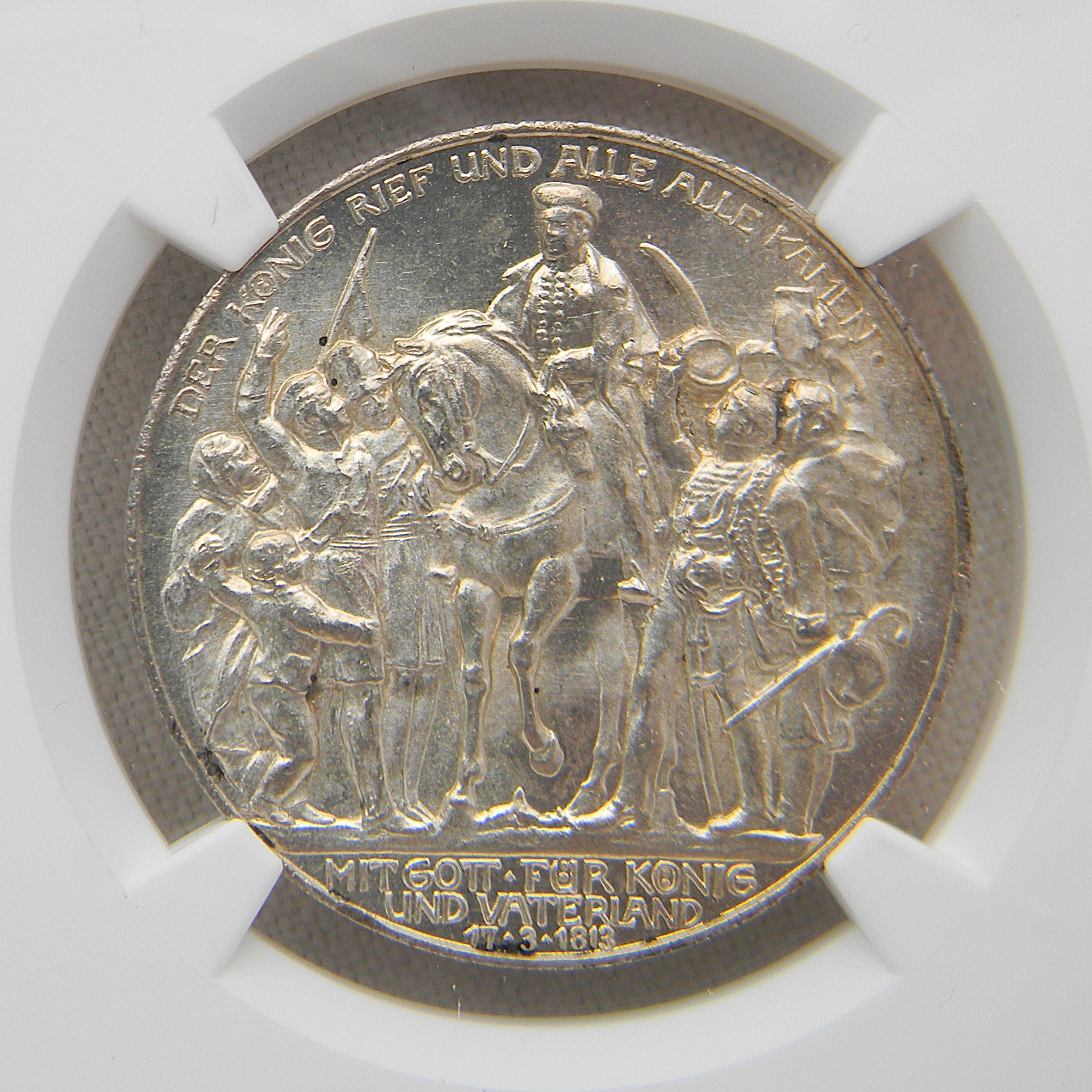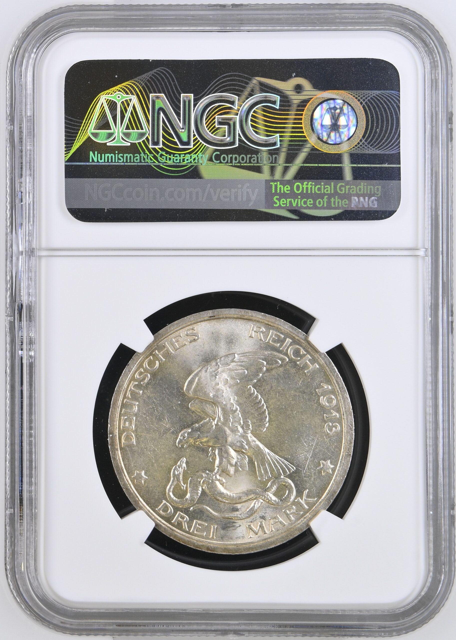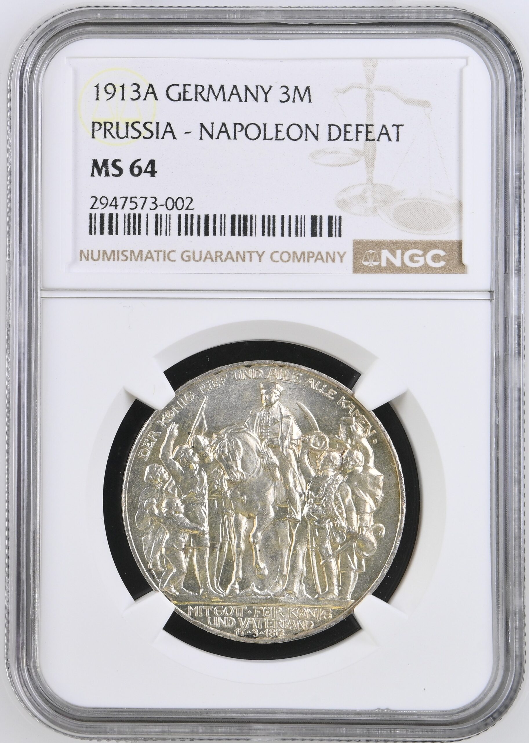 Germany 1913A Napoleon defeat silver 3 Mark Prussian commemorative issue; attractive NGC MS64 with original mint luster – this 1-year type is scarce this nice. FREE SHIPPING WITHIN THE U.S. FOR THIS ITEM.