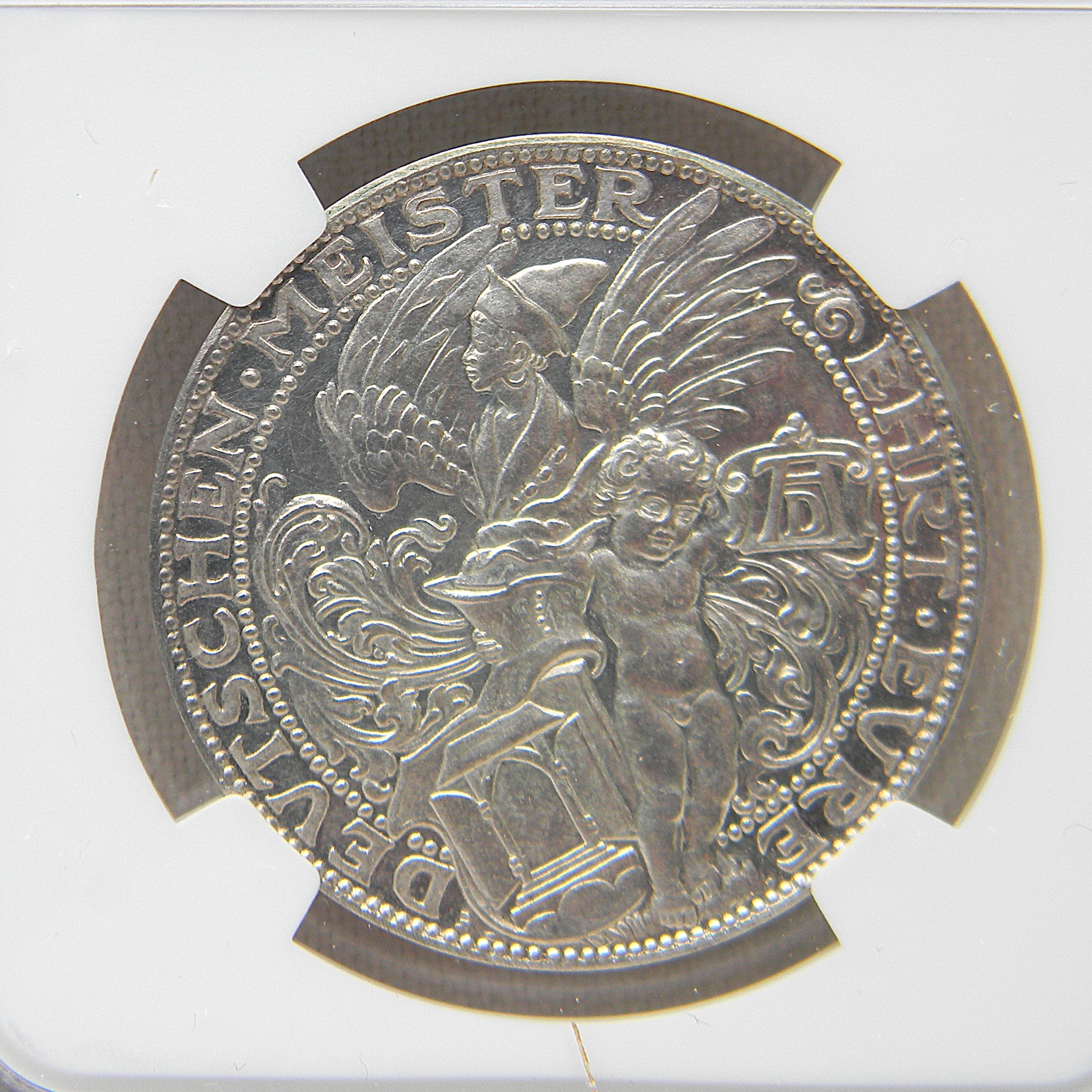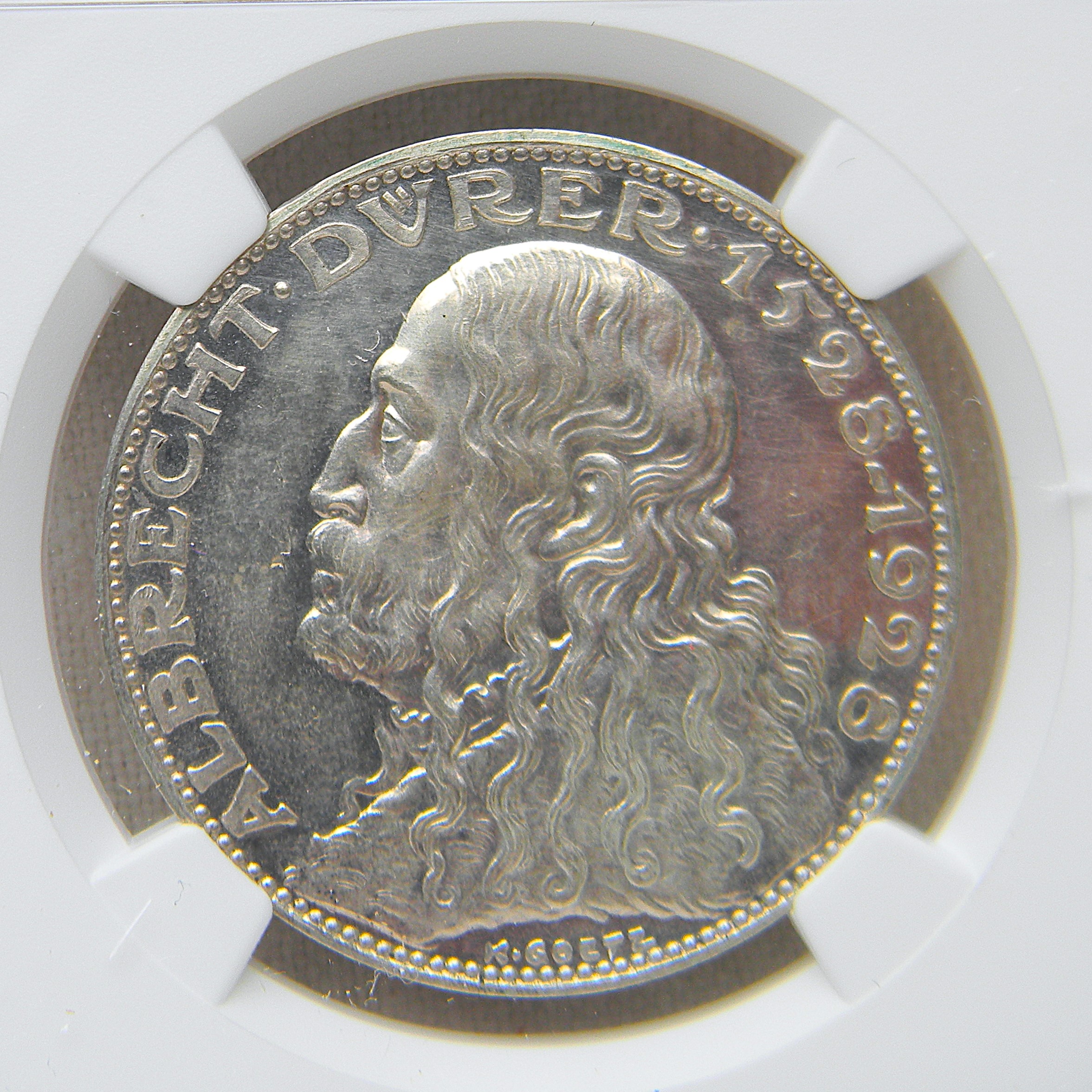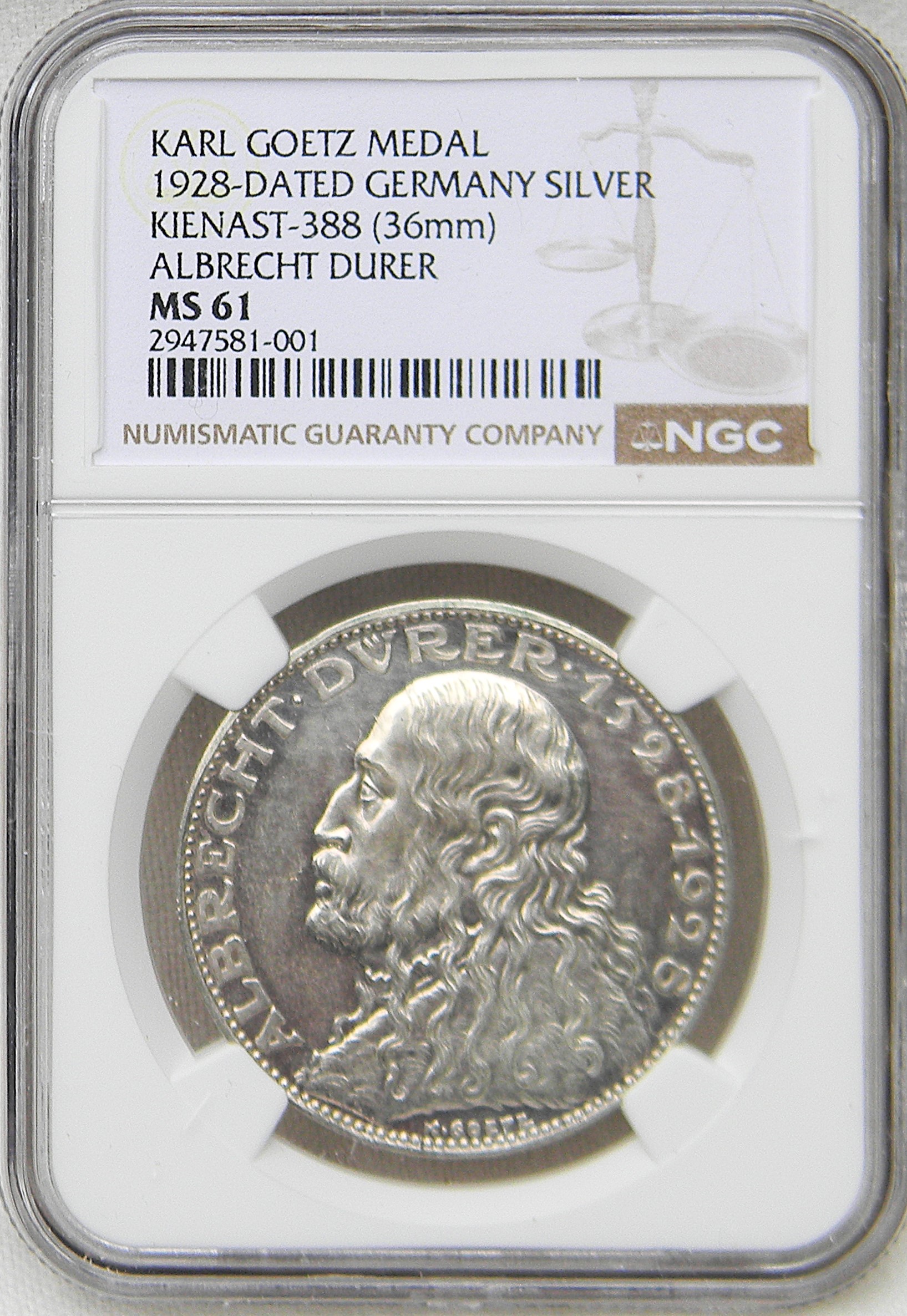 Karl Goetz Germany 1928 Albrecht Durer silver medal (K-388); 36.2 mm diameter; scarce type. Attractively toned specimen; NGC graded MS61 with original mint luster – rare this nice. FREE SHIPPING WITHIN THE U.S. FOR THIS ITEM.