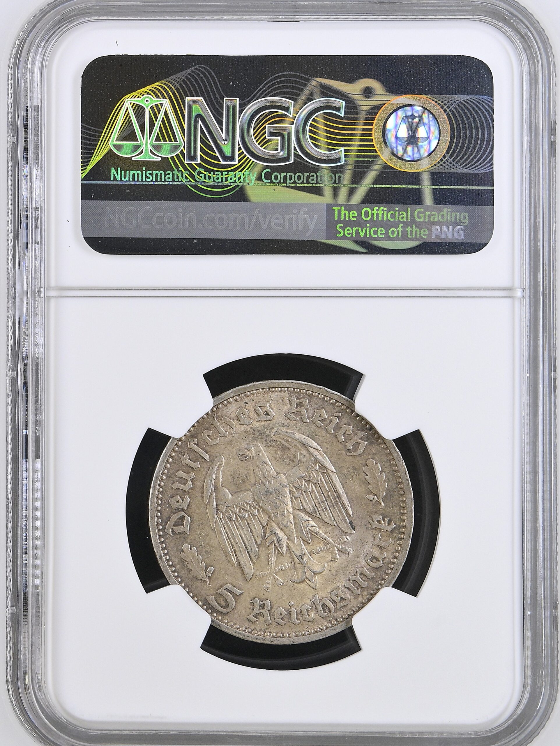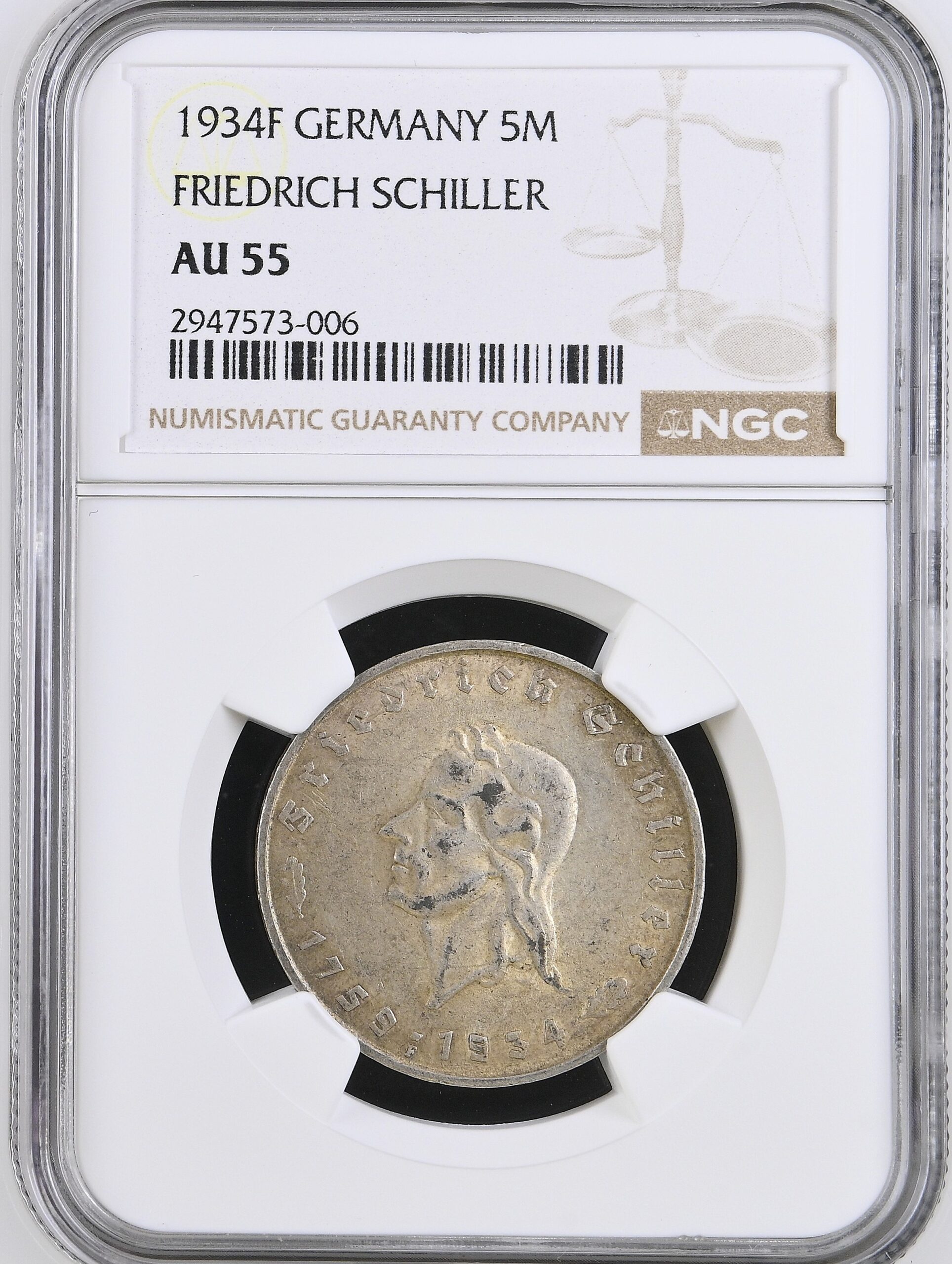 Germany 1934F Friedrich Schiller silver 5 Mark, scarce 1-year type commemorative issue, Stuttgart mint; attractive NGC AU55 with original light-gray patina. FREE SHIPPING WITHIN THE U.S. FOR THIS ITEM.