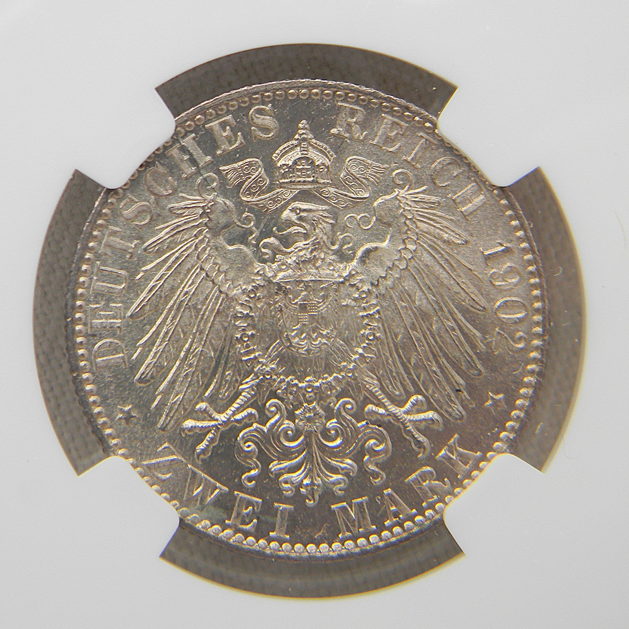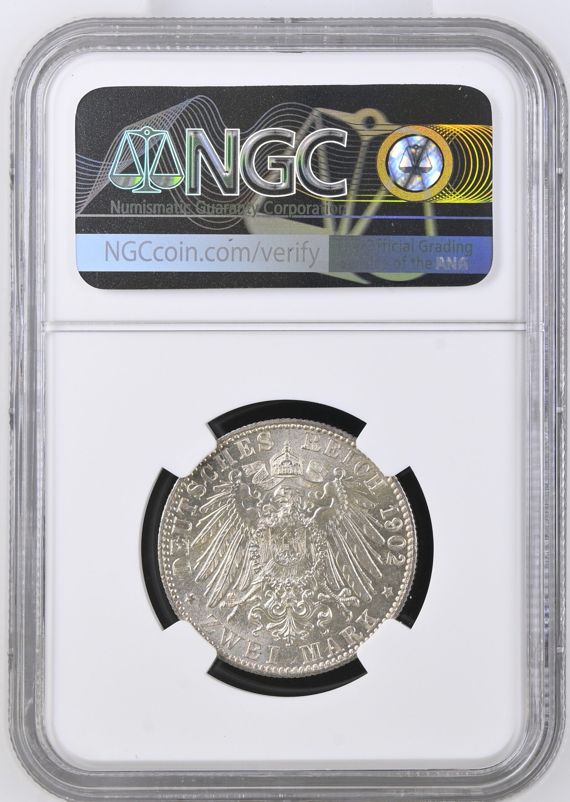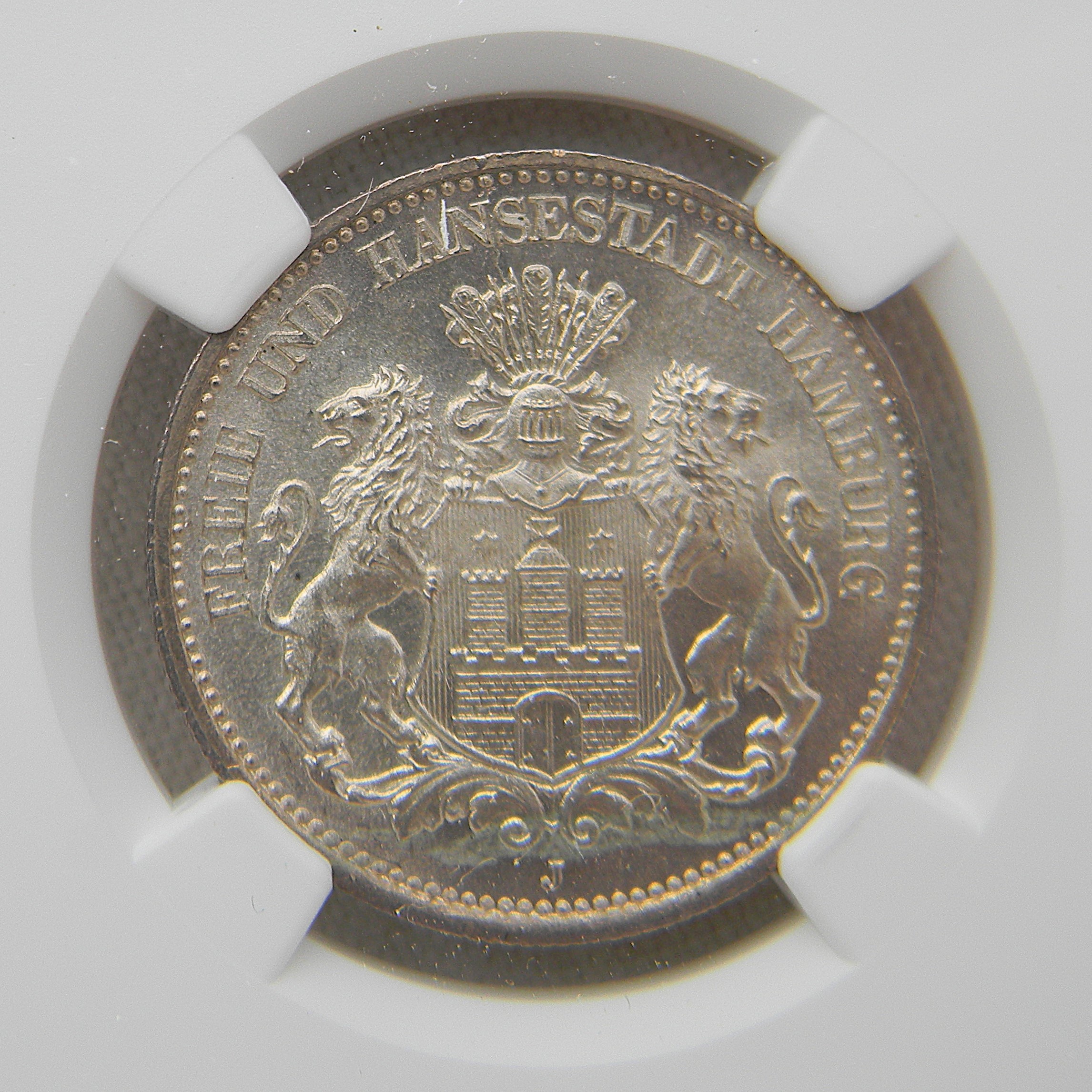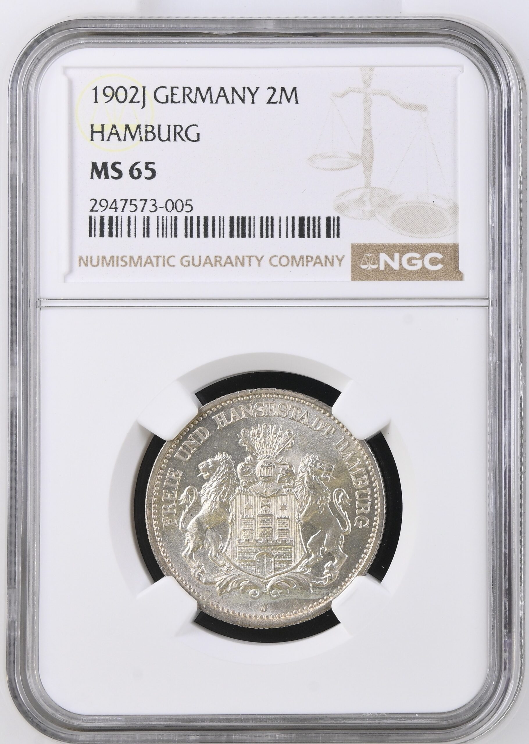 Germany Hamburg 1902J silver 2 Mark; very attractive specimen with original mint luster; NGC graded MS65 – this type is rare this nice. FREE SHIPPING WITHIN THE U.S. FOR THIS ITEM.