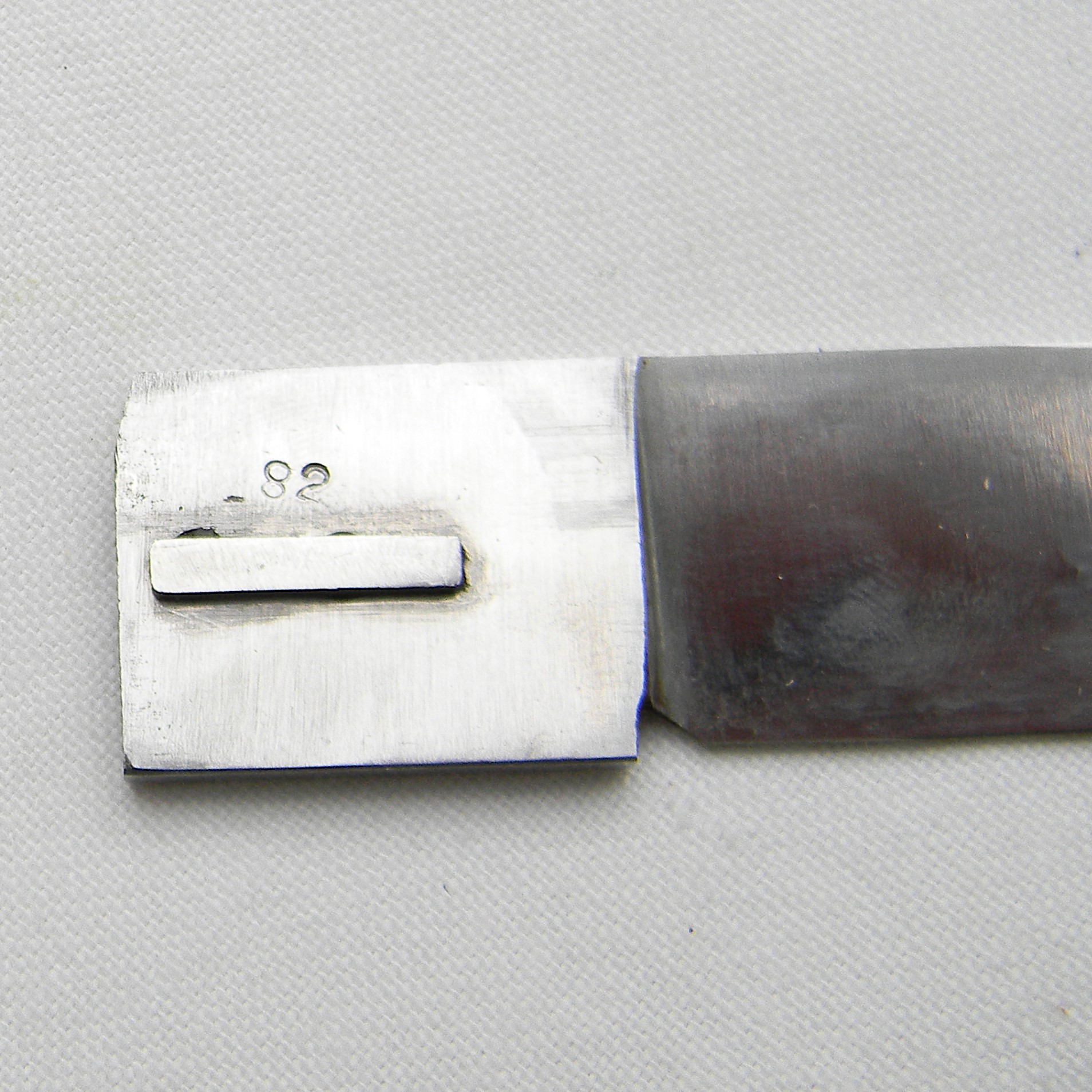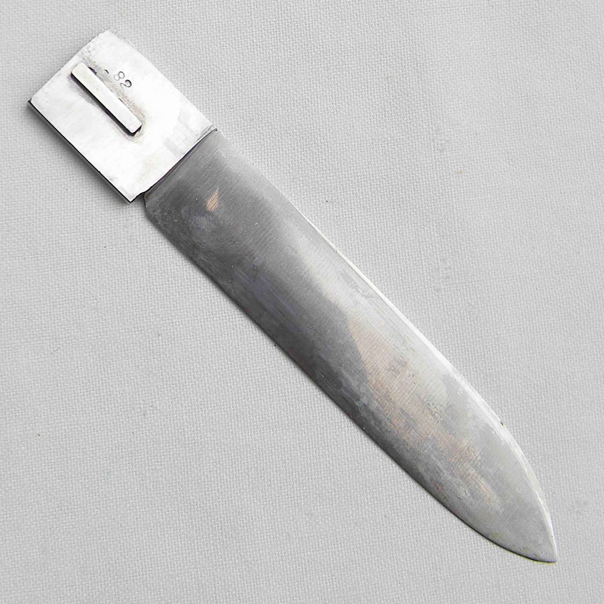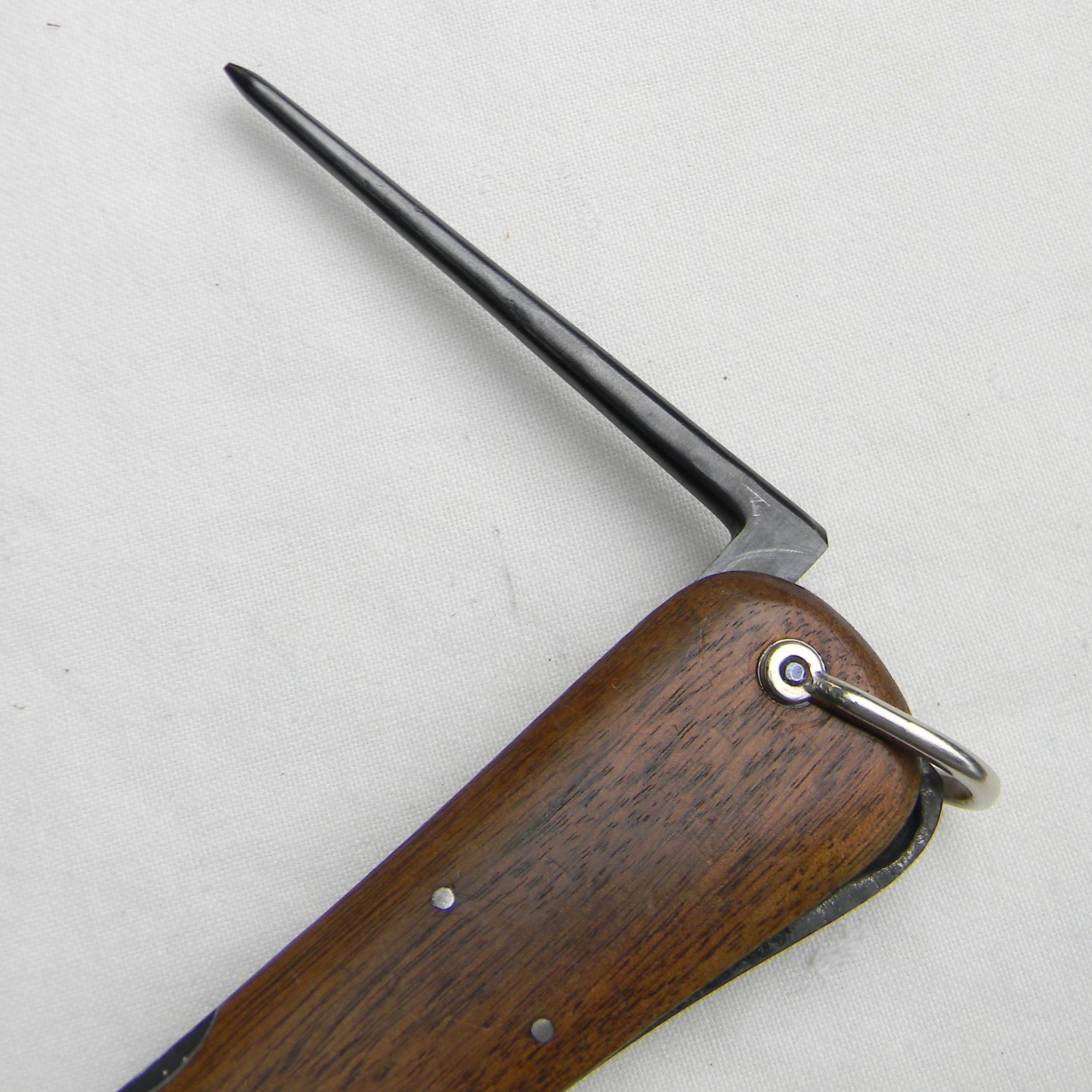 This is a scarce late-war SMF Model 2 specimen with mostly high-carbon steel (non-stainless) metal parts. This rare 1950th transitional model specimen has the logo-etched stainless blade which is once again marked ROSTFREI. These transitional blades were made for a very short period and are extremely hard-to-find because there weren’t many of them manufactured in the first place. This knife is about 6-1/8″ / 15.5 cm closed; 10-1/4 / 26 cm fully opened; the blade is about 4″ / 10.2 cm long. All metal parts except for the blade and shackle are blued with about 80 to 90% of the original bluing remaining. The blade has not been re-sharpened; original factory edge is very sharp; the tip is intact. The blade is nice and tight when its out, all parts are solid. This is a high-quality, very well-made specimen. Heavy-duty unmarked marlin spike is about 3-5/8” / 9.3 cm. The bolster, blade and the frame are are correctly stamped with matching production series number 82 – see photos attached.