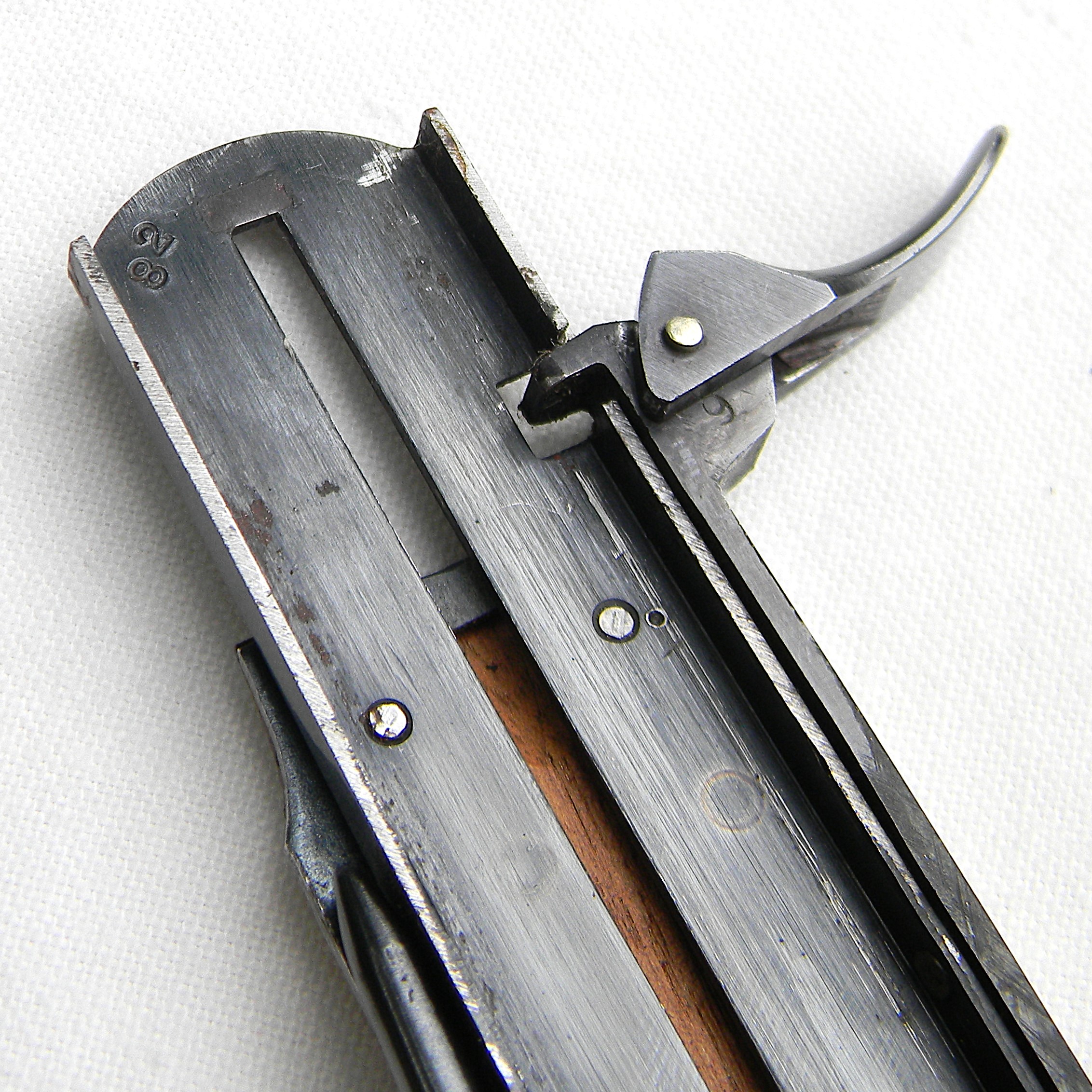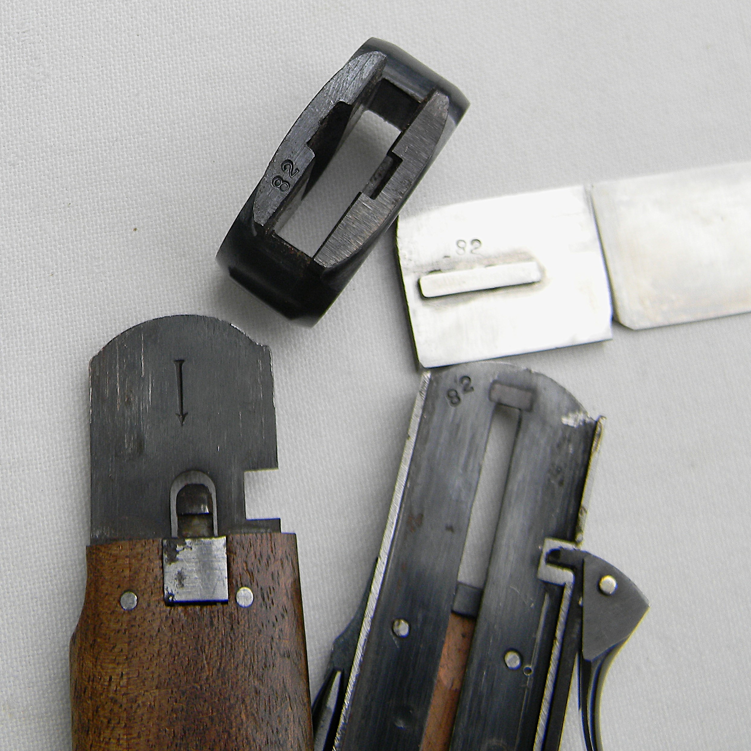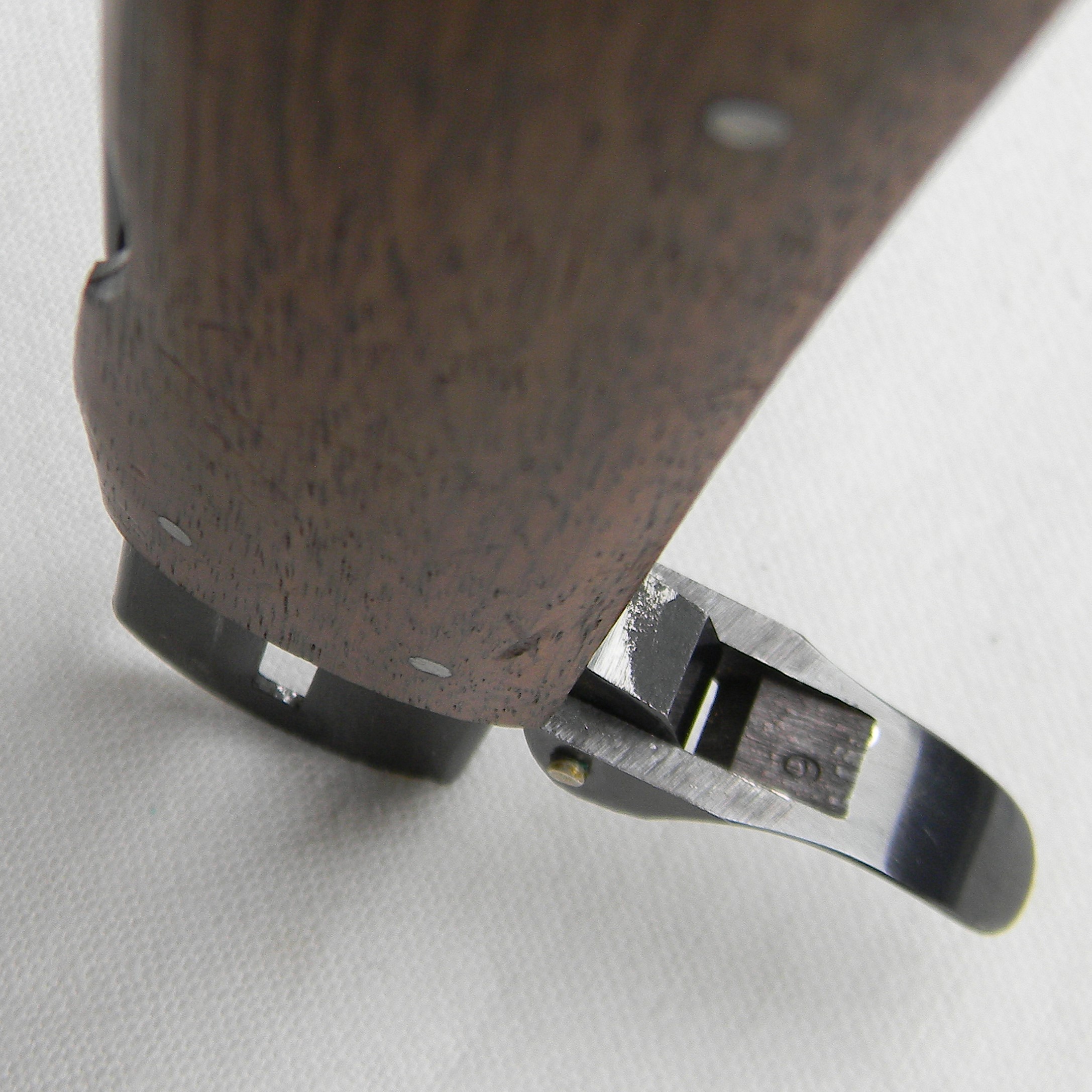 This is a scarce late-war SMF Model 2 specimen with mostly high-carbon steel (non-stainless) metal parts. This rare 1950th transitional model specimen has the logo-etched stainless blade which is once again marked ROSTFREI. These transitional blades were made for a very short period and are extremely hard-to-find because there weren’t many of them manufactured in the first place. This knife is about 6-1/8″ / 15.5 cm closed; 10-1/4 / 26 cm fully opened; the blade is about 4″ / 10.2 cm long. All metal parts except for the blade and shackle are blued with about 80 to 90% of the original bluing remaining. The blade has not been re-sharpened; original factory edge is very sharp; the tip is intact. The blade is nice and tight when its out, all parts are solid. This is a high-quality, very well-made specimen. Heavy-duty unmarked marlin spike is about 3-5/8” / 9.3 cm. The bolster, blade and the frame are are correctly stamped with matching production series number 82 – see photos attached.
