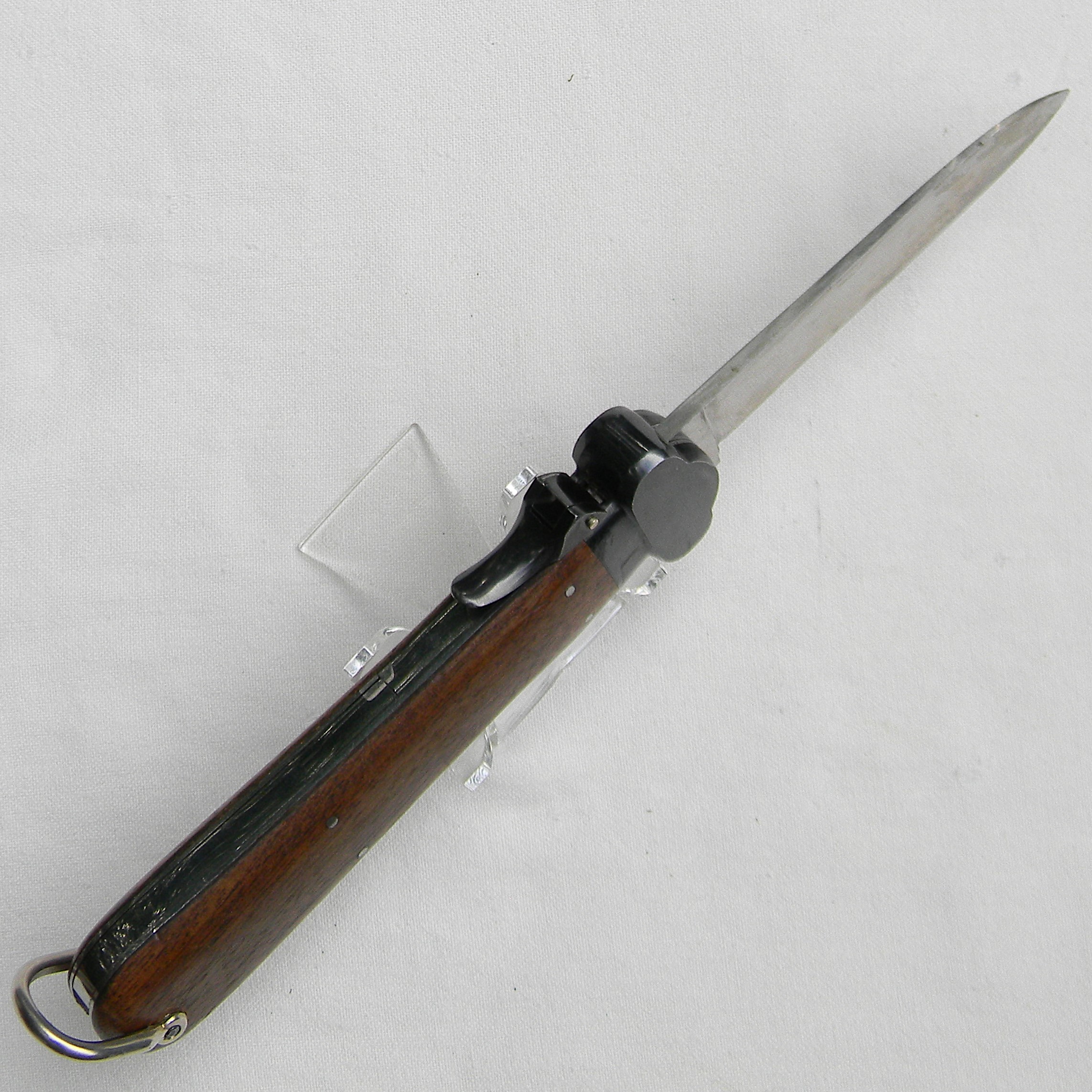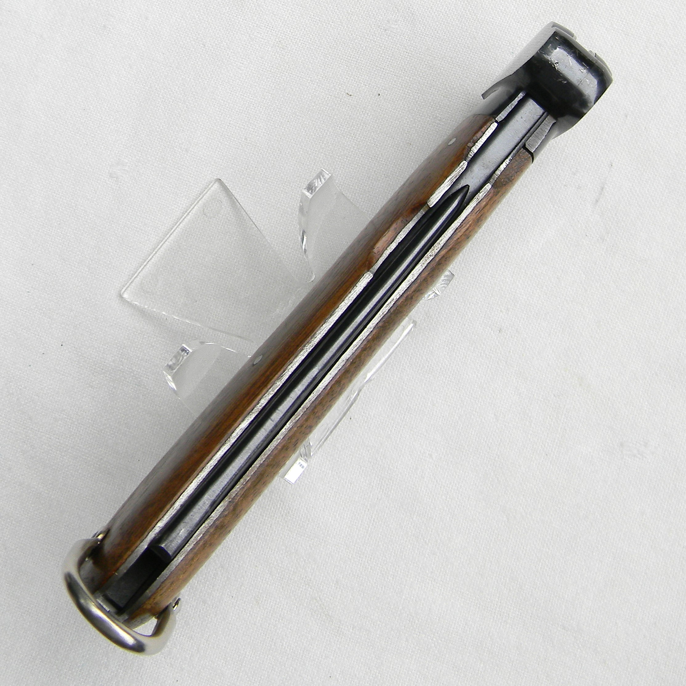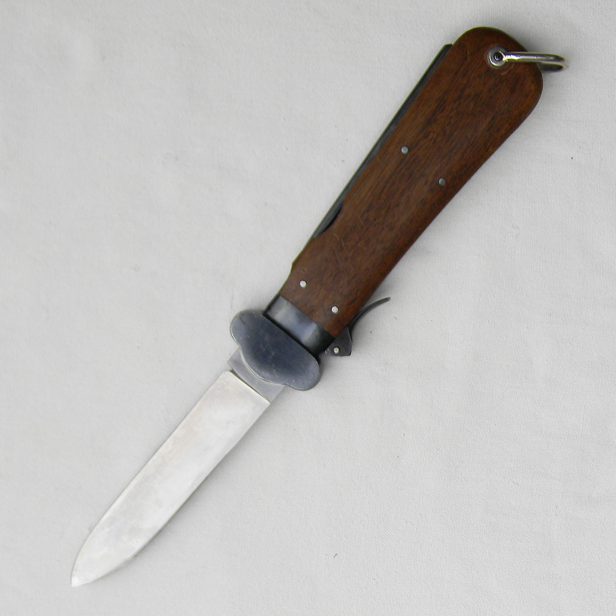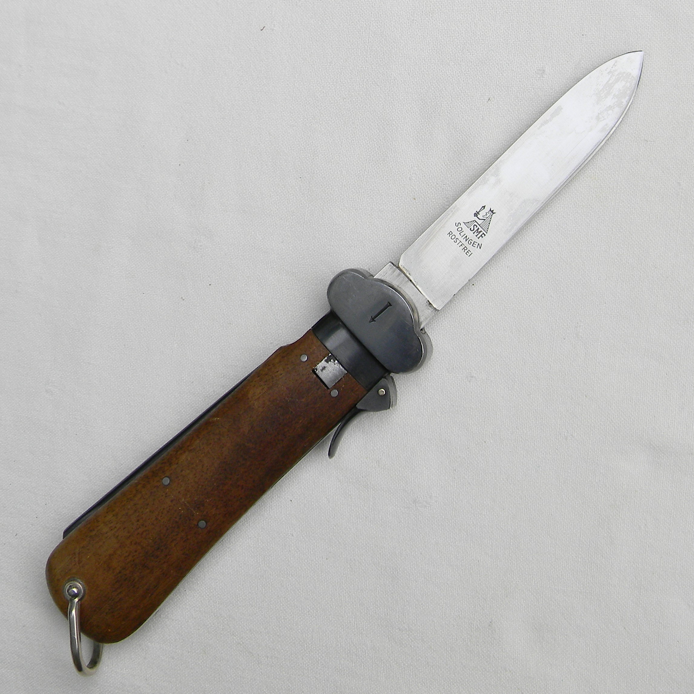 Original hardwood handle scales with 4 steel pins and the D-ring shackle on the pommel. Wood handle scales are in great overall condition, considering the age – no cracks or chips; just a couple of light contact marks. All springs are nice and tight; the spike holds well, all original parts are intact – this rare Cold War era Germany SMF Model 2 paratrooper knife is rare this nice. Today most of the surviving German Fallschirmjäger-Messer paratrooper knives are in private collections & rarely come up for sale; don’t miss your chance to add this rare post-WW2 transitional Germany SMF Model 2 paratrooper knife to your collection! Please check out our Collectable Blades and Militaria sections for a variety of custom-made and various WW1 and WW2 combat knives.