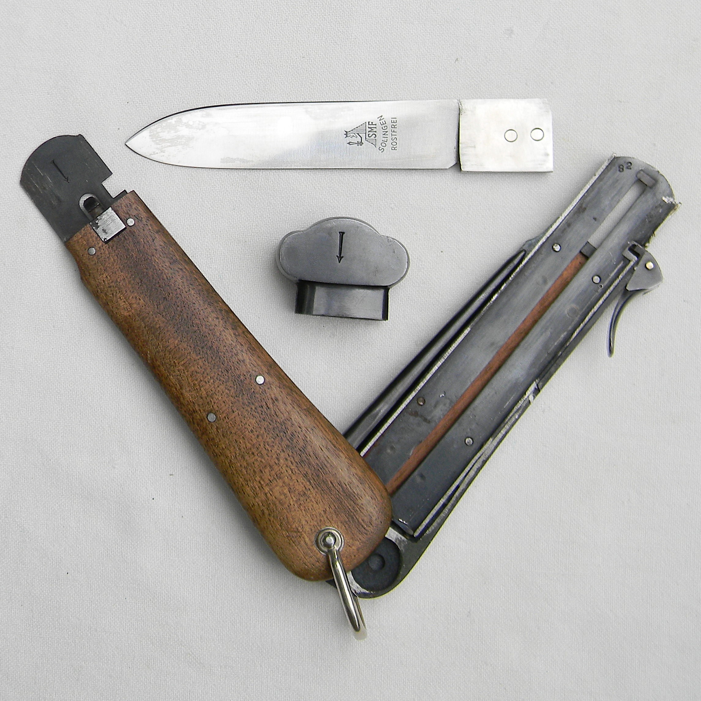 Scarce early post-WW2 gravity knife for the newly-reestablished German Bundeswehr units “Fallschirmjäger Messer” paratrooper knife in rare unused condition – all original springs are intact, original blade; the knife is 100% working order. Manufactured by SMF (Solinger Metalwaffen Fabrik) in Solingen, Germany in the early 1950th. This exact type is illustrated on pages 59-60 of the excellent German reference book Luftwaffe Gravity Knife: Weapon, Tool, Tradition by Jan Peter Bruning (see the book’s scans attached). These large Fallschirmjäger-Messer knives are scarce in the original condition nowadays, but the early Cold War era Model 2 SMF knives are nearly impossible to find. See the dedicated German gravity knives page, courtesy of Wikipedia. Also, I have a rare unused early-war SMF Model 1 non-takedown Fallschirmjäger-Messer made from high-quality stainless steel available for sale; please take a look.
