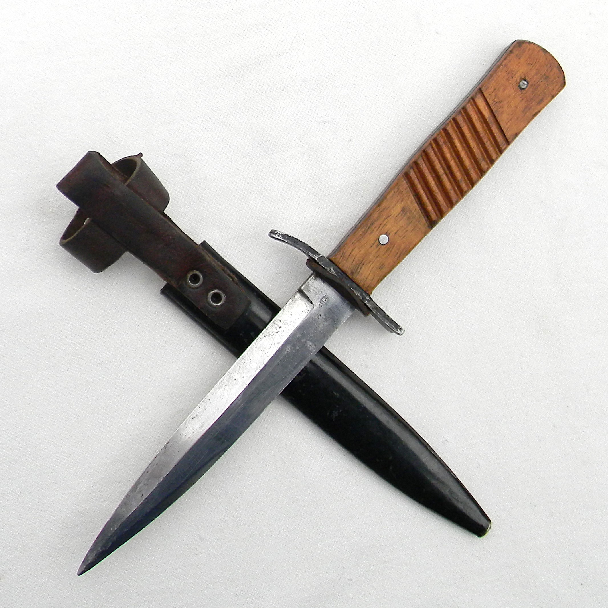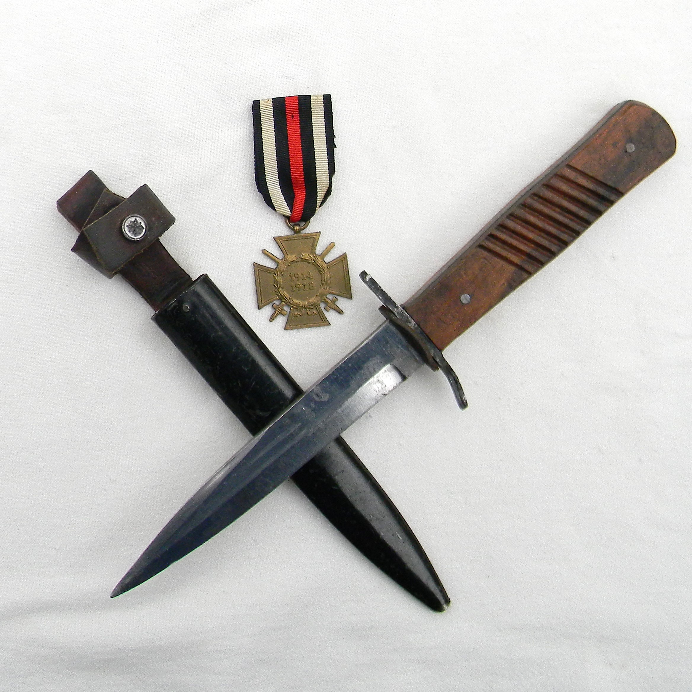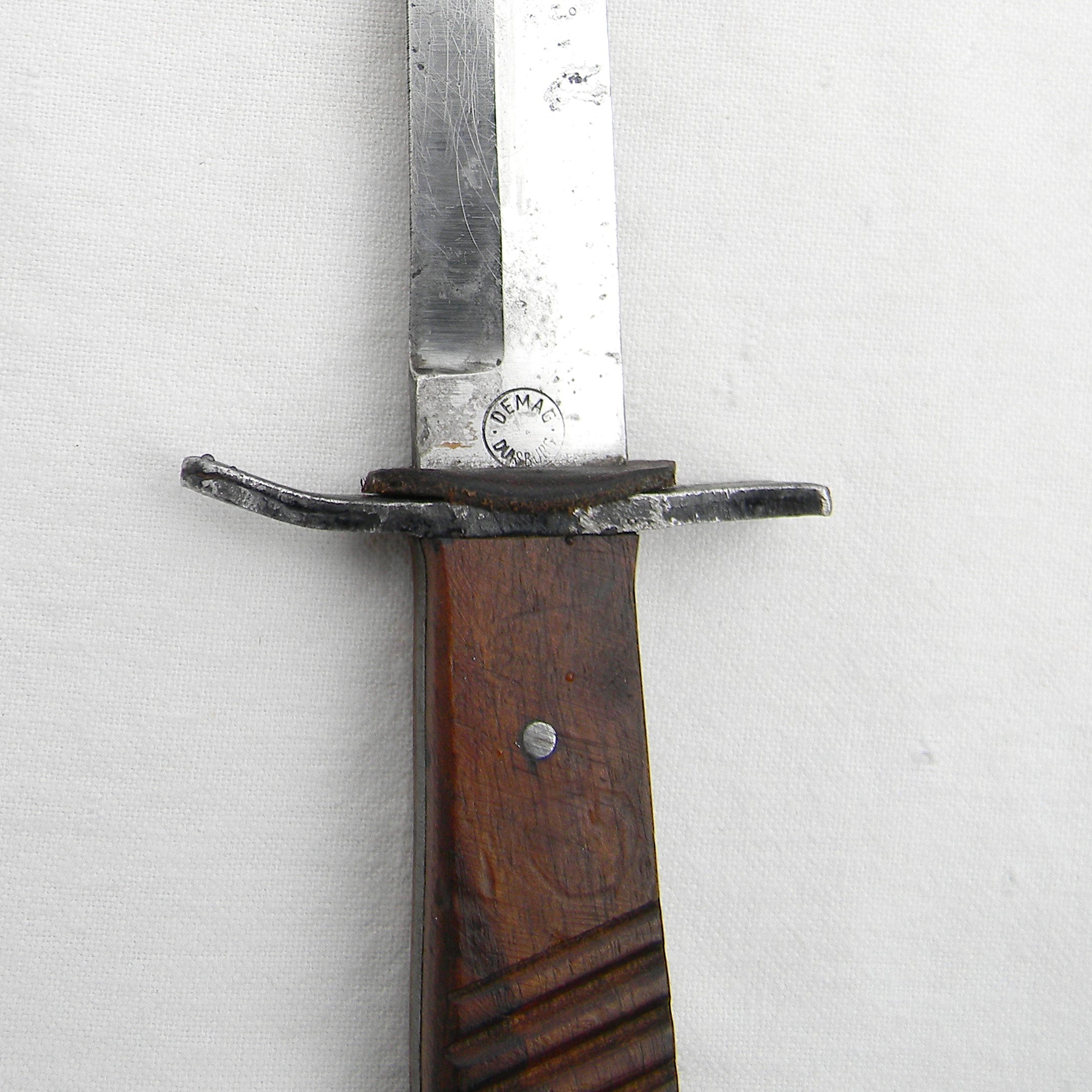 Sturdy full-tang construction trench knife with wood handle scales, “rifle muzzle fit” iron guard, and original metal scabbard. During WW1 DEMAG was manufacturing the “crank handle” bayonet/fighting knife combination as well; the guards intended for bayonets were used where they could be to simplify the wear-time production and reduce the use of valuable steel.