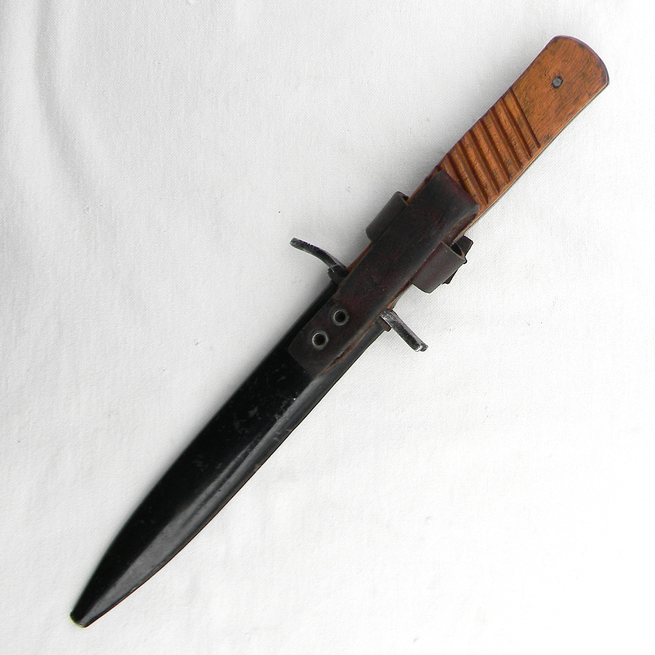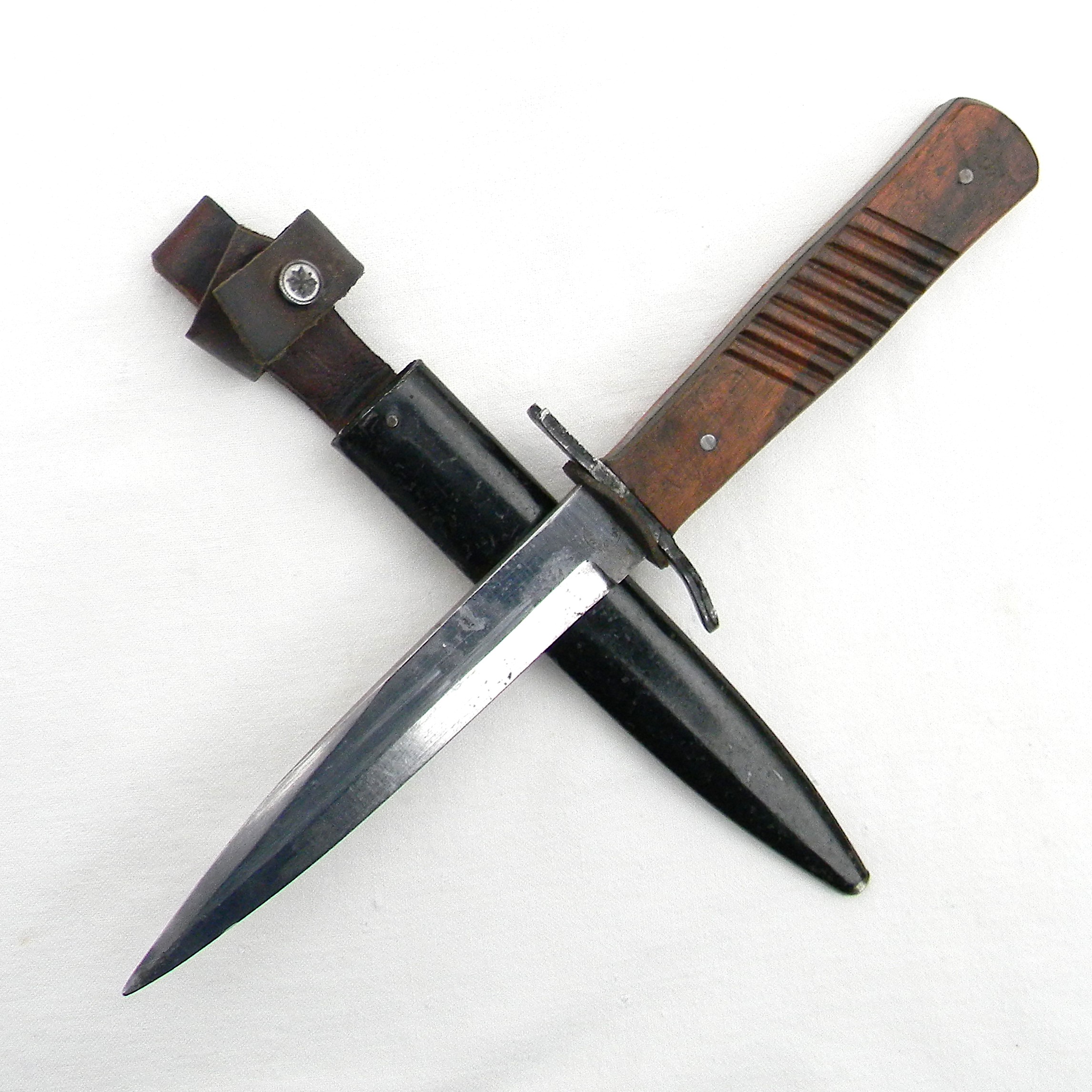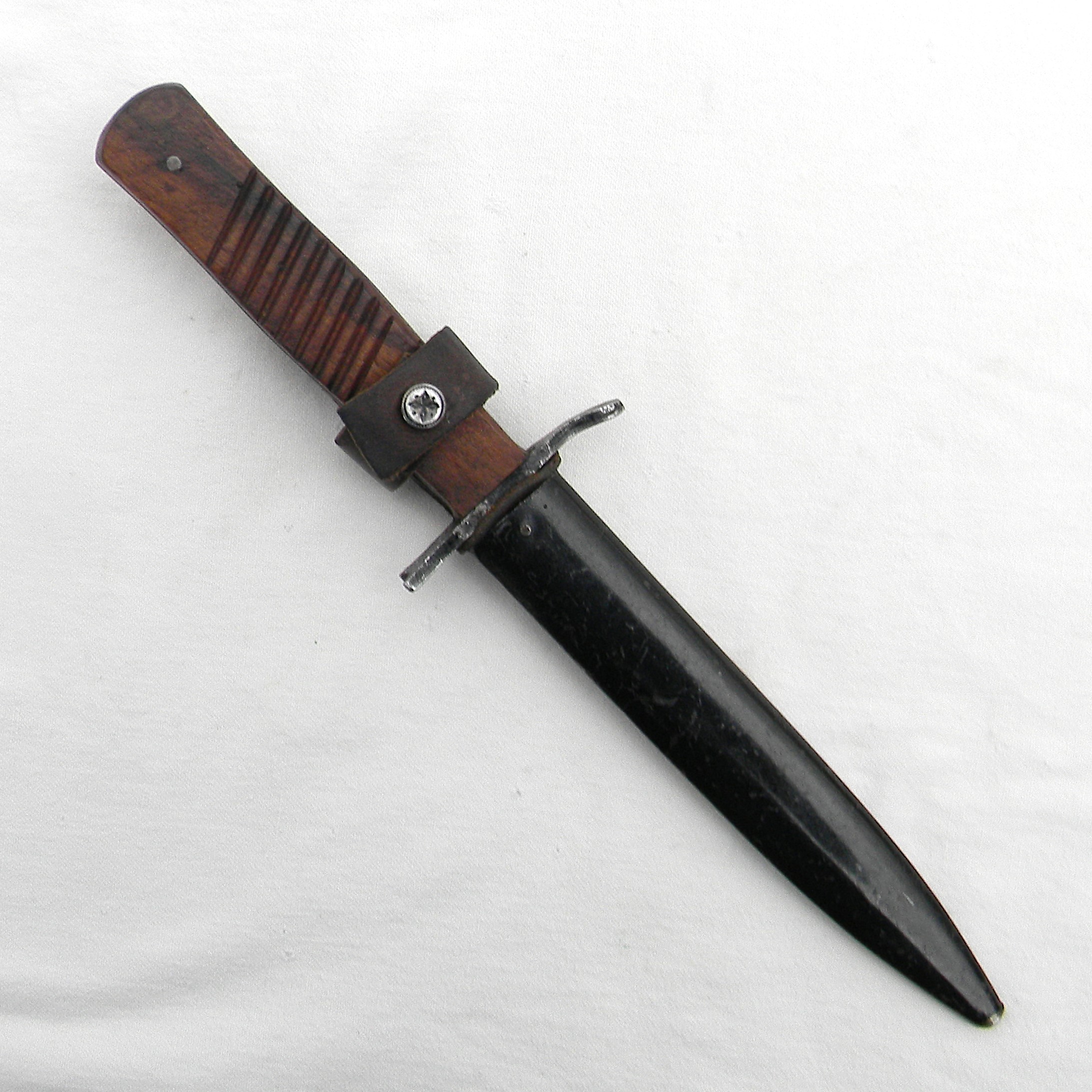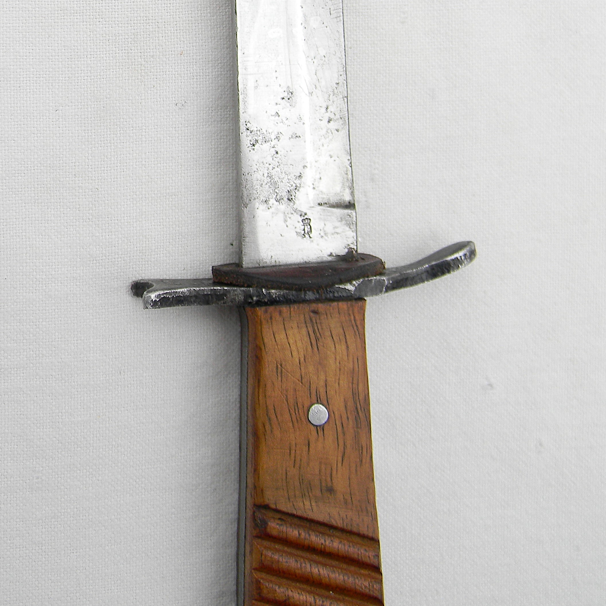 Sturdy full-tang construction trench knife with wood handle scales, “rifle muzzle fit” iron guard, and original metal scabbard. During WW1 DEMAG was manufacturing the “crank handle” bayonet/fighting knife combination as well; the guards intended for bayonets were used where they could be to simplify the wear-time production and reduce the use of valuable steel.