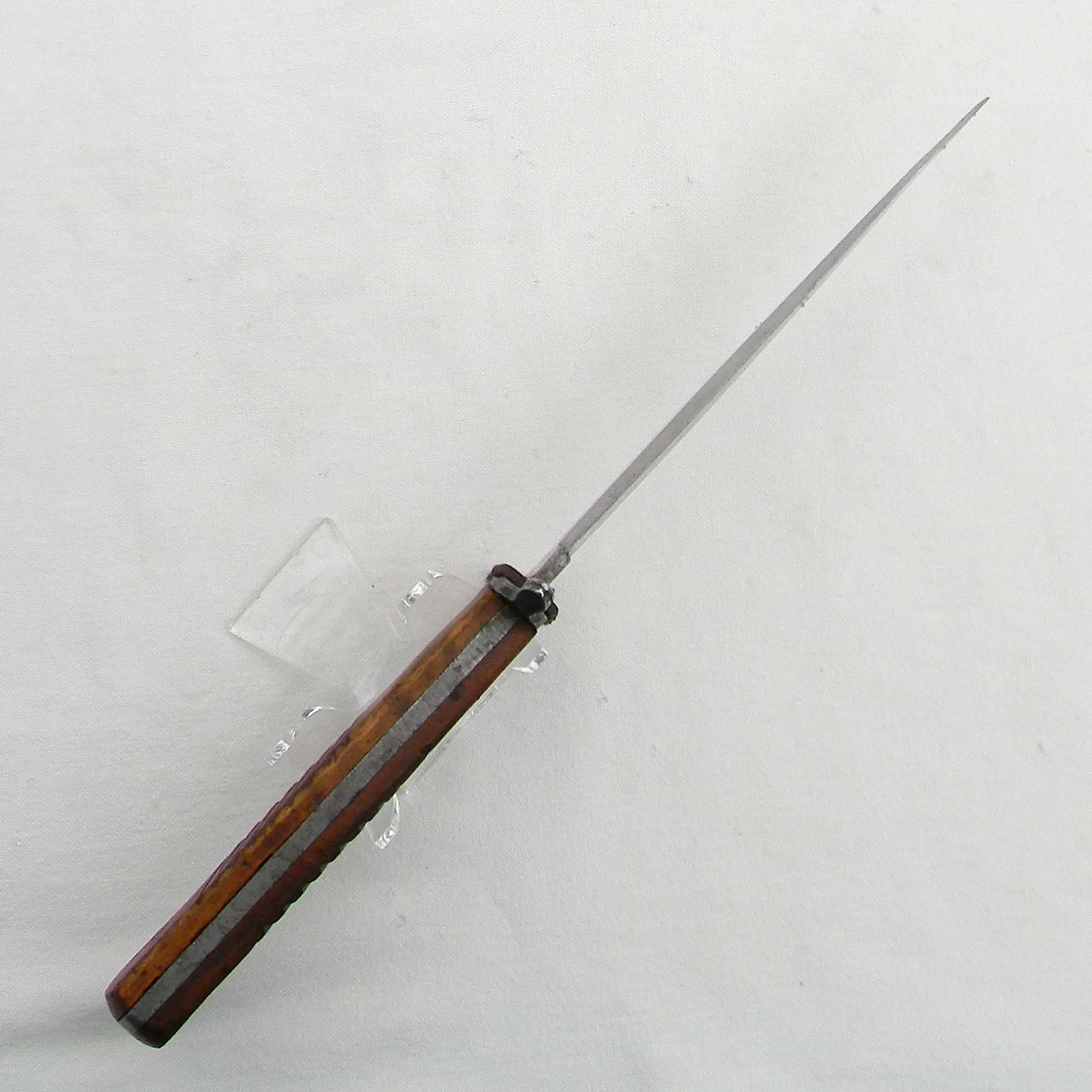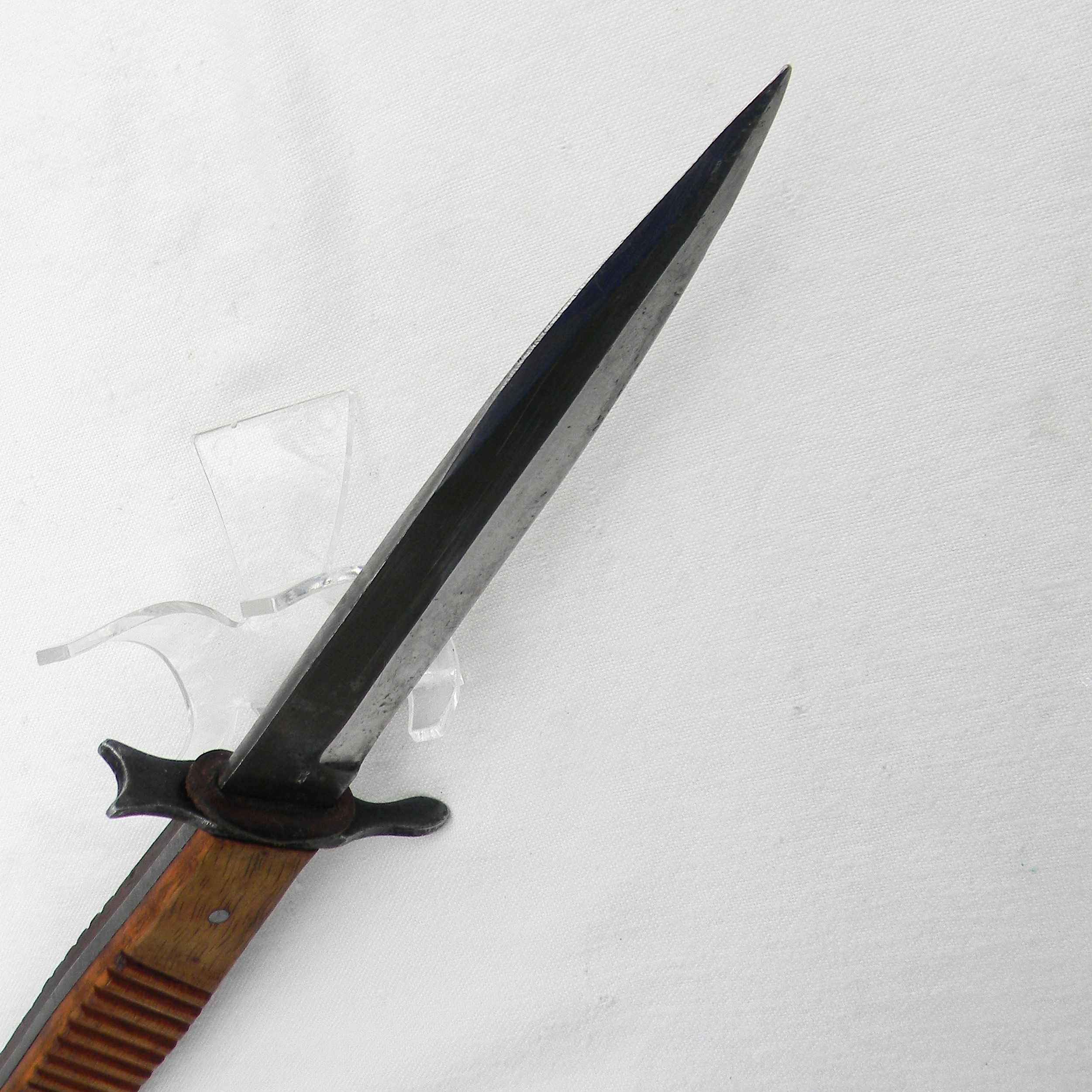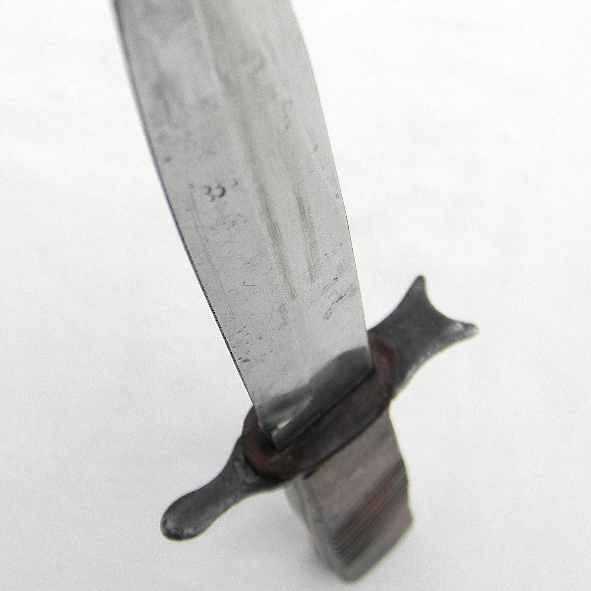 This dagger is about 11” / 28 cm overall; the blade is about 6” / 15.2 cm. Ricasso is stamped DEMAG / DUISBURG on one side, a small imperial crown – a “fraktur” inspector’s acceptance mark on the other. This fighting knife is in excellent condition for the type – no pitting, dings or edge nicks; original leather washer on the blade is still on. The blade has been very gently re-sharpened, the edge is very sharp still; the very end of the tip is slightly bent. Original hardwood handle scales and iron “rifle muzzle fit” guard are nice and tight; original leather washer is intact. All parts are tight with no play. Original metal scabbard is in excellent condition as well – all original parts are intact; about 95% of the original black finish is remaining. The keeper is intact; the leather is soft and supple still; this scabbard is in fantastic overall condition, considering the age.