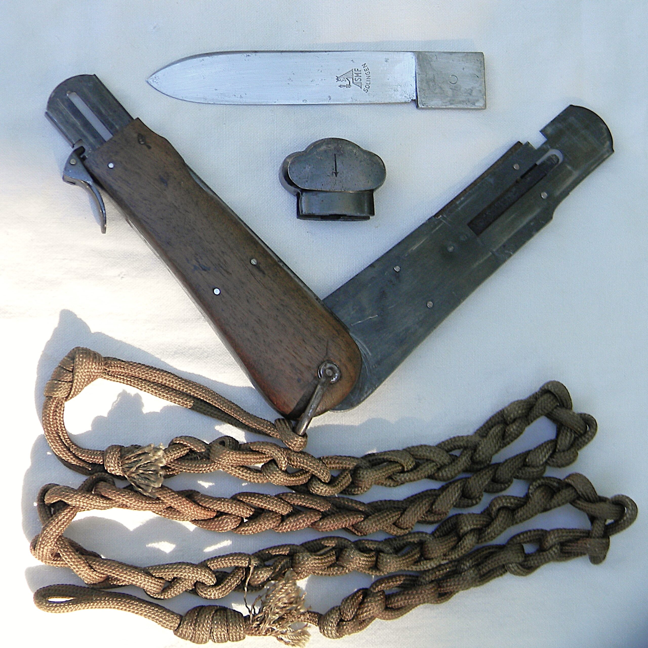 Scarce late WW2 era German airborne units “Fallschirmjäger Messer” paratrooper knife in great overall condition – all original springs are intact, original blade; the knife is only slightly used; it is still in very much working order with green para cord lanyard still attached. Manufactured by SMF (Solinger Metalwaffen Fabrik) in Solingen, Germany. This exact type, as well as earlier non-takedown Model 1 types are illustrated on pages 239-242 the excellent French reference book Knives and Daggers-Bayonets Used by the German Army During 1914-1945 by Christian Mary (see the book’s scans attached). These large Fallschirmjäger-Messer knives are scarce in the original condition nowadays, but the transitional late-war Model 2 knives are nearly impossible to find. See the dedicated German gravity knives page, courtesy of Wikipedia. Also, I have a rare unused early-war SMF Model 1 non-takedown Fallschirmjäger-Messer made from high-quality stainless steel available for sale; please take a look.