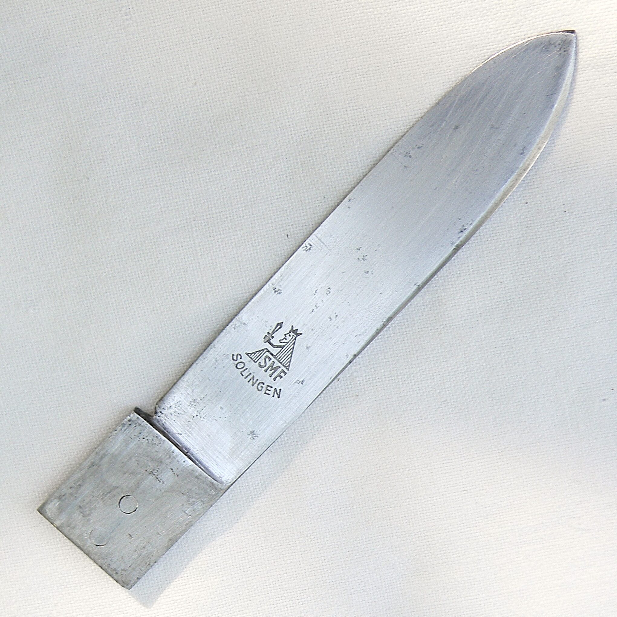 Germany WW2 SMF Model 2 paratrooper knife, rare transitional type with logo-etched non-stainless blade. Hard-to-find late war Fallschirmjäger-Messer gravity knife in excellent overall condition, considering the age. FREE EXPEDITED SHIPPING WITHIN THE U.S. FOR THIS ITEM.
