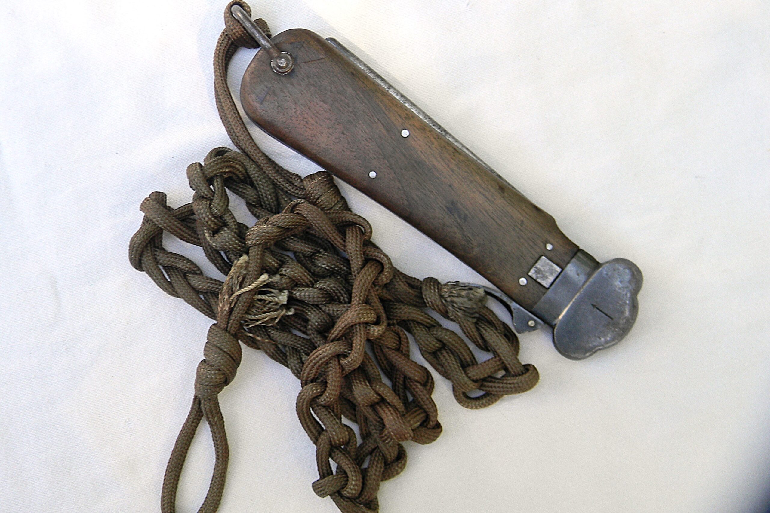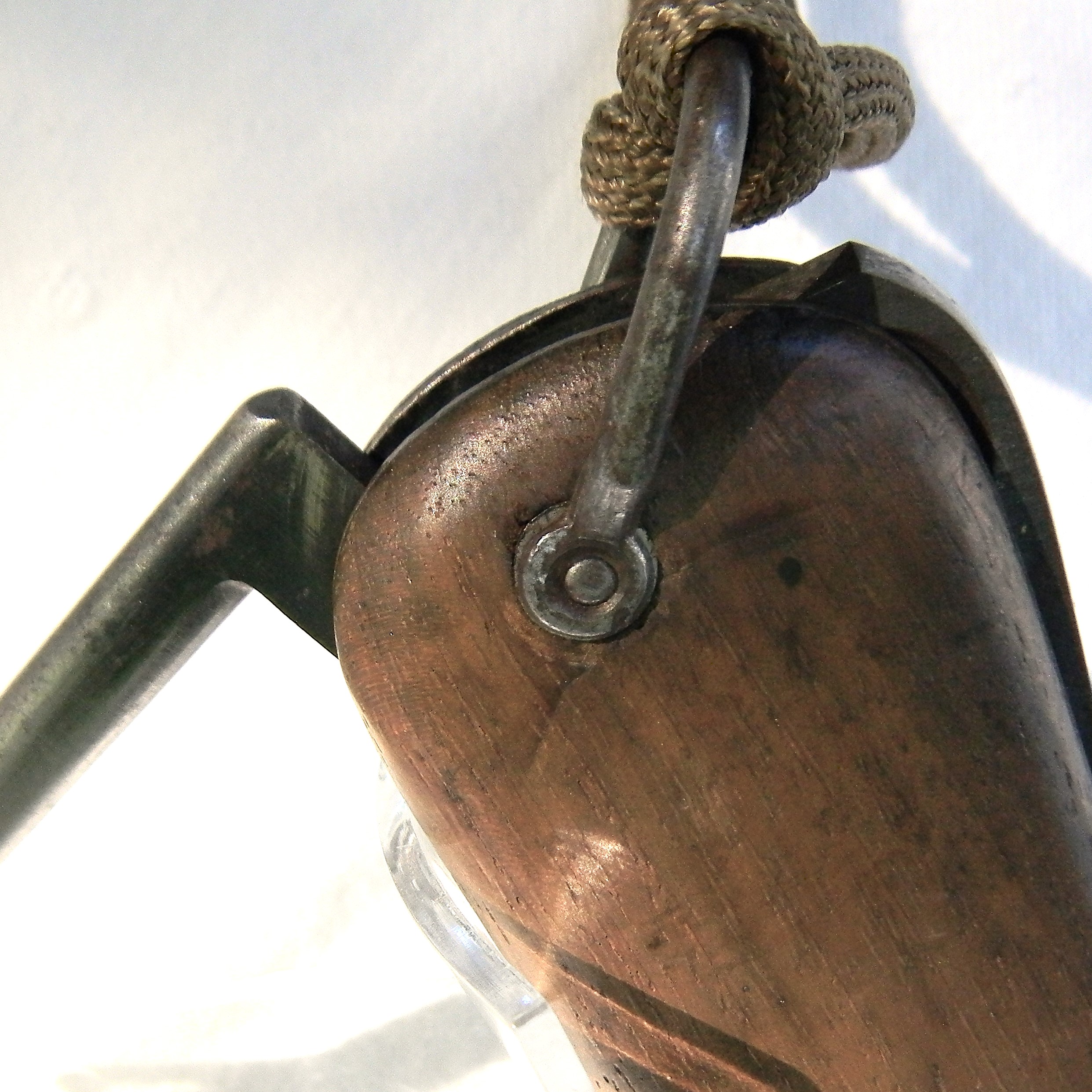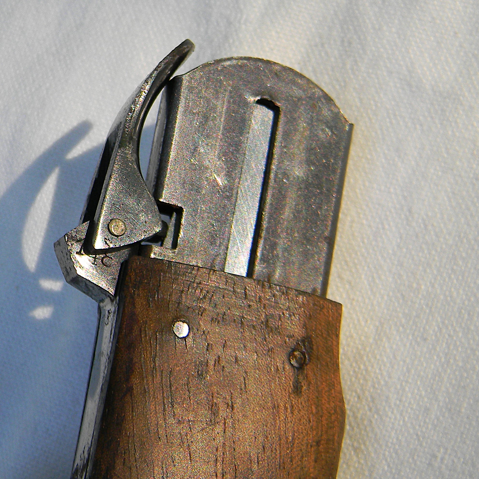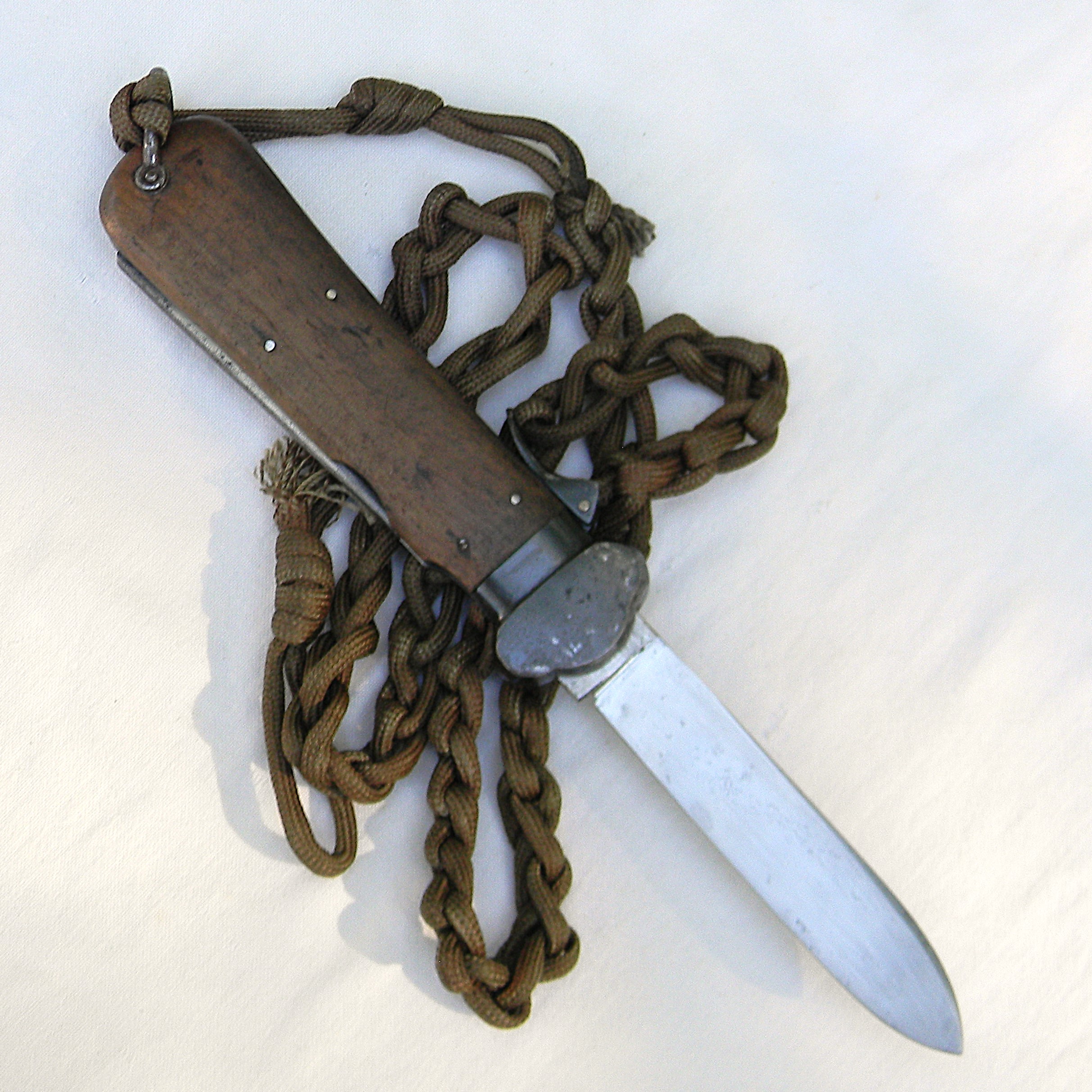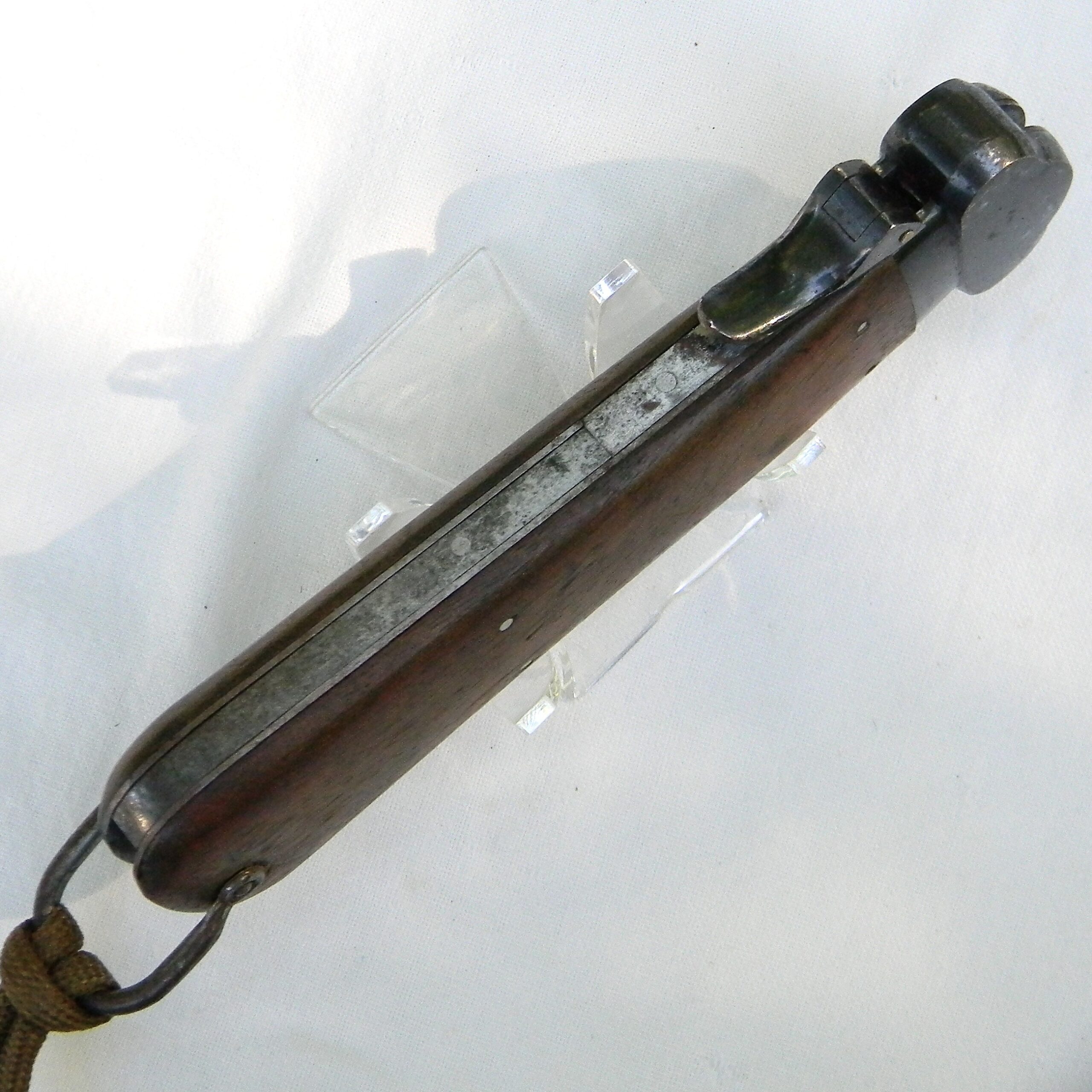 Original hardwood handle scales with 4 steel pins and the D-ring shackle on the pommel; braded green para cord lanyard with a belt loop on the end is still attached. Wood handle scales are in great overall condition, considering the age – no cracks or chips; just a couple of light contact marks. All springs are nice and tight; the spike holds well, original carbon steel shackle is intact – this type is rare this nice. After 80 plus years this original late-war Germany WW2 SMF Model 2 paratrooper knife is still in excellent shape, considering the age. Today most of the surviving German WW2 era Fallschirmjäger-Messer paratrooper knives are in private collections & rarely come up for sale; don’t miss your chance to add this rare late-war transitional Germany WW2 SMF Model 2 paratrooper knife to your collection! Please check out our Collectable Blades and Militaria sections for a variety of custom-made and various WW1 and WW2 combat knives.