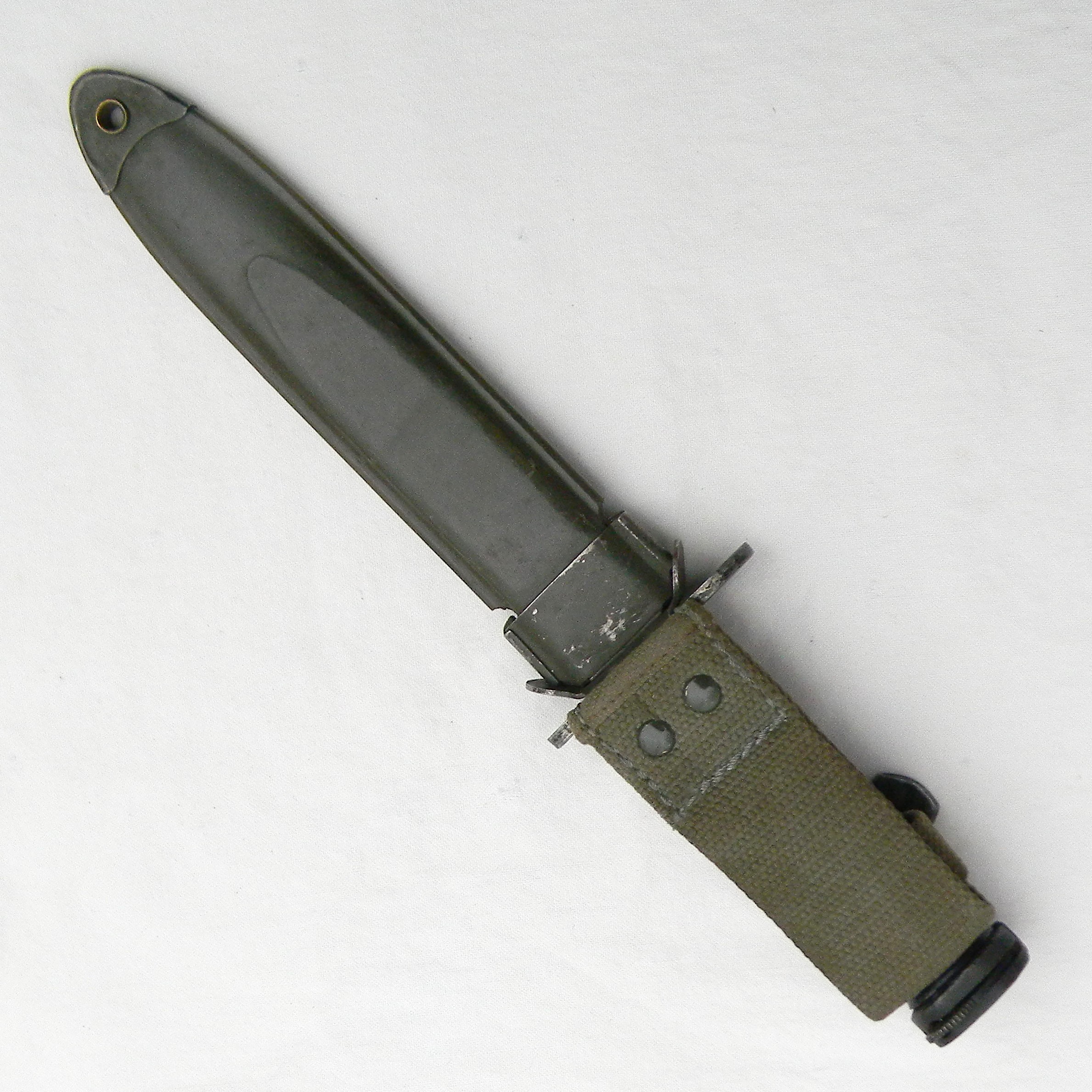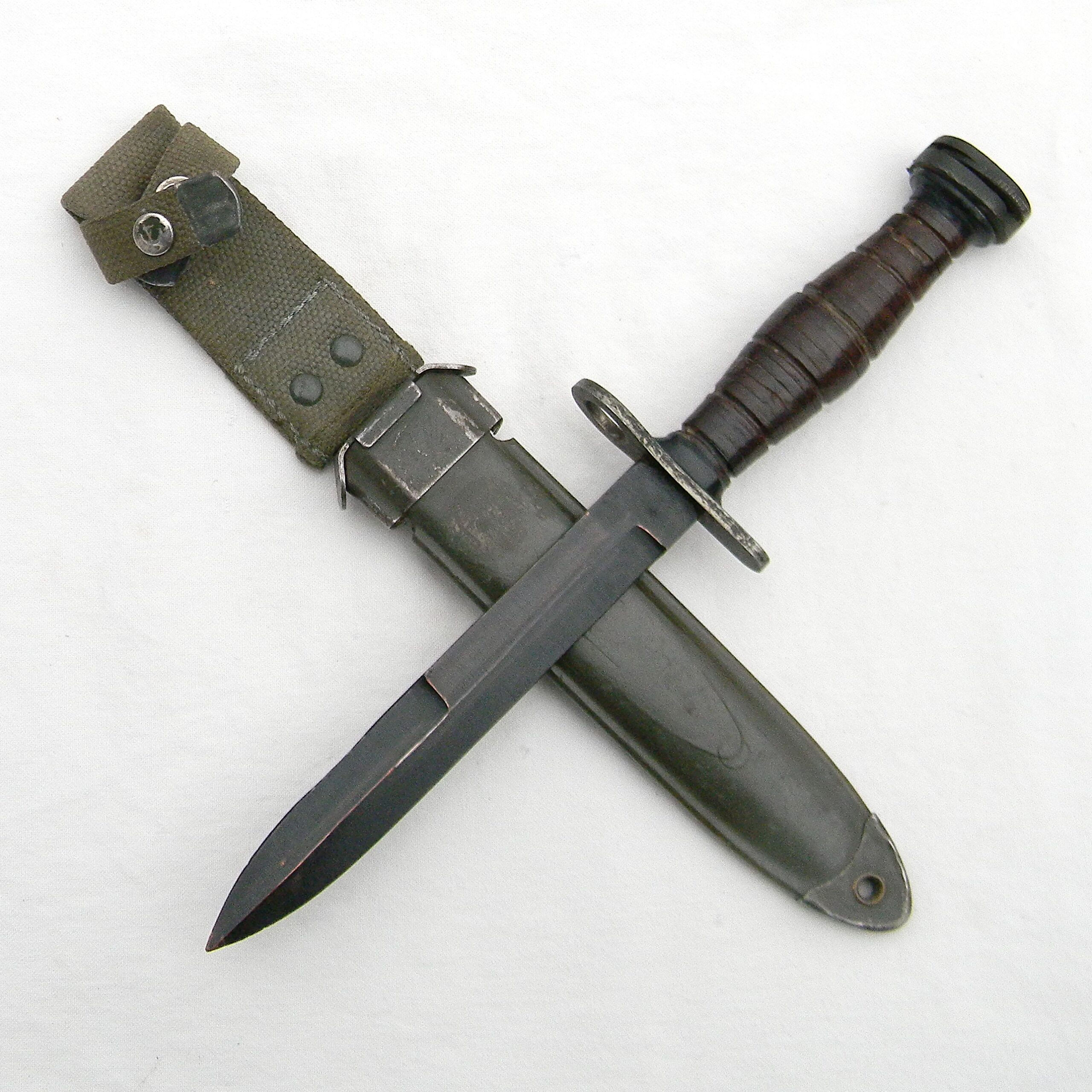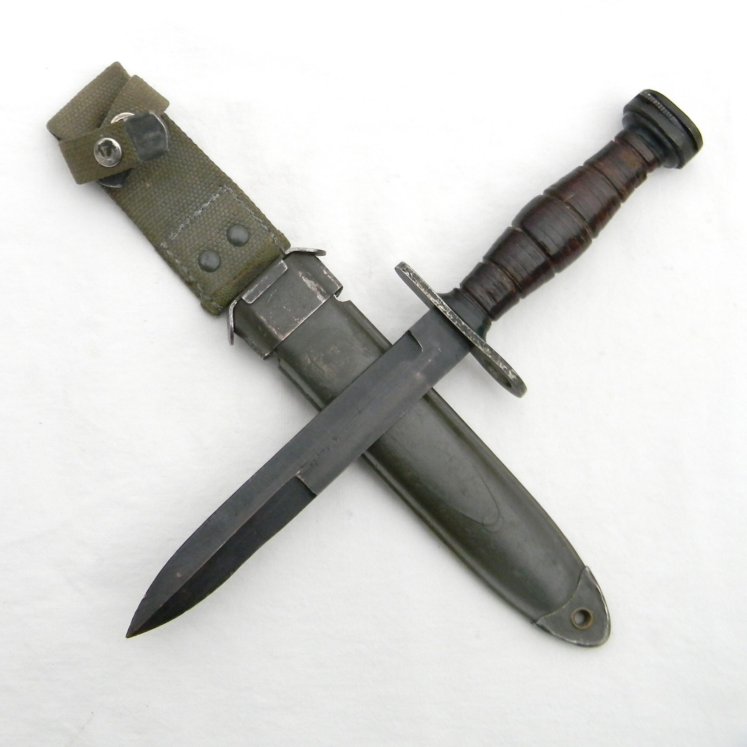 Original Cold War era Greek-made M4 bayonet for M1 carabine in scarce practically unused condition with hard-to-find original made in Greece M8A1 style composition scabbard; only 38,264 were made in the 1950s. This is a scarce type in general – most of these Greek M4s came to the US just recently, when Greece returned its stock of older US-made M1 Carbines to the U.S. Government in 2010–2011. A lot of Greek M4s were paired with US-made M8A1 scabbards with only a fraction of bayonets fitted with the post-war Greek-made M8A1-style scabbards – this is a rare find.