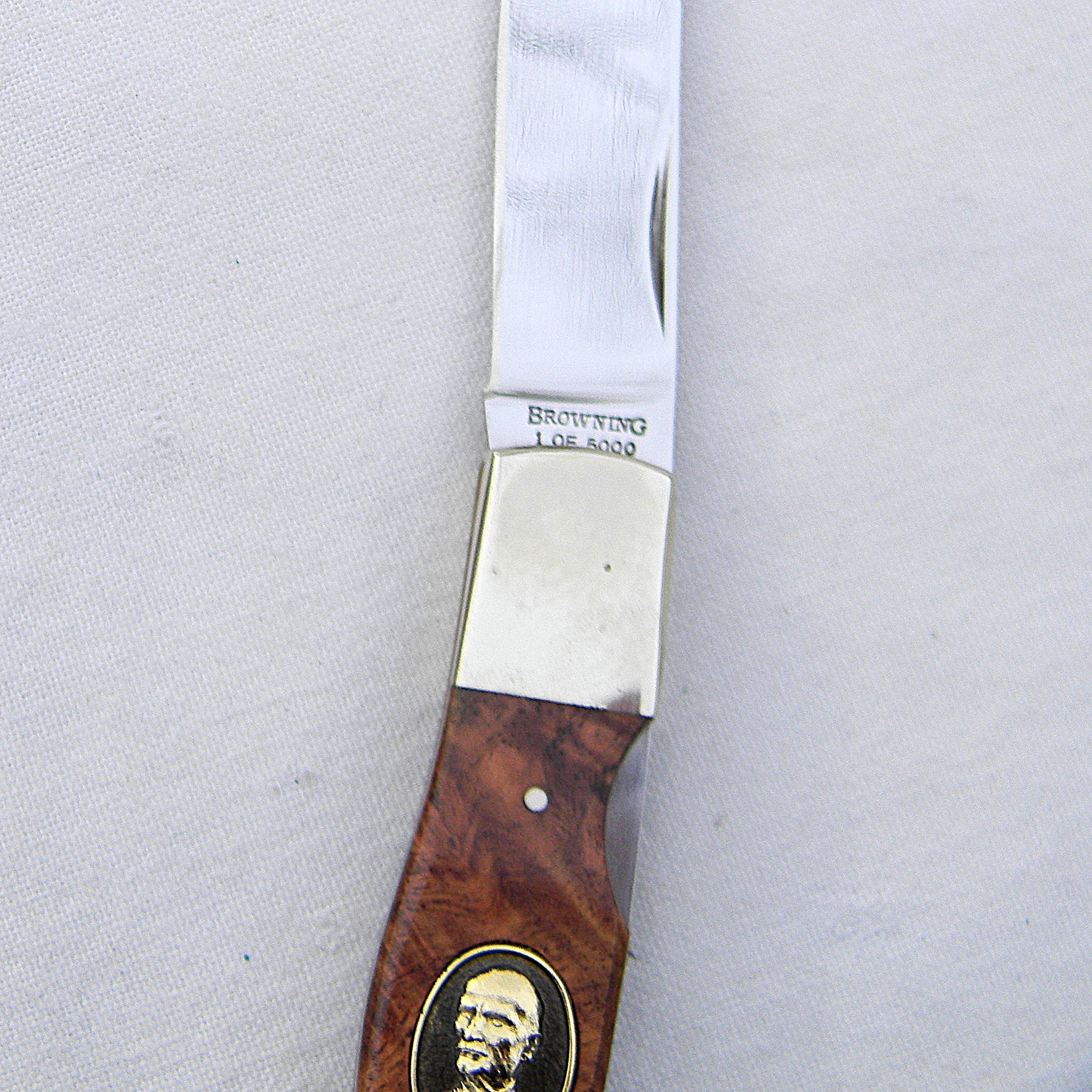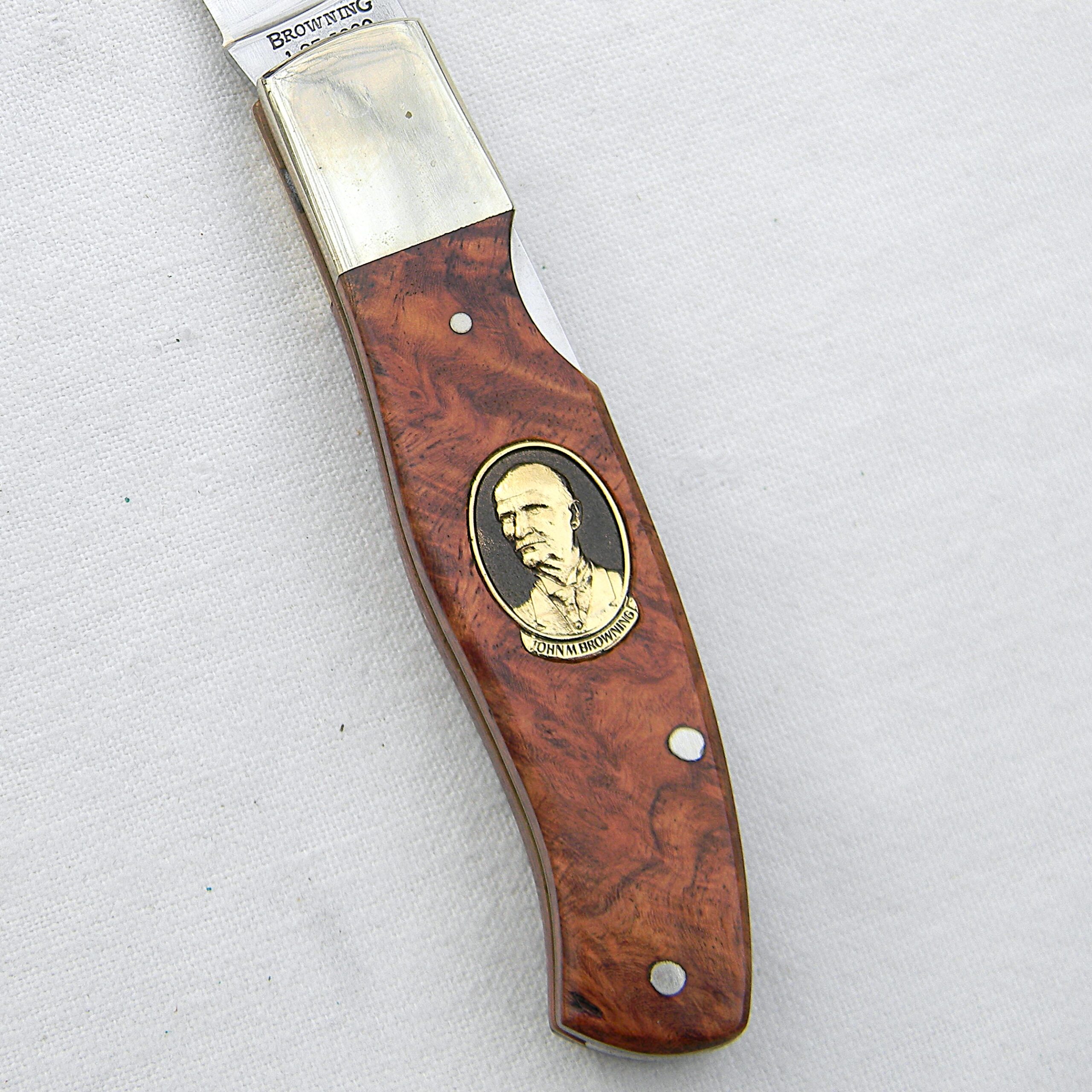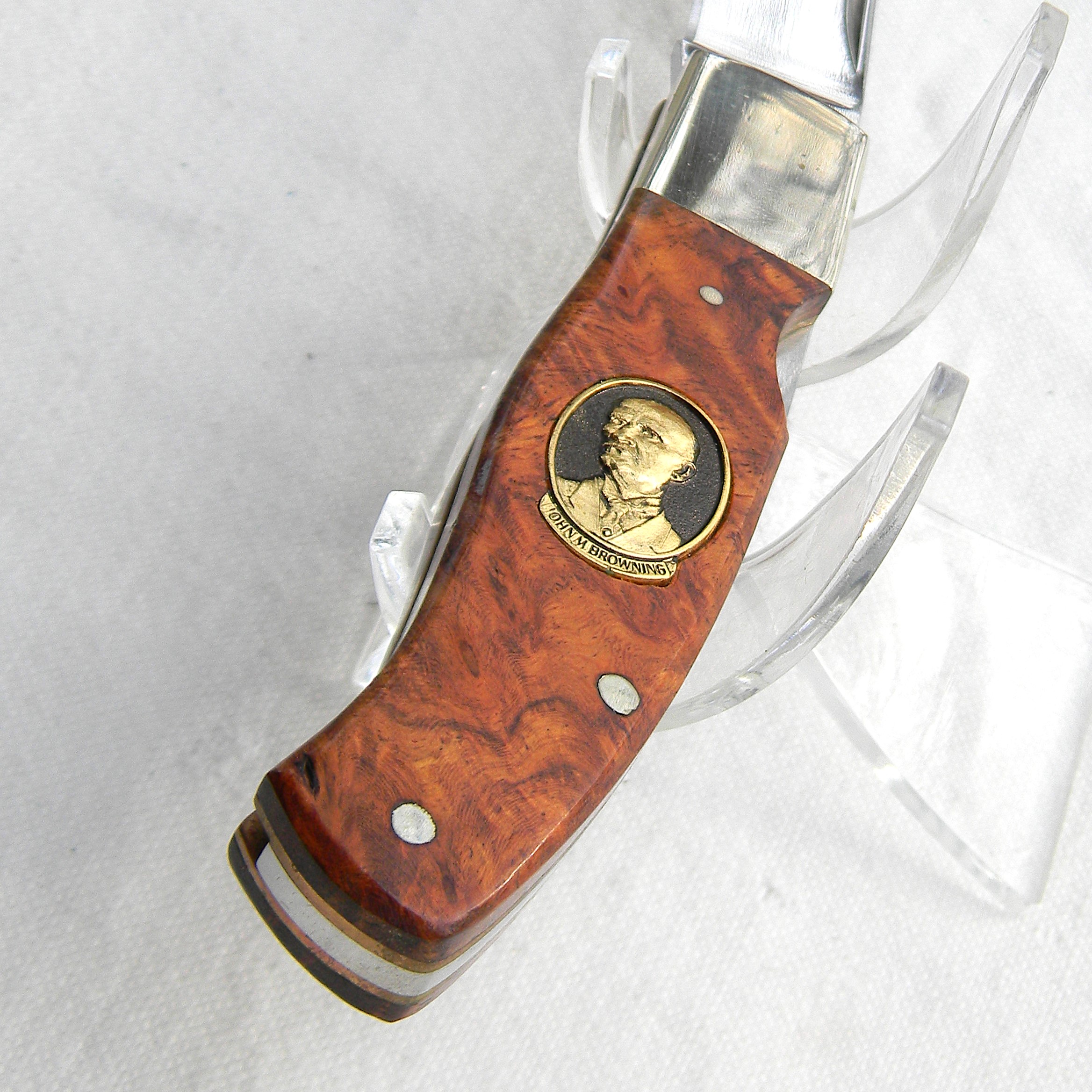Scarce Browning Arms presentation grade model 152 JOHN BROWNING lockback with superb quality gold-pated J Browning medallion on the handle and exotic quince burl handle scales. A limited edition issue designed by Michael Collins; hand-finished in 1994 in Japan; unused and still in the original walnut presentation case with papers and hand-signed COA. This type is rare this nice and complete.