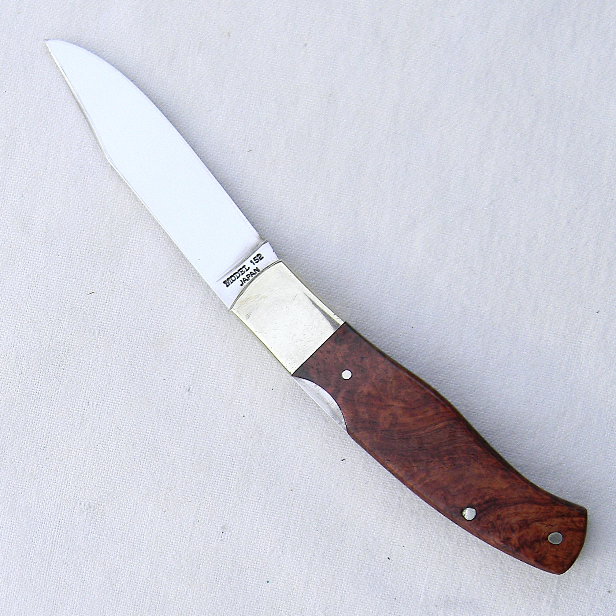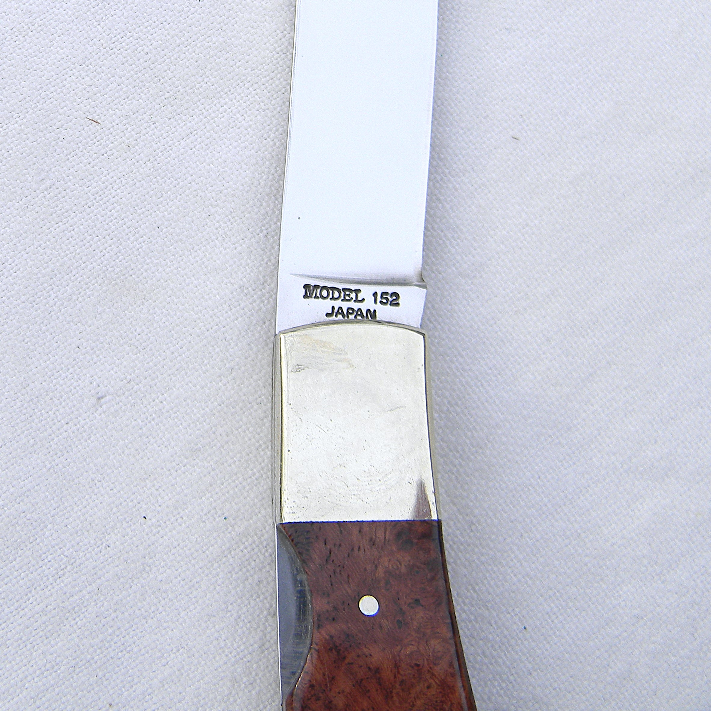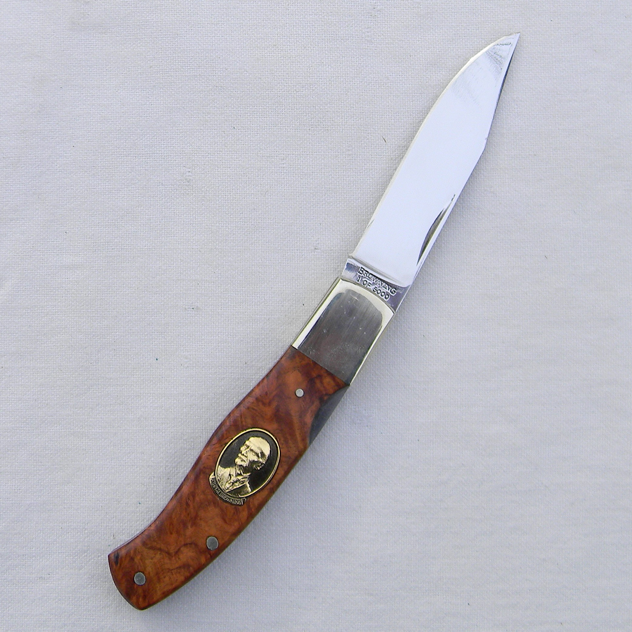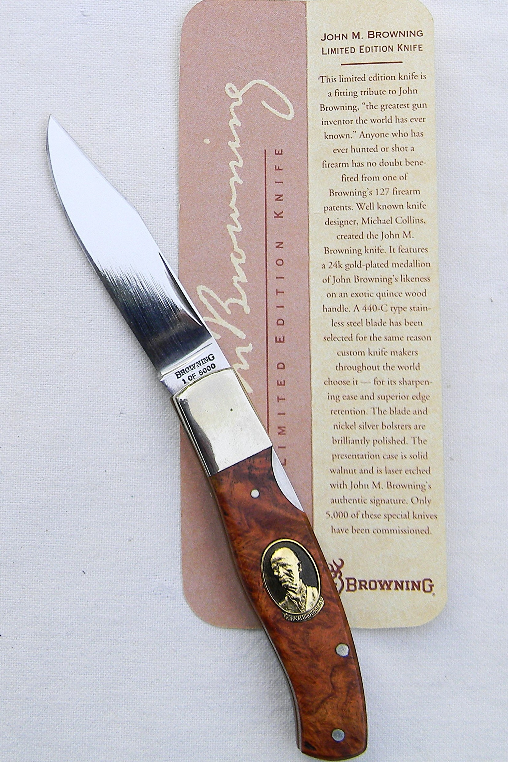 Scarce Browning Arms presentation grade model 152 JOHN BROWNING lockback with superb quality gold-pated J Browning medallion on the handle and exotic quince burl handle scales. A limited edition issue designed by Michael Collins; hand-finished in 1994 in Japan; unused and still in the original walnut presentation case with papers and hand-signed COA. This type is rare this nice and complete.