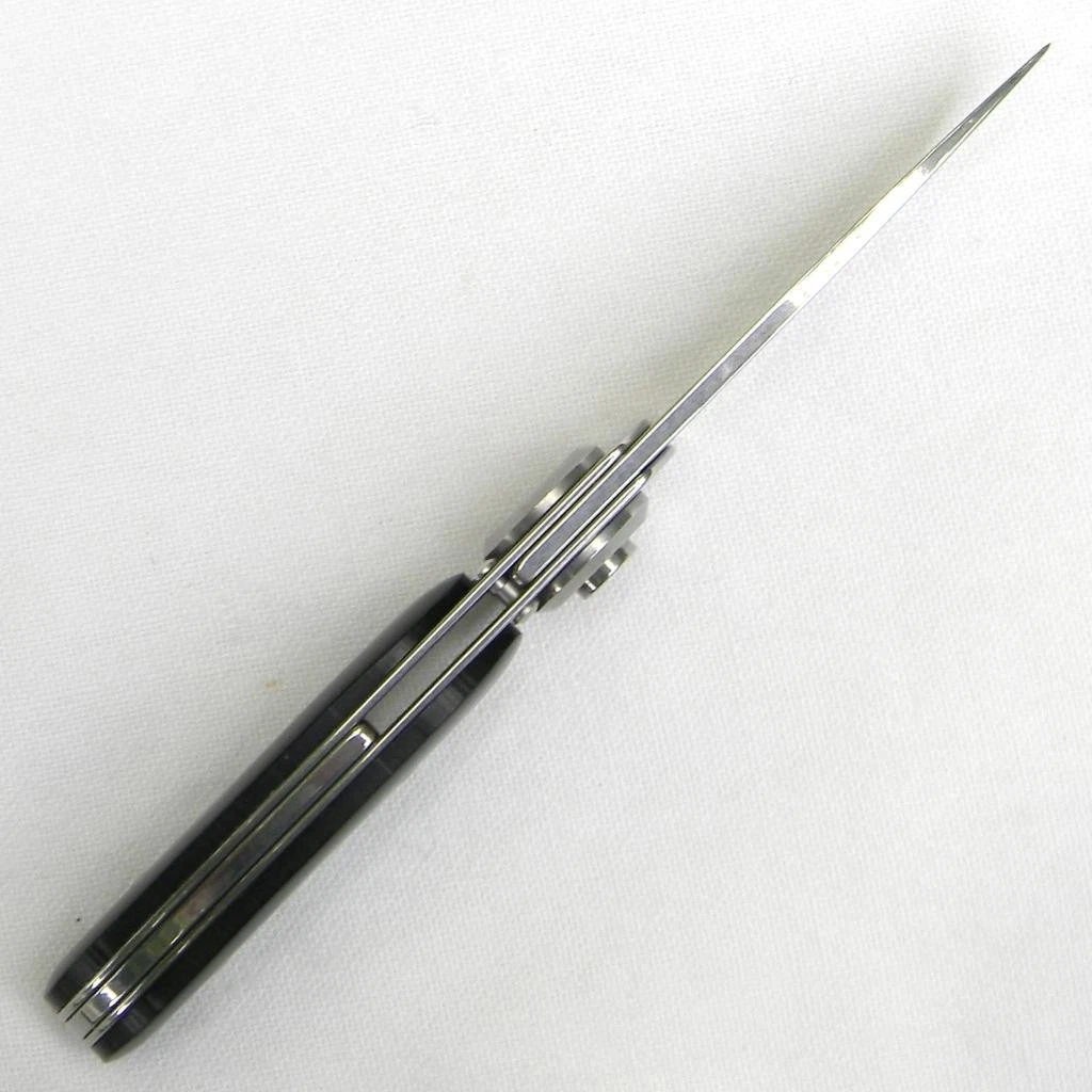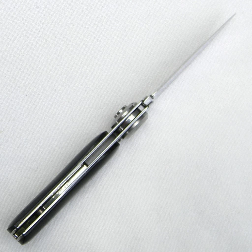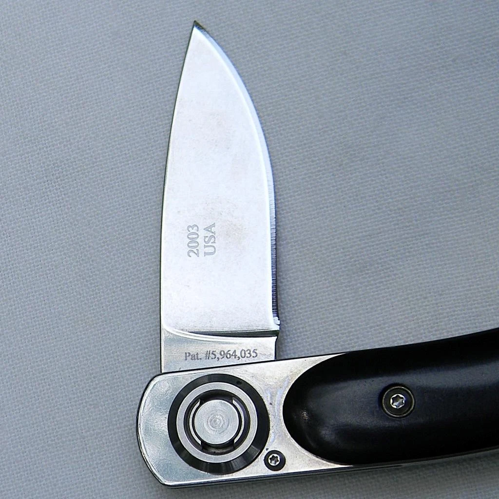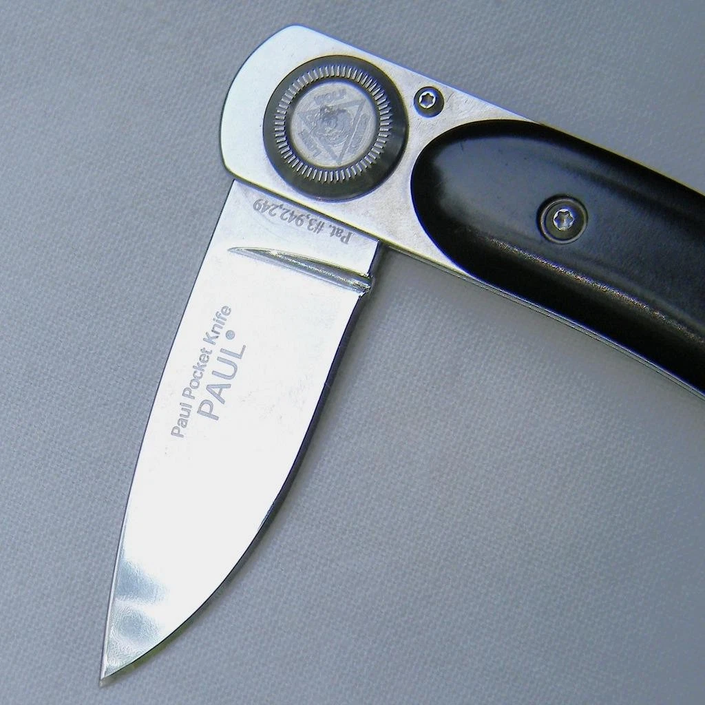 Excellent quality US-made Lone Wolf Knives Paul Pocket Knife folder designed by the renowned aerospace engineer Paul W. Rochlmann. The knife features a unique Paul’s design one-handed opening Axial locking mechanism, tool-grade CPM-S30V stainless alloy blade, and black micarta handle scales. Made in 2003 by Lone Wolf prior to its acquisition by Benchmade; this model has been long-discontinued. The knife is in excellent as-made unused condition; this type is hard-to-find in better grades these days.