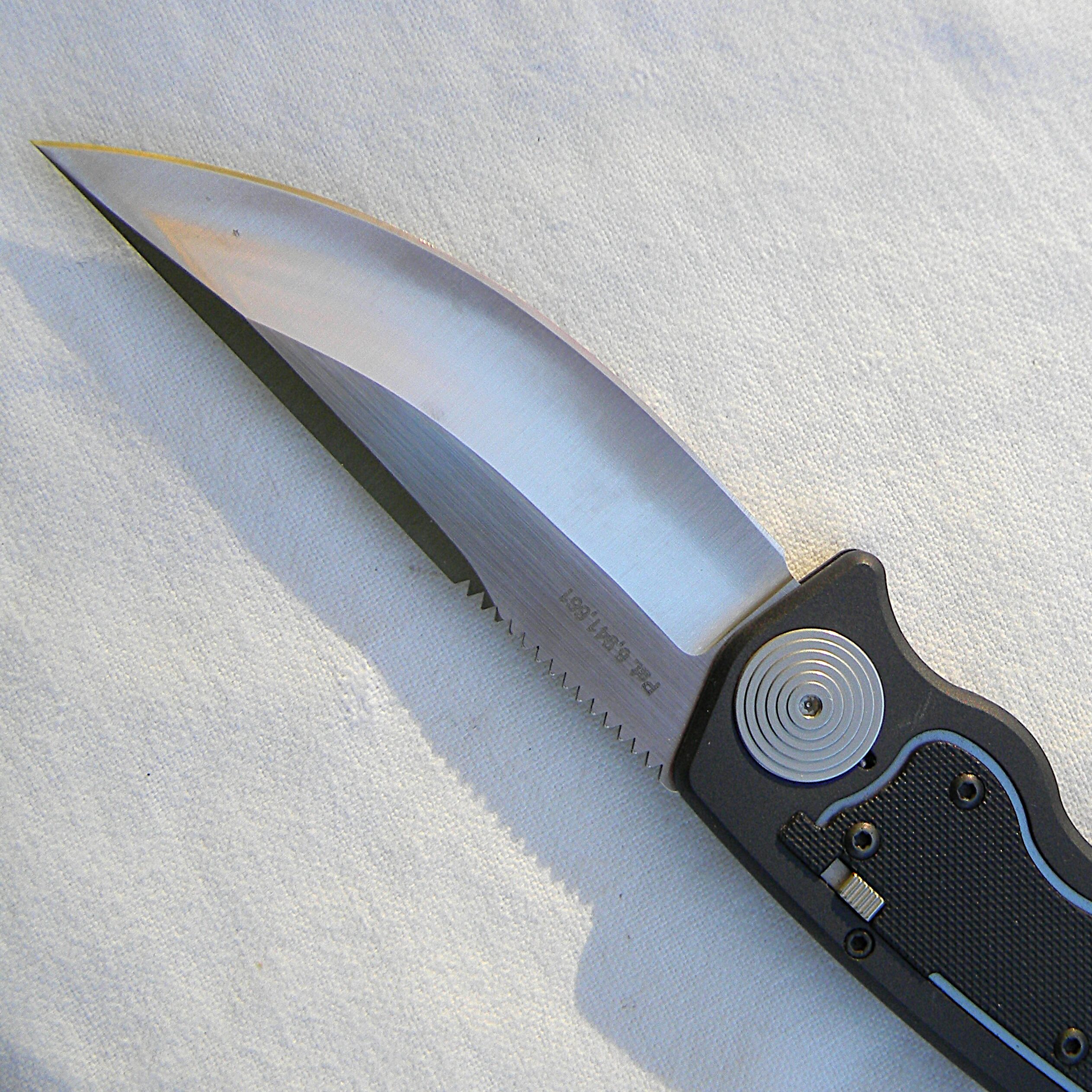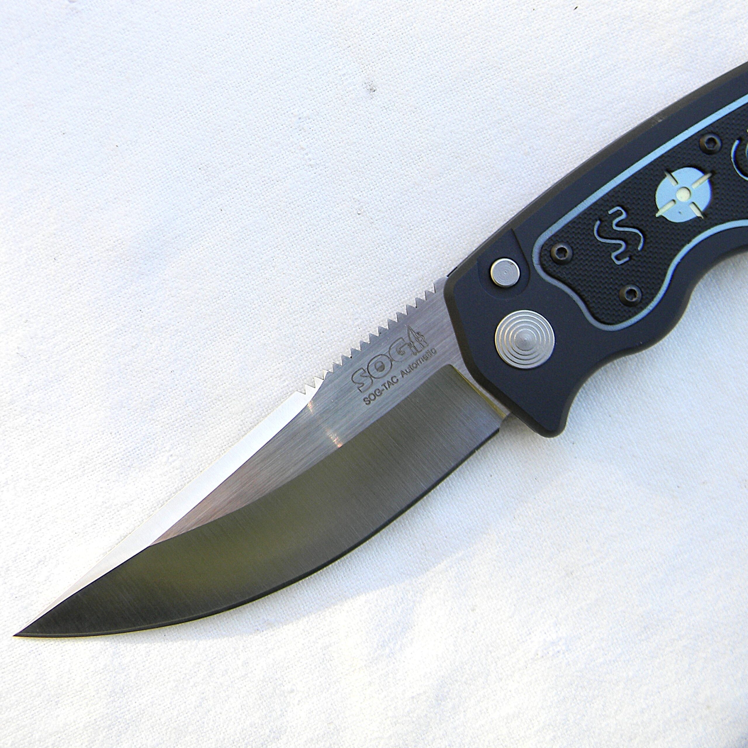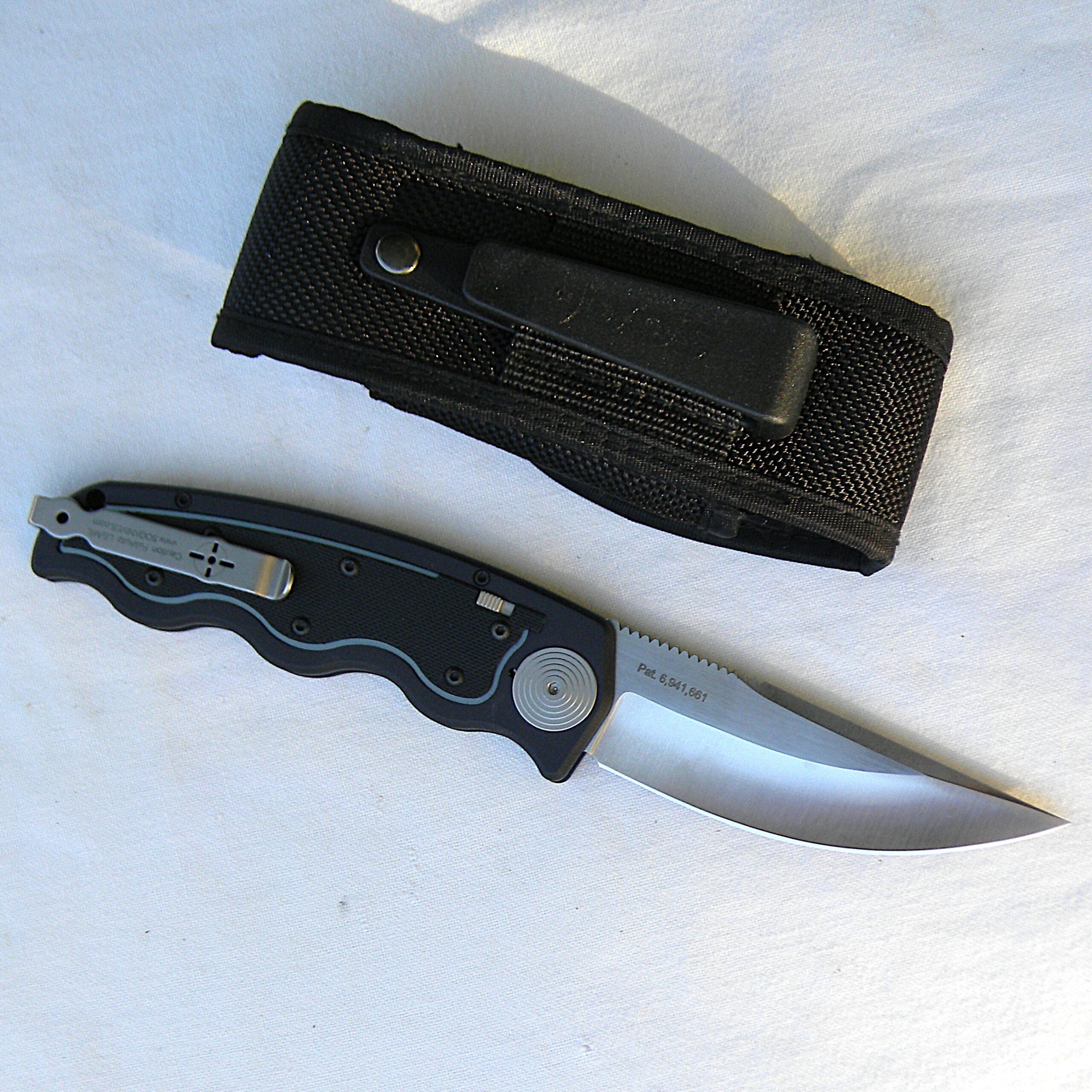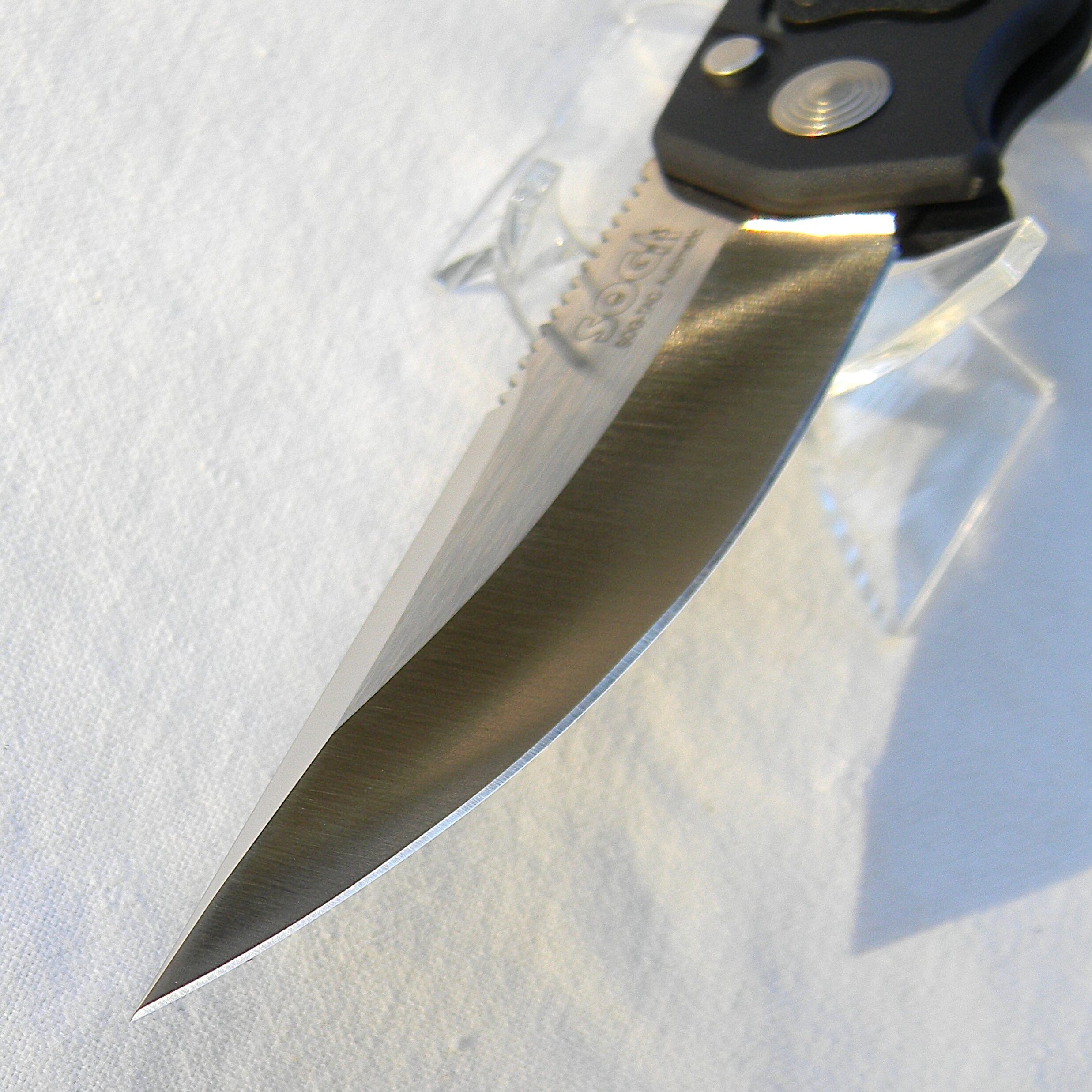 SOG-TAC Auto folding knife, 3-1/2 inch blade with safety lock, black aluminum handle, nylon pouch. Made in the USA; scarce UNUSED. FREE EXPEDITED SHIPPING WITHIN THE U.S. FOR THIS ITEM.