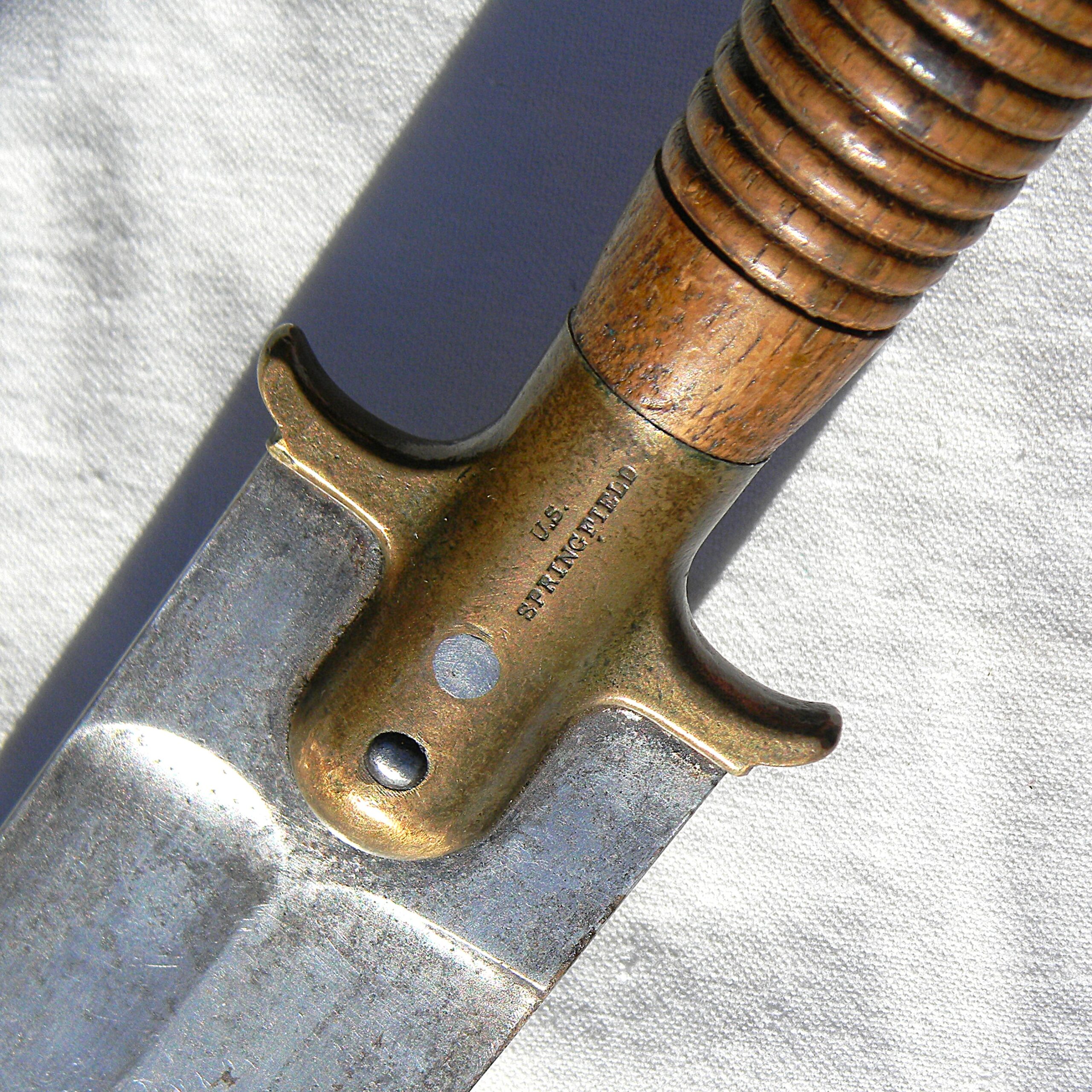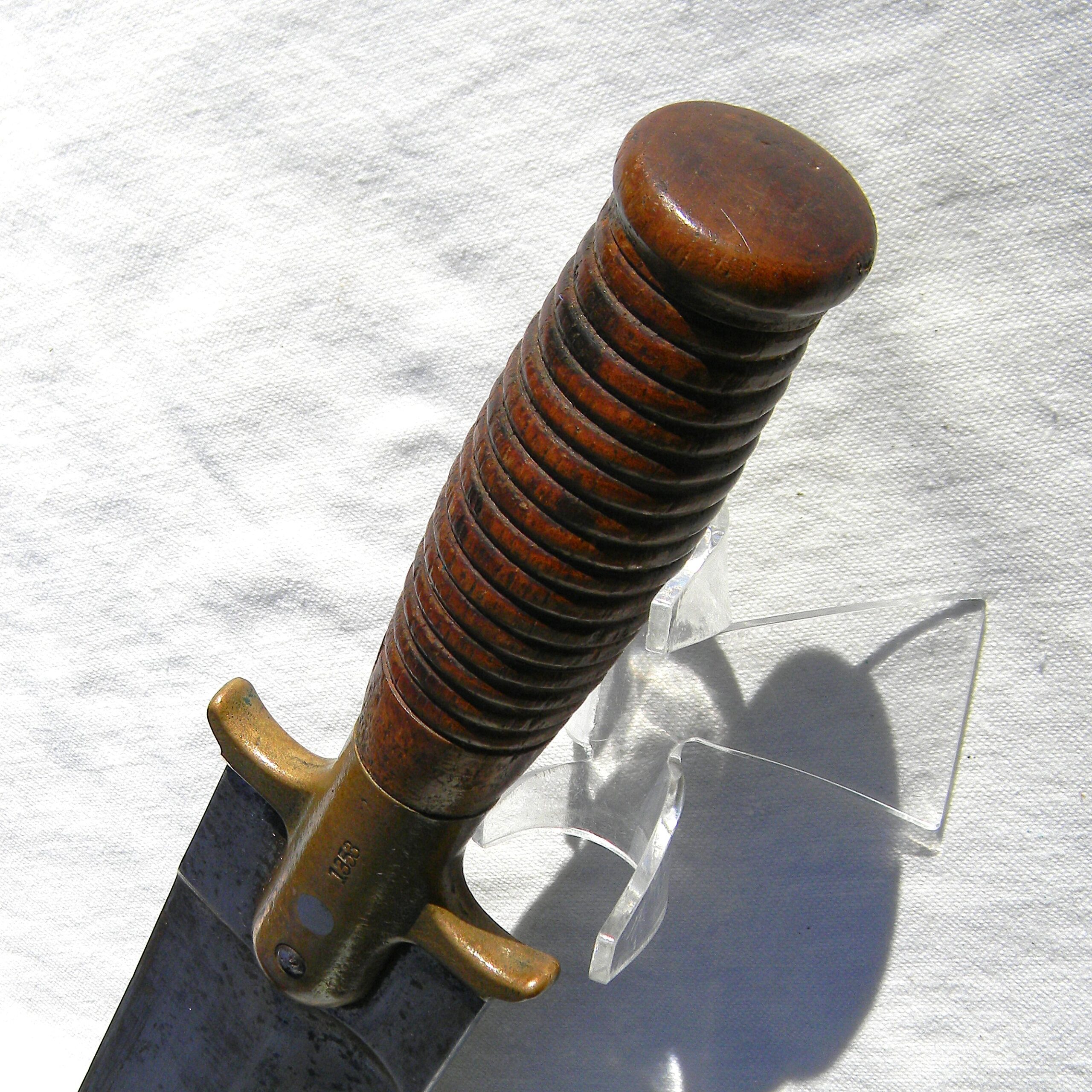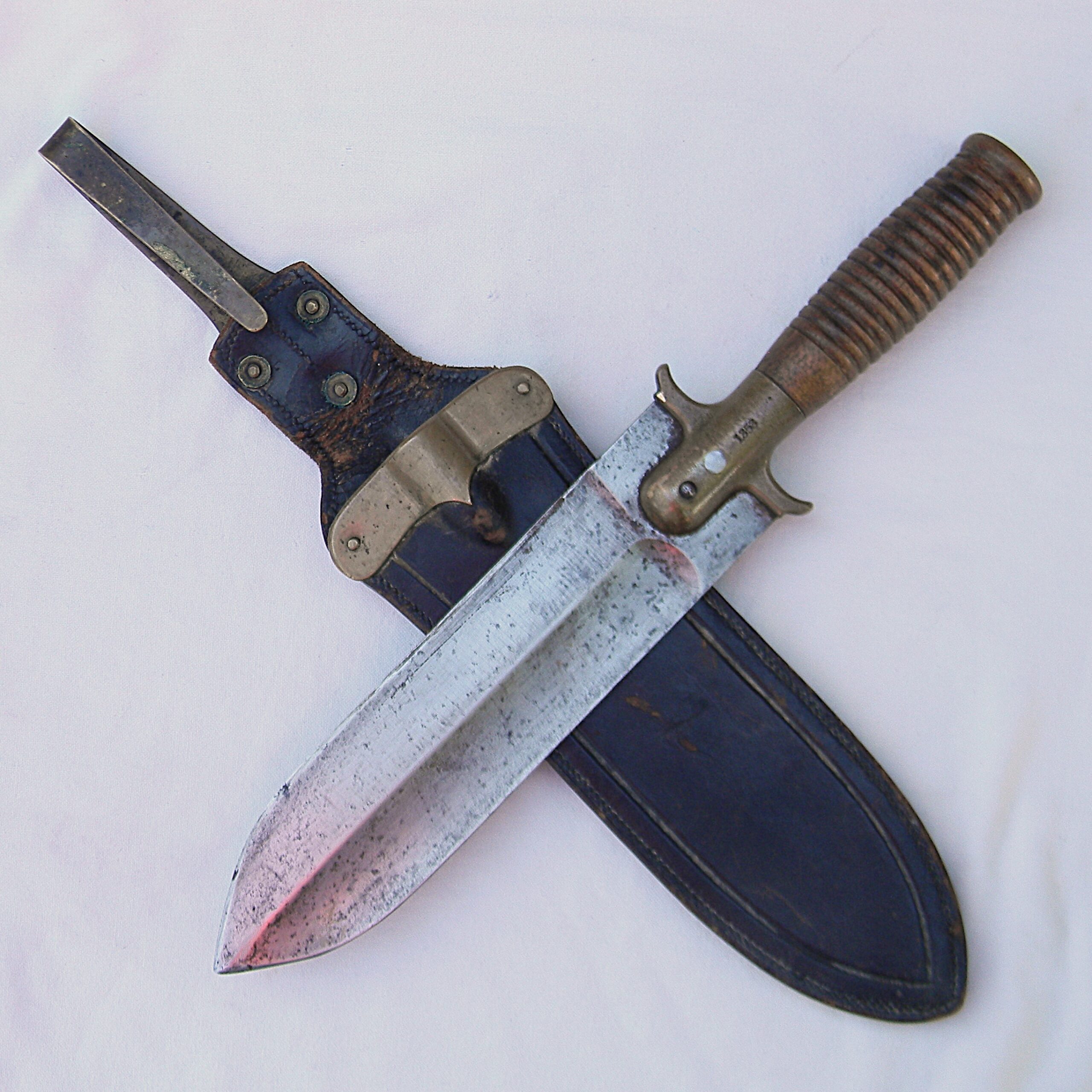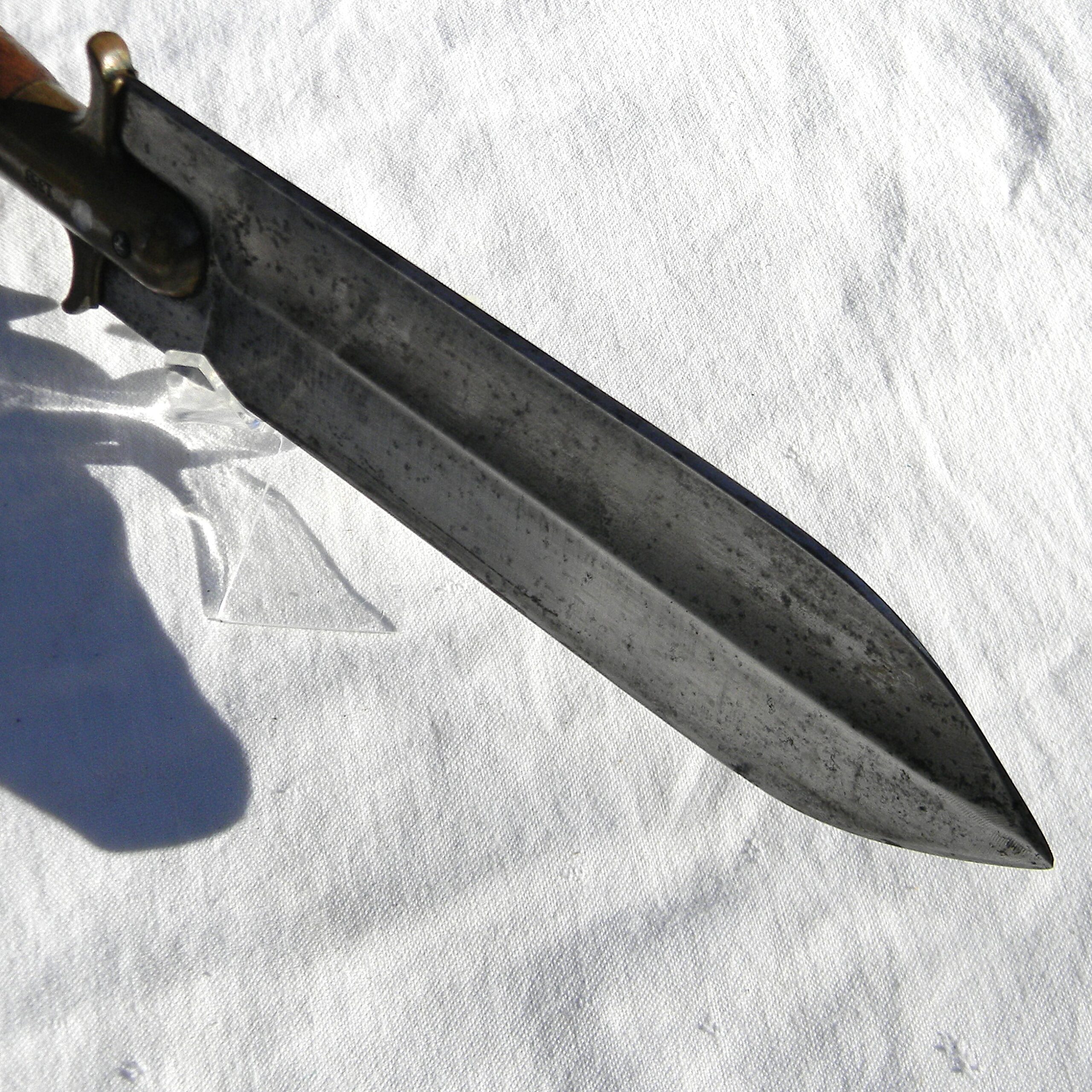 This somewhat awkward knife was designed as “all-in-one” tool for skinning game, digging shallow trenches, clearing brush and, when everything else failed, as the last-resort self-defense weapon. The knife had a large cumbersome blade but its sharp edge could be utilized as a traditional hunting companion – dressing big game, as well as cutting and slicing. The M1880 was issued with the M1881 and the M1888 Rod Bayonet Rifles which were also manufactured at the Springfield Armory. The first group of 1,002 serial-numbered M1880s knives was manufactured in 1881. This 1st-issue type had iron guards; brass was used in later issues which were serial-numbered as well. All-in-all just about 11,000 were made from 1881 to 1885. The M1880 was used heavily during the Indian Wars and in the Western Frontier outposts. Most of M1880 blades are usually pitted, re-sharpened and corroded; original turned wood handles were prone to damage in the field and were frequently replaced. The survival rate of these cumbersome knives was low; only a fraction of the original-issue knives survived to the present day. Also, I have a near-perfect M1880 specimen with original scabbard, please take a look