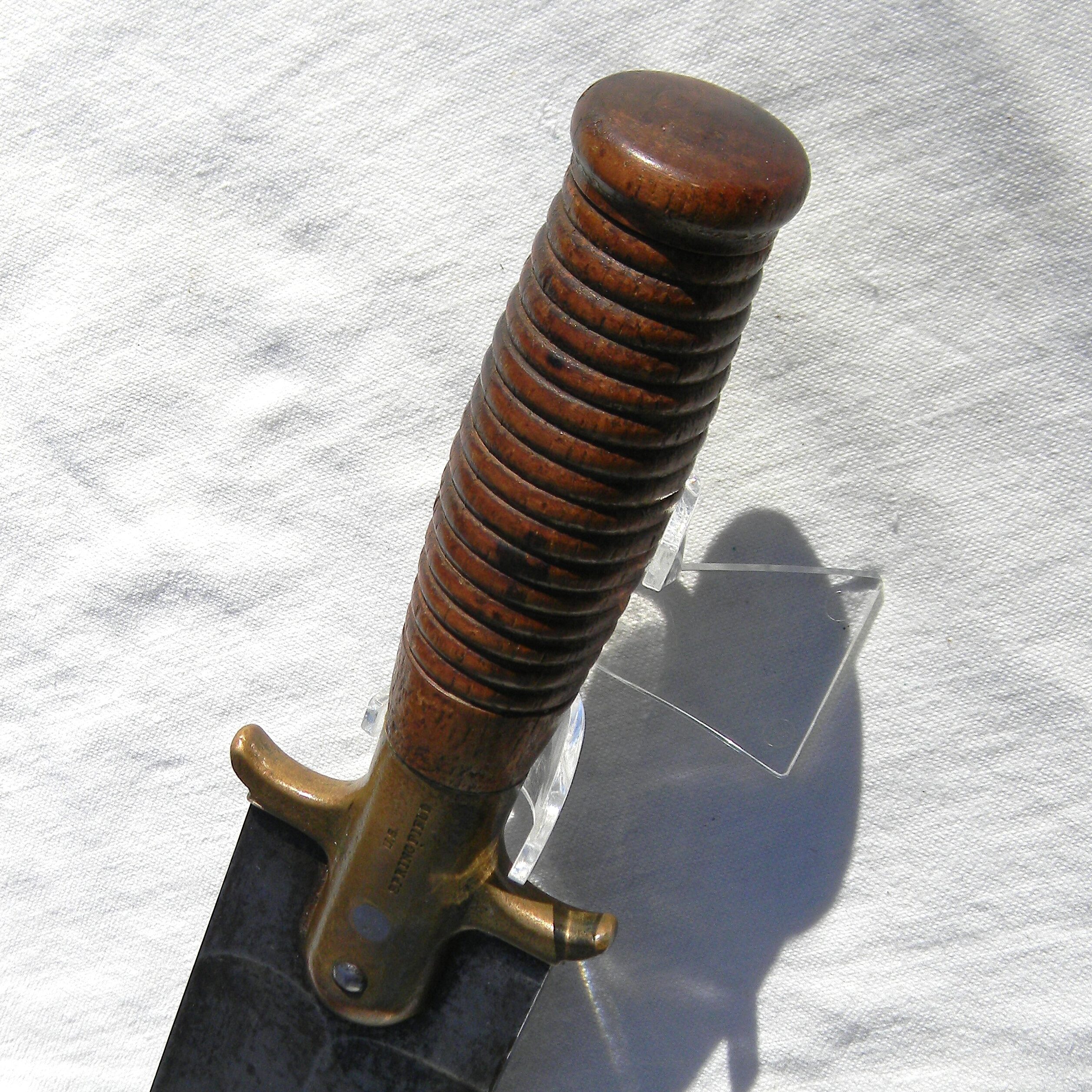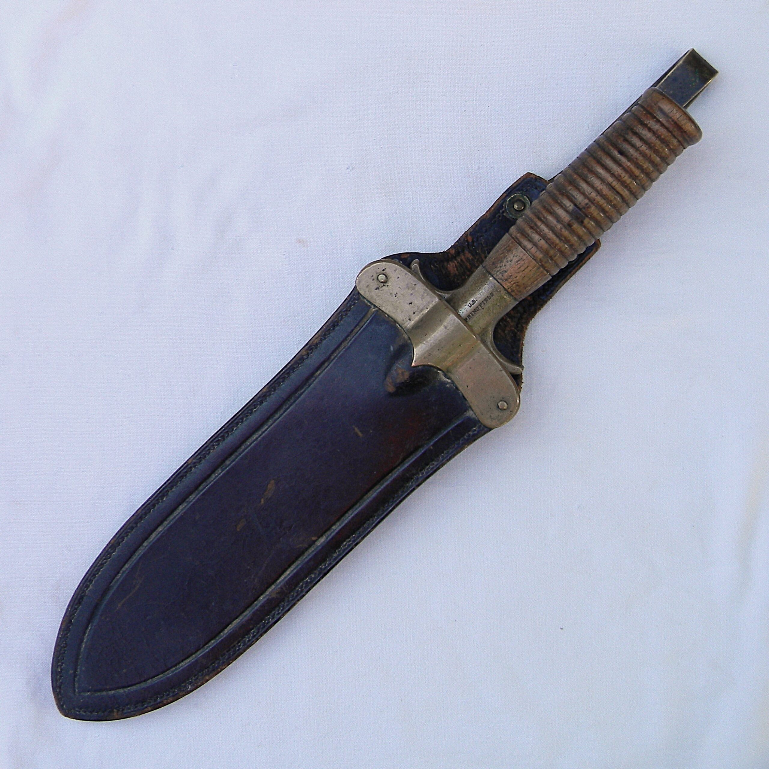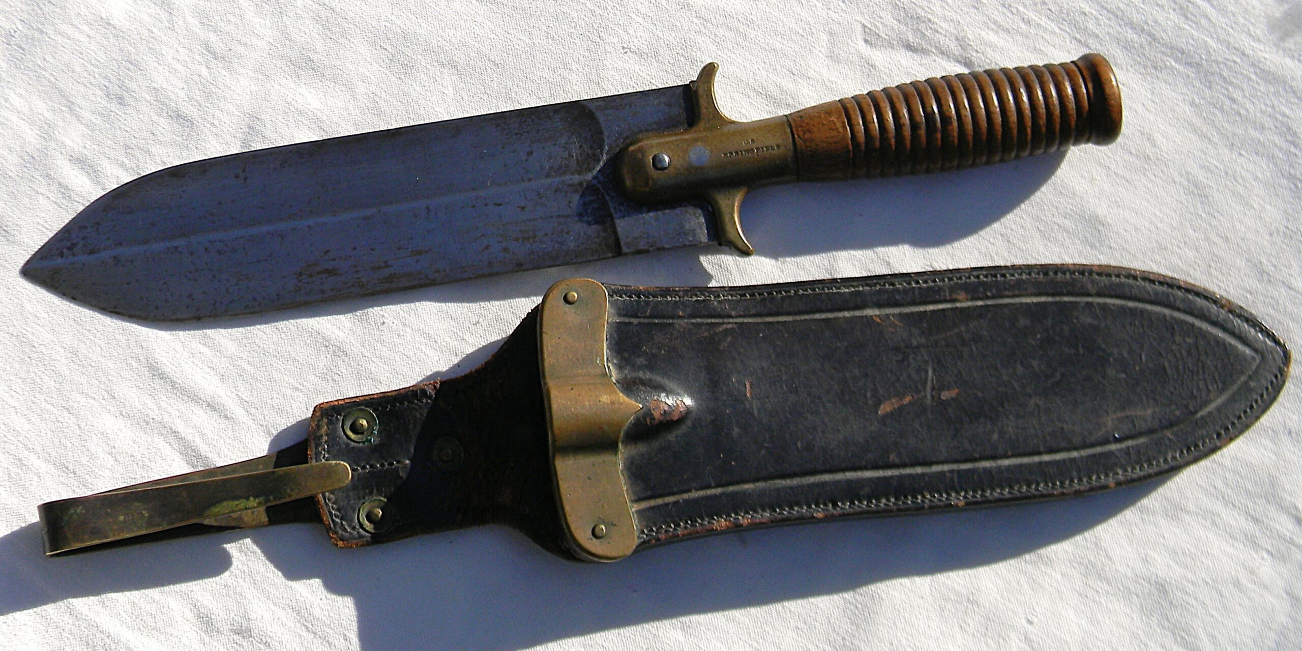 This somewhat awkward knife was designed as “all-in-one” tool for skinning game, digging shallow trenches, clearing brush and, when everything else failed, as the last-resort self-defense weapon. The knife had a large cumbersome blade but its sharp edge could be utilized as a traditional hunting companion – dressing big game, as well as cutting and slicing. The M1880 was issued with the M1881 and the M1888 Rod Bayonet Rifles which were also manufactured at the Springfield Armory. The first group of 1,002 serial-numbered M1880s knives was manufactured in 1881. This 1st-issue type had iron guards; brass was used in later issues which were serial-numbered as well. All-in-all just about 11,000 were made from 1881 to 1885. The M1880 was used heavily during the Indian Wars and in the Western Frontier outposts. Most of M1880 blades are usually pitted, re-sharpened and corroded; original turned wood handles were prone to damage in the field and were frequently replaced. The survival rate of these cumbersome knives was low; only a fraction of the original-issue knives survived to the present day. Also, I have a near-perfect M1880 specimen with original scabbard, please take a look