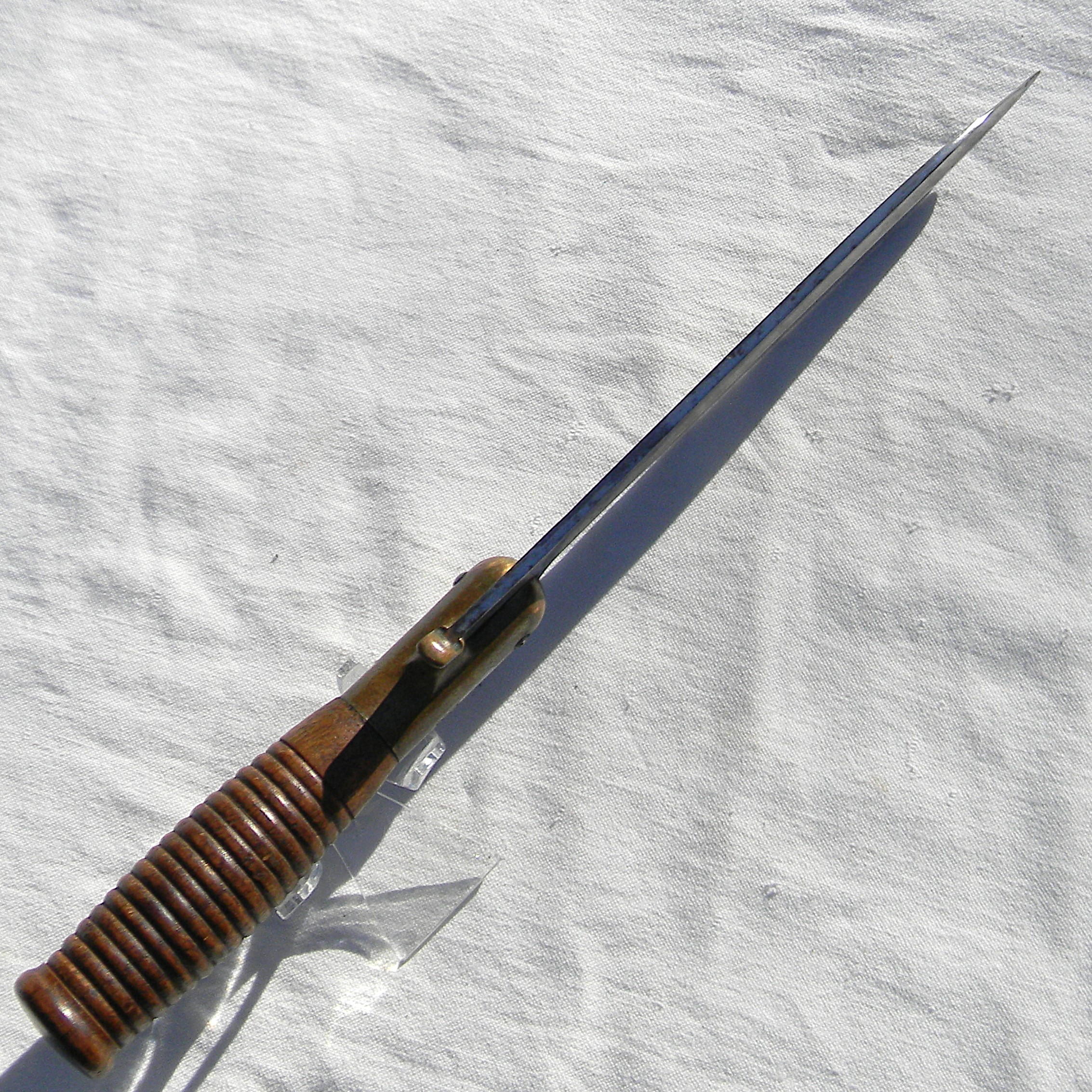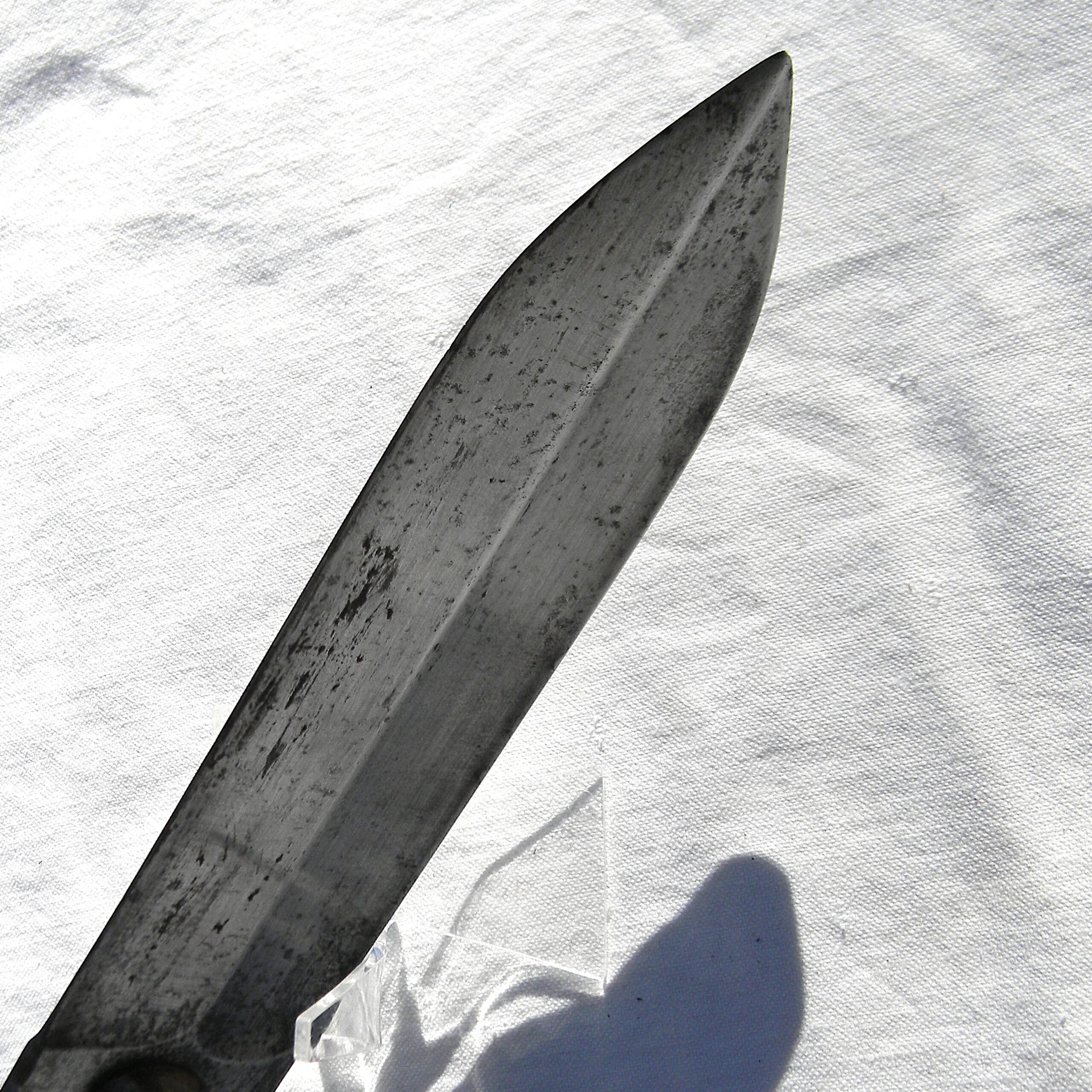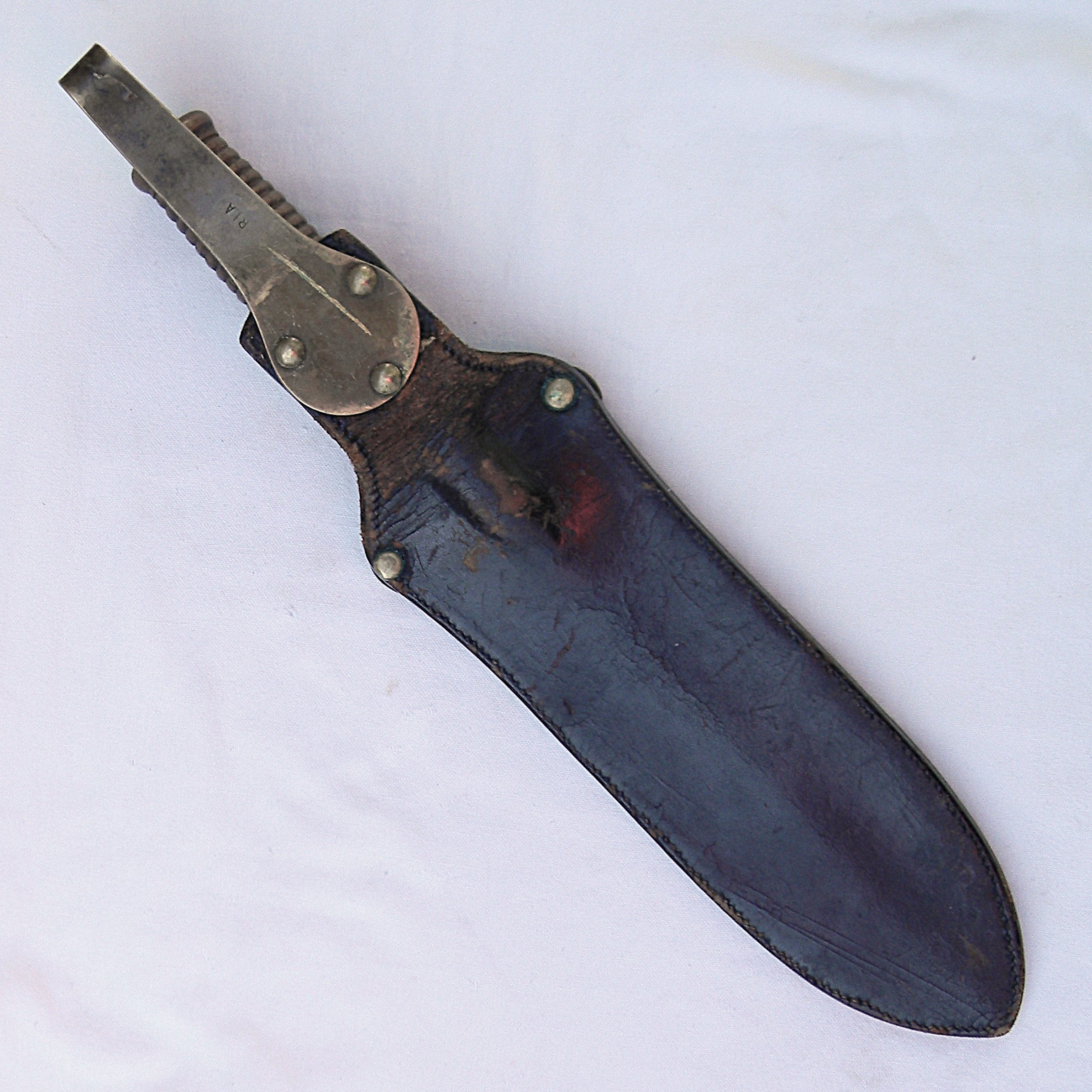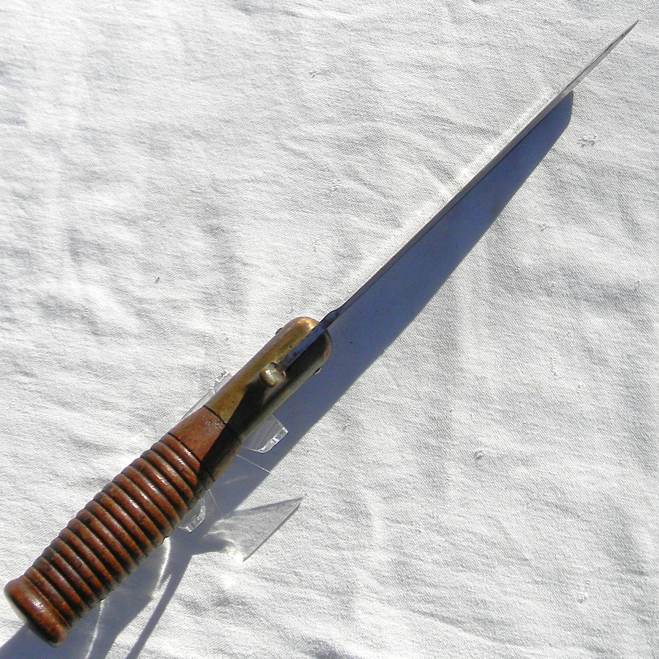 This somewhat awkward knife was designed as “all-in-one” tool for skinning game, digging shallow trenches, clearing brush and, when everything else failed, as the last-resort self-defense weapon. The knife had a large cumbersome blade but its sharp edge could be utilized as a traditional hunting companion – dressing big game, as well as cutting and slicing. The M1880 was issued with the M1881 and the M1888 Rod Bayonet Rifles which were also manufactured at the Springfield Armory. The first group of 1,002 serial-numbered M1880s knives was manufactured in 1881. This 1st-issue type had iron guards; brass was used in later issues which were serial-numbered as well. All-in-all just about 11,000 were made from 1881 to 1885. The M1880 was used heavily during the Indian Wars and in the Western Frontier outposts. Most of M1880 blades are usually pitted, re-sharpened and corroded; original turned wood handles were prone to damage in the field and were frequently replaced. The survival rate of these cumbersome knives was low; only a fraction of the original-issue knives survived to the present day. Also, I have a near-perfect M1880 specimen with original scabbard, please take a look