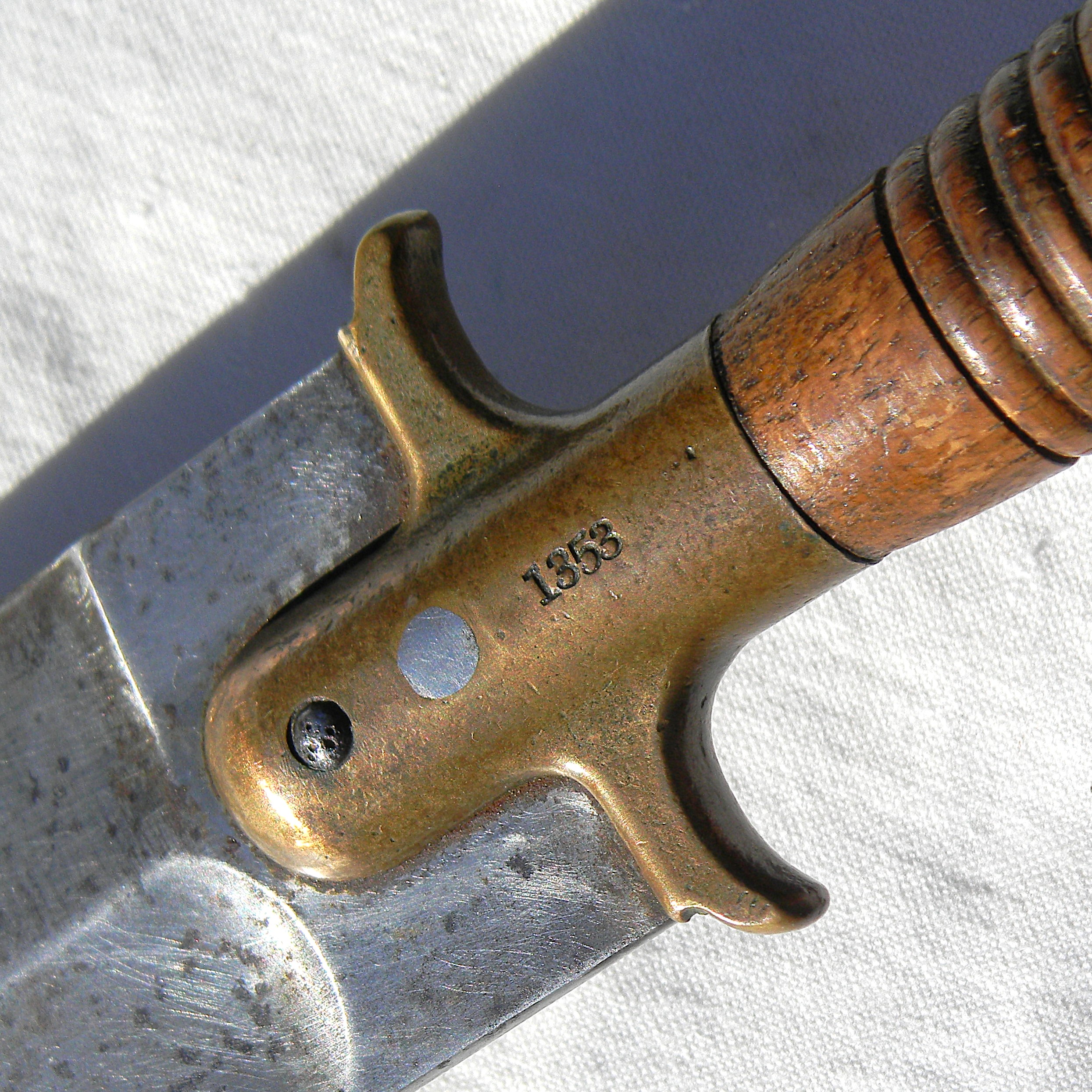 This brass-guard model specimen is in better-than-usual condition for the type as most of M1880 knives were used in the field as intended. Original turned and varnished wood handle is intact with no typical chips, cracks, or damage to the pommel. The brass guard is intact as well; it’s stamped U.S. / SPRINGFIELD on one side, serial number 1353 on the other. The stamps are sharp, clear, and fully readable – rare as such.
