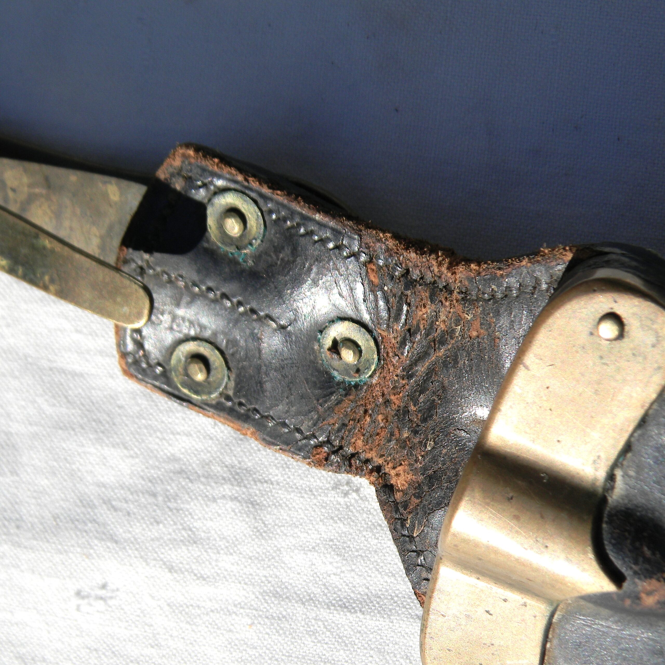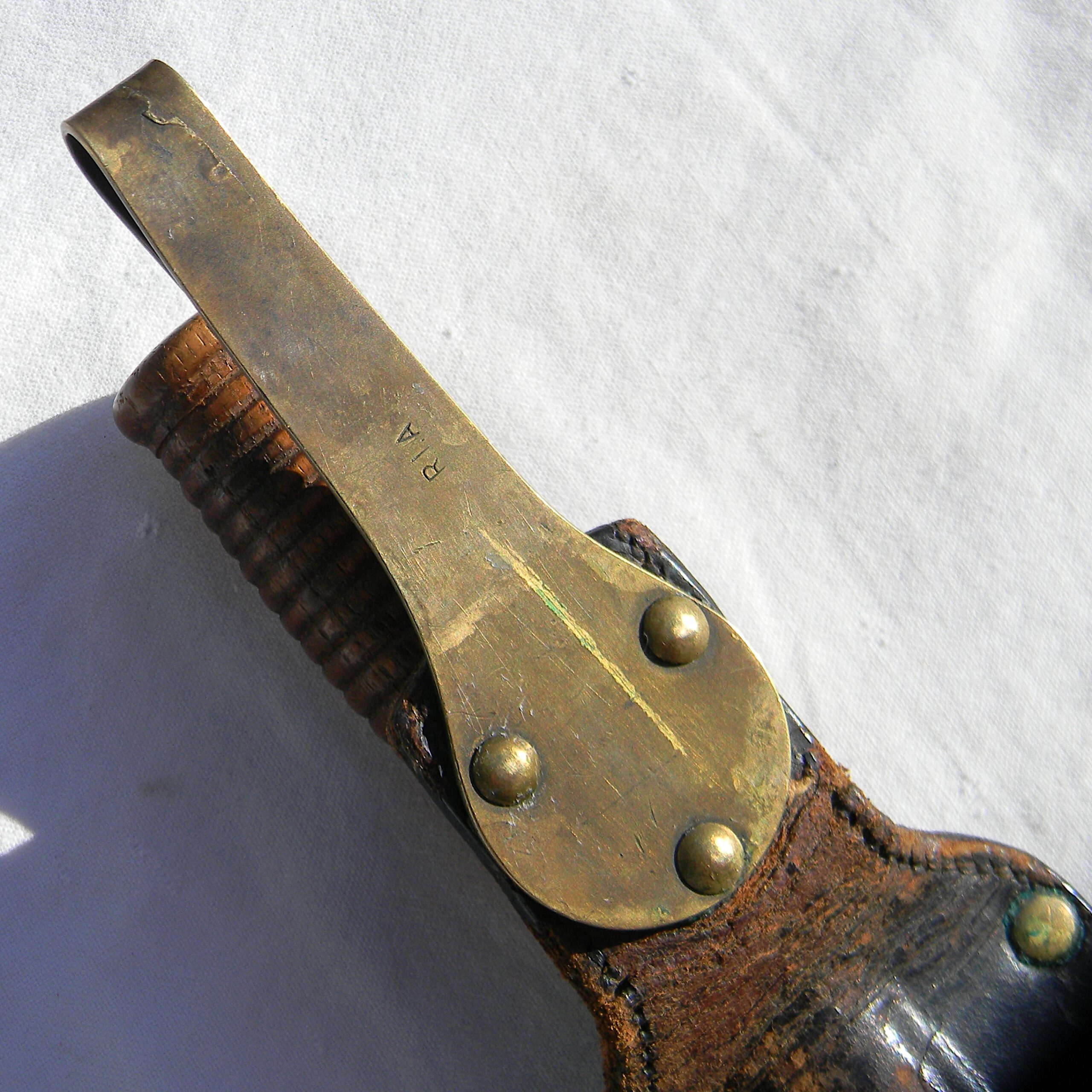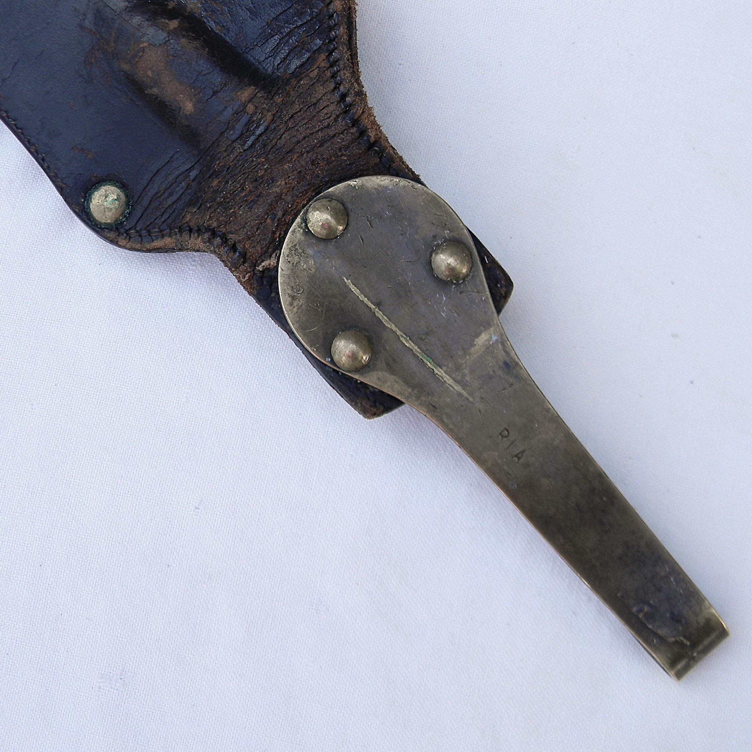 The knife is about s 13-1/2” / 34.2 cm overall; the blade is about 8-3/8” / 21.3 cm long and 2” / 5 cm wide. This knife used, but it is in better-than-average condition – the edge has been gently re-sharpened, the tip is intact. No edge nicks, chips, or ding marks on the blade’s spine; some minor surface rust near the edge is noted for accuracy. Original “type 2” Watervliet Arsenal scabbard with a belt hook is in very condition with typical fraying on the leather portion of the belt hanger. The original, “long swivel type” Watervliet Arsenal scabbard was modified and shortened in the early 1880s by Rock Island Arsenal – brass hook is stamped RIA on the back side. The scabbard is in very good condition for the type – all stitching and metal parts are intact, no dings on the brass, the leather body is in very good overall condition for its age. Brass throat and the belt hook haven’t been cleaned; nice original golden-honey patina throughout; some typical green oxidation residue between the brass and leather is noted for accuracy (cleanable).