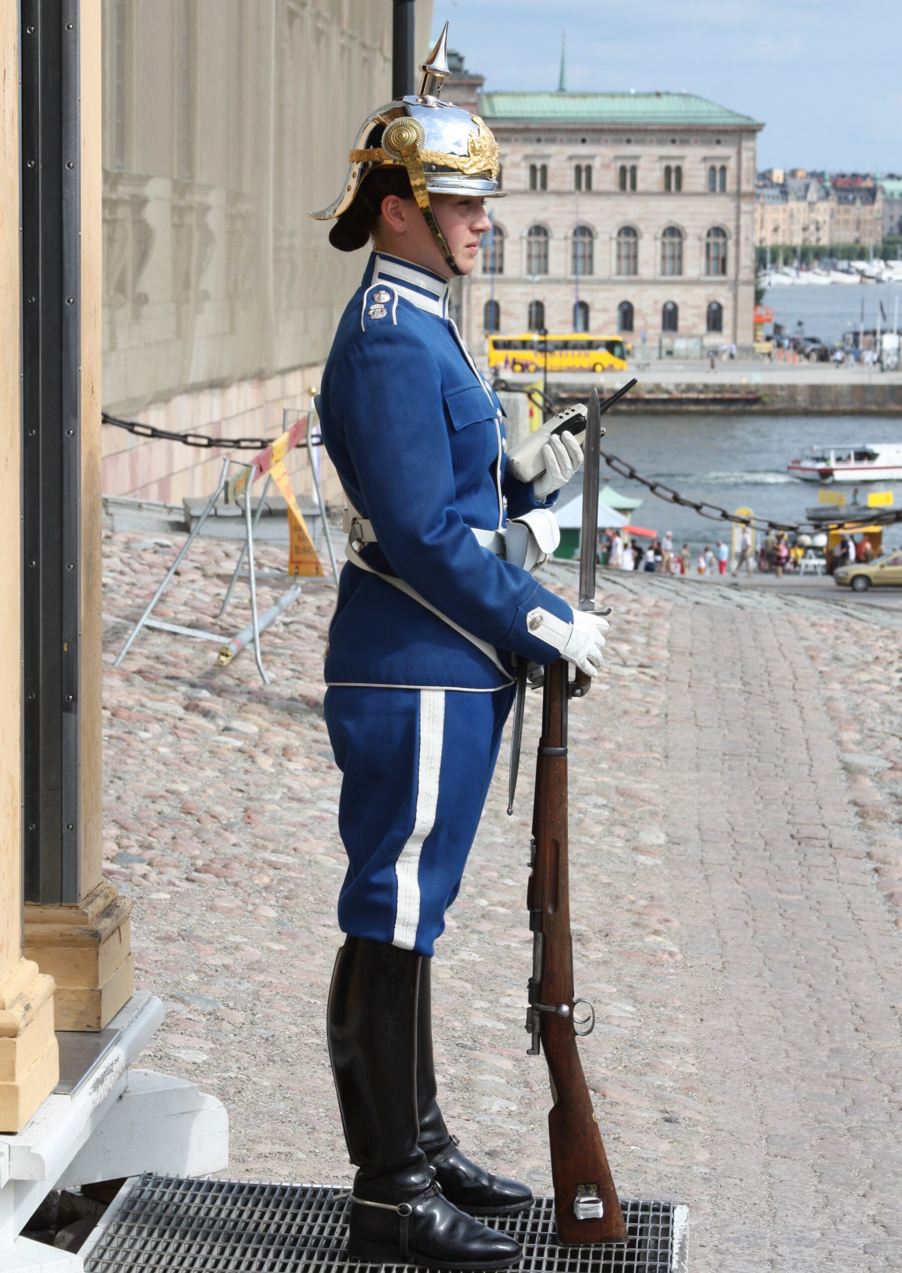 Original pre-WW2 era manufacture M1914 bayonet for the Swedish M1894-14 6.5 mm caliber Mauser Carbine in scarce unused condition. This is an early type that was manufactured by Eskilstuna Iron Manufacturing, Inc (stamped EJ “anchor” AB on ricasso); this type is still in use today as intended by the Swedish Royal Guard – see photos. This is the 13-inch blade specimen, during WW2 the same type would be used as the standard bayonet for the 9 mm Carl Gustaf Kulsprutepistol M1945C (Submachine Gun M1945C). The Swedish M1945C is known in the USA as the Swedish-K; it’s a well-made and reliable piece of equipment 🙂