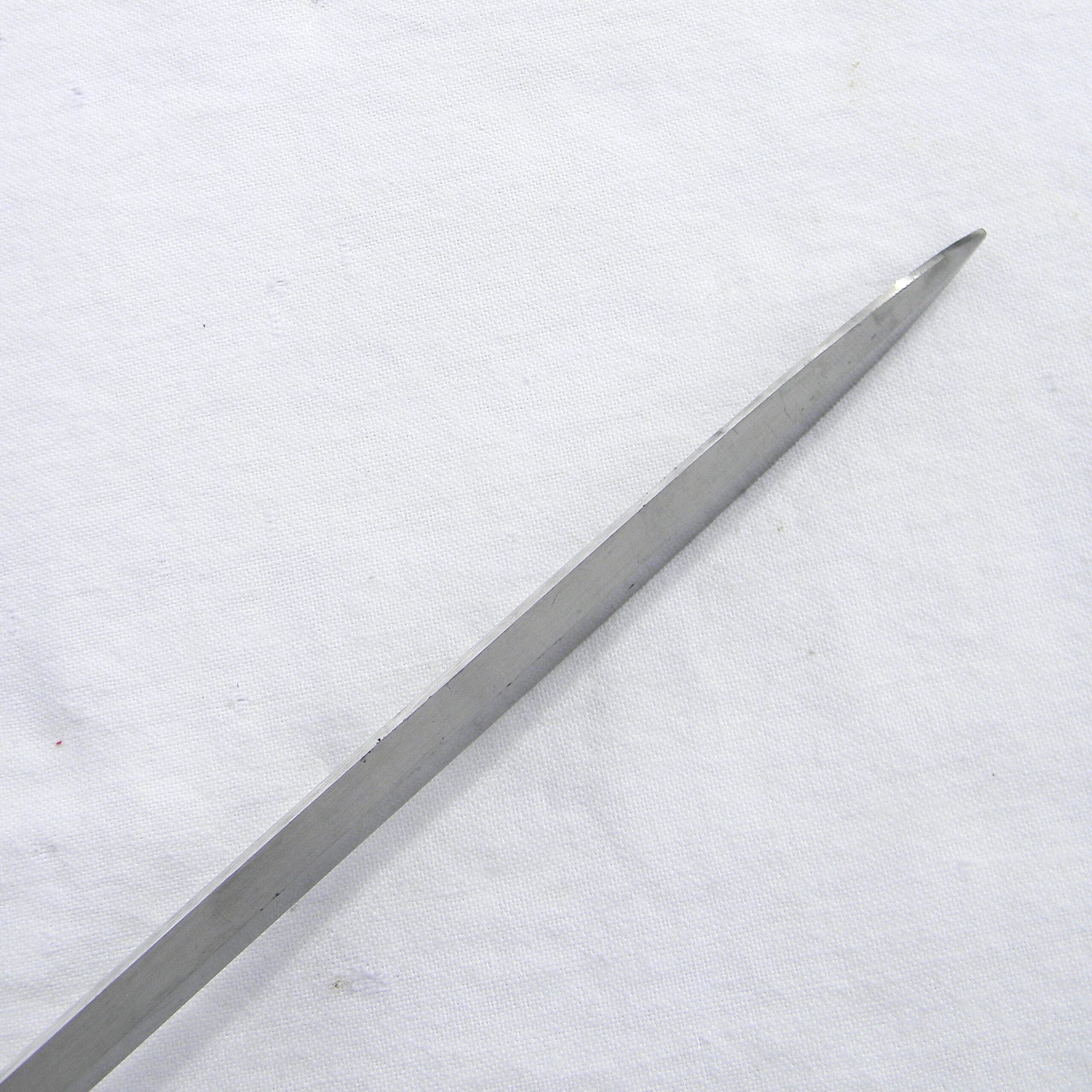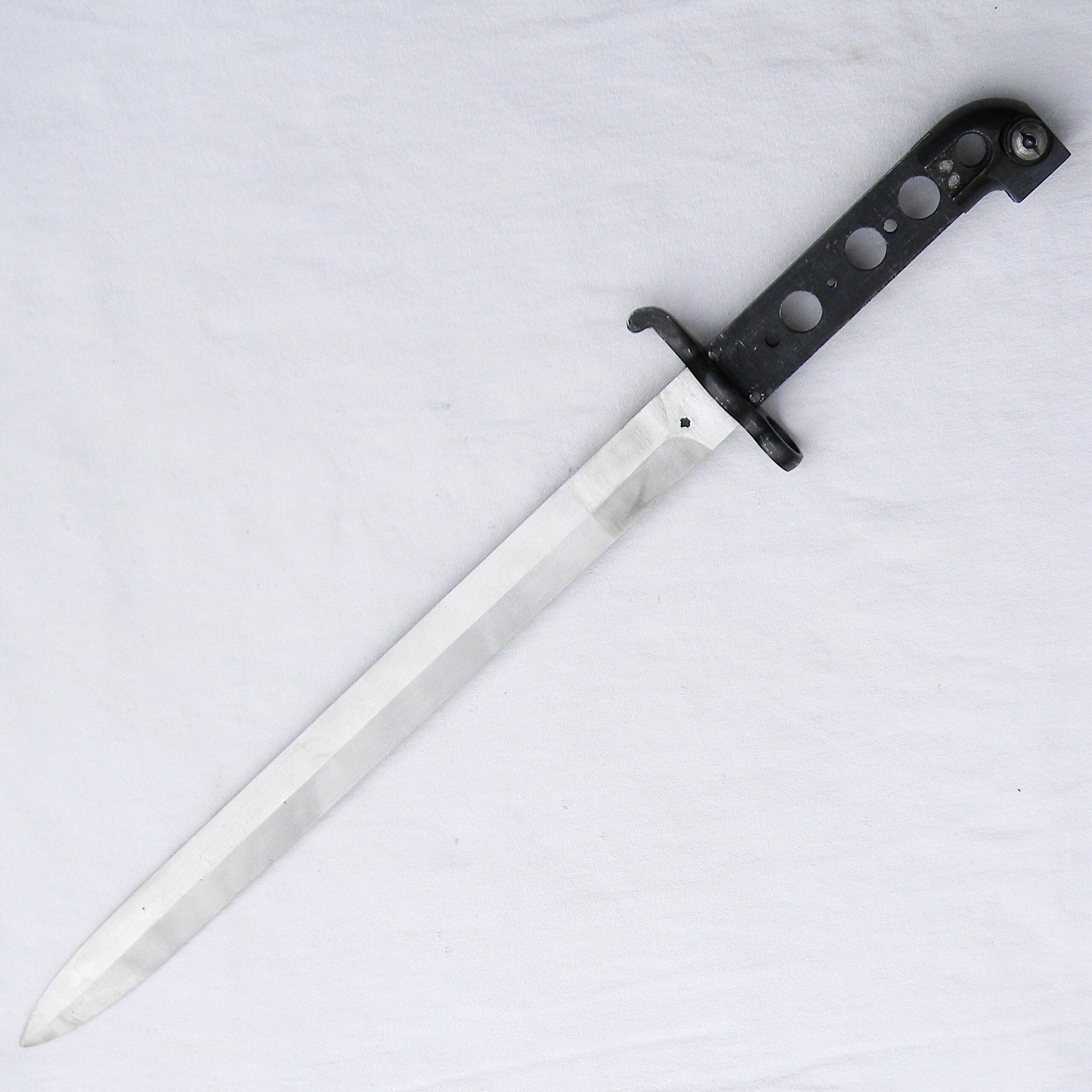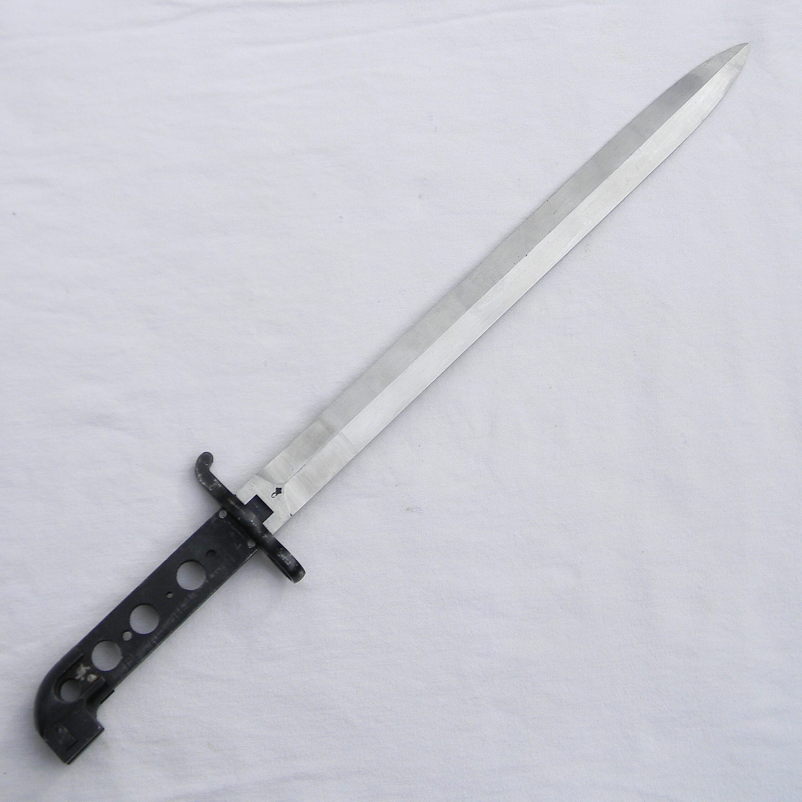This is a superb quality manufacture bayonet with clean and crisp lines and about all of the original white finish remaining. This bayonet is stamped C “anchor” on ricasso. All metal pars are stamped with the royal Swedish crown arsenal proof marks. The muzzle ring is intact; no edge nicks or dings on the blade; no typical contact marks on the pommel. These specimens don’t have wood grips installed; other than that these bayonets are fully finished and assembled. Bayonet release mechanism is nice and tight and 100% functional. The bayonet is about 18-1/8″ / 46 cm overall; the blades is about 13″ / 33 cm long; original blunt factory edge has no nicks or dings, the tip is intact. There is no scabbard.