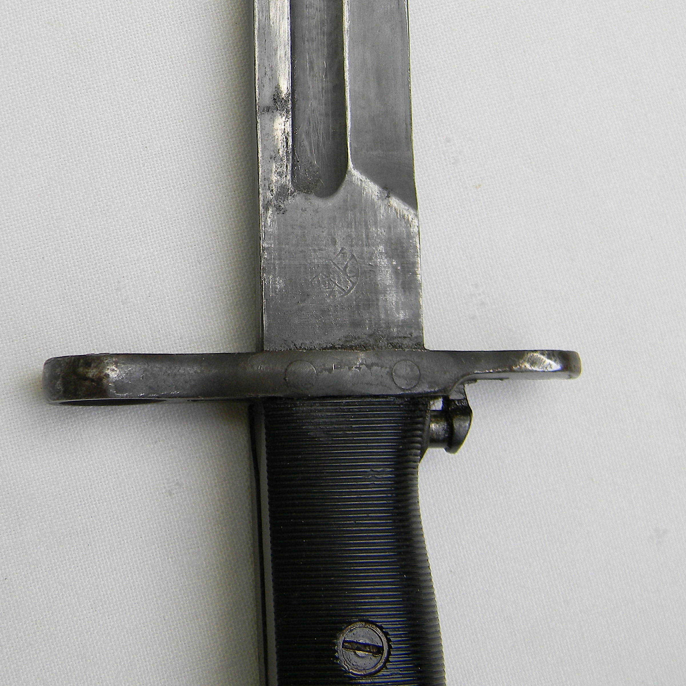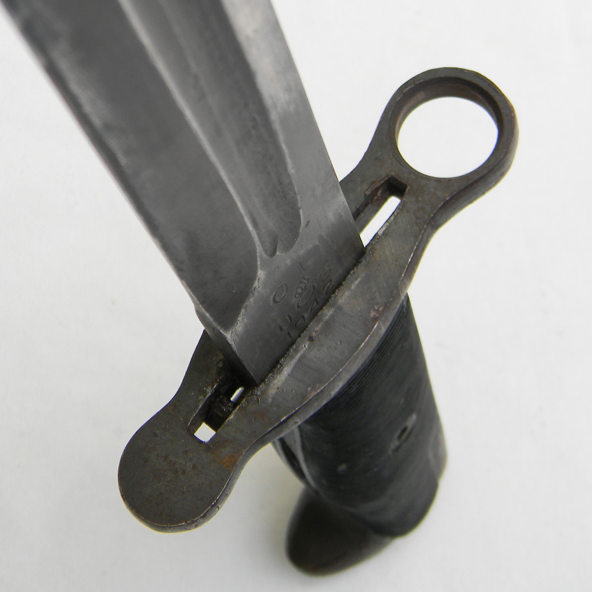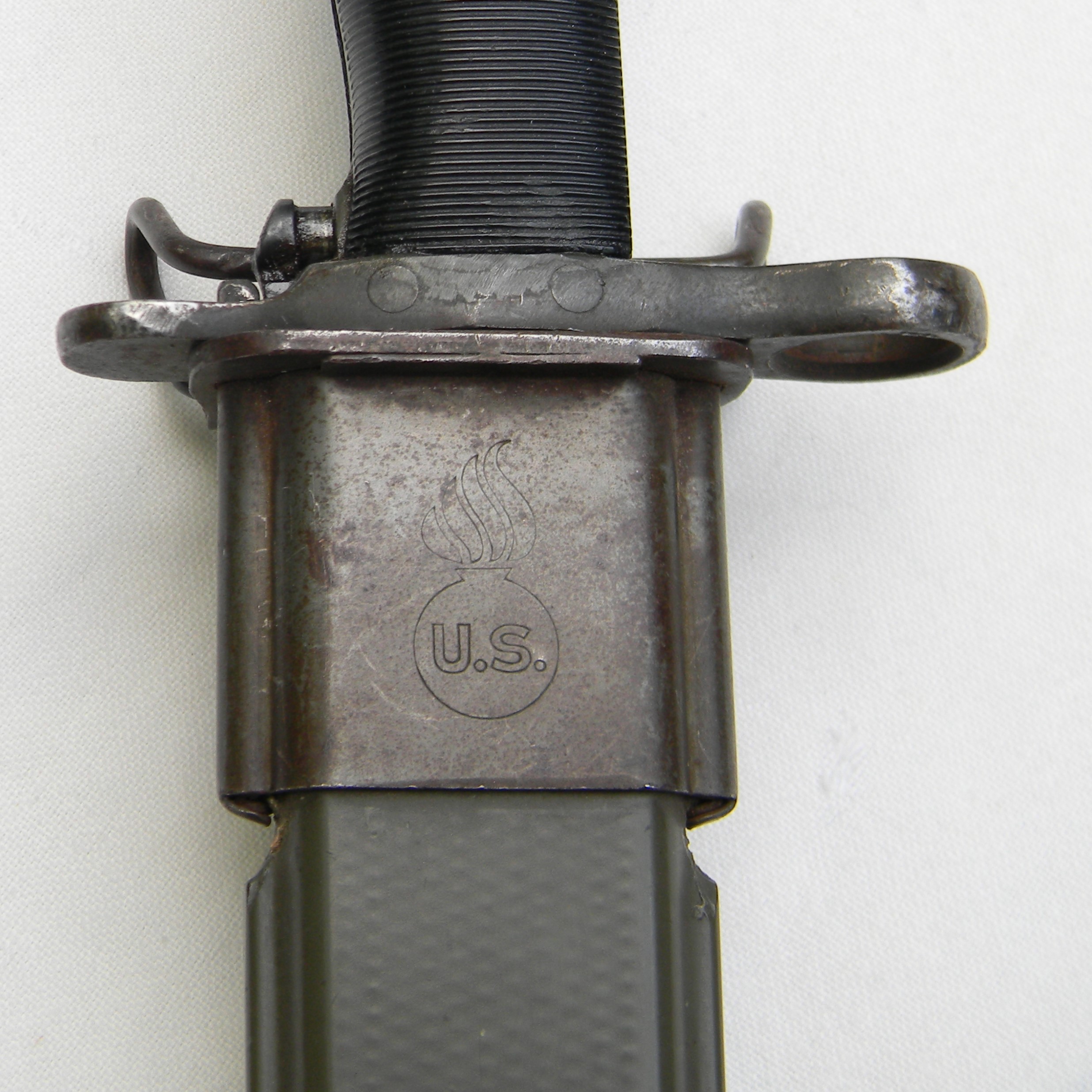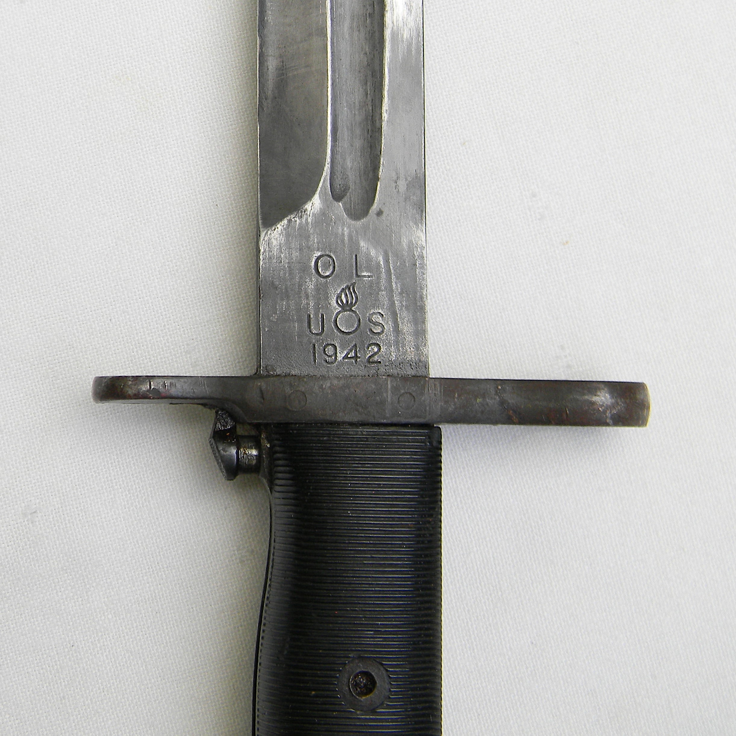 This is a well-made bayonet with crisp lines and a well-defined edge. Ricasso is sharply stamped OL / US “flaming bomb”/ 1942 on one side; a weak old-style round “crossed cannons” cartouche stamp on the other. This bayonet is only slightly used; the blade has been gently re-sharpened, it is very sharp still; the tip is intact. No typical ding marks on the spine or the muzzle ring; some contact marks on the pommel are noted for accuracy. Original black plastic handle grips are near-perfect; all handle parts are tight with no play. The scabbard/bayonet release mechanism is excellent and 100% functional. This specimen is in better than average condition for the type.