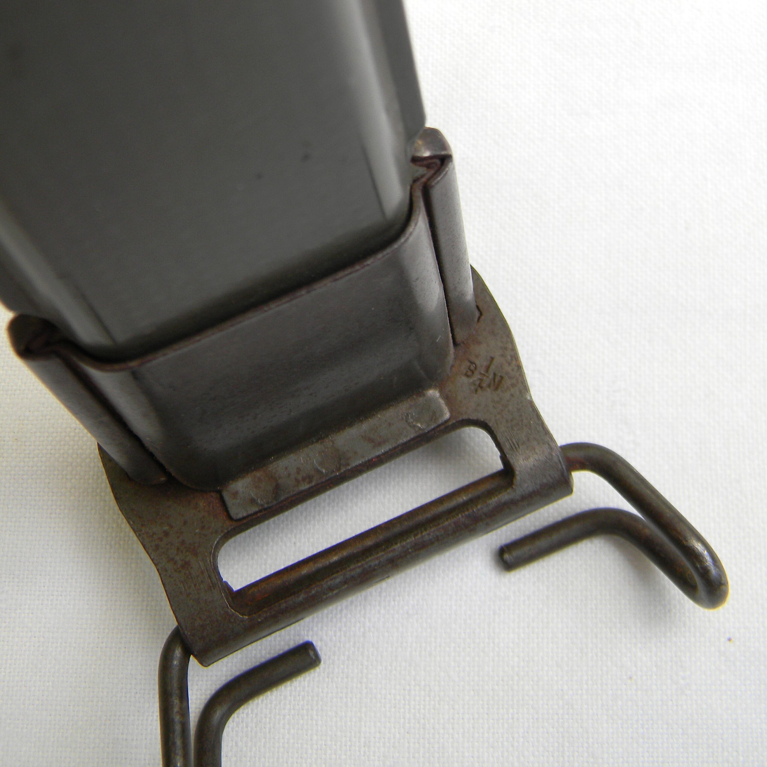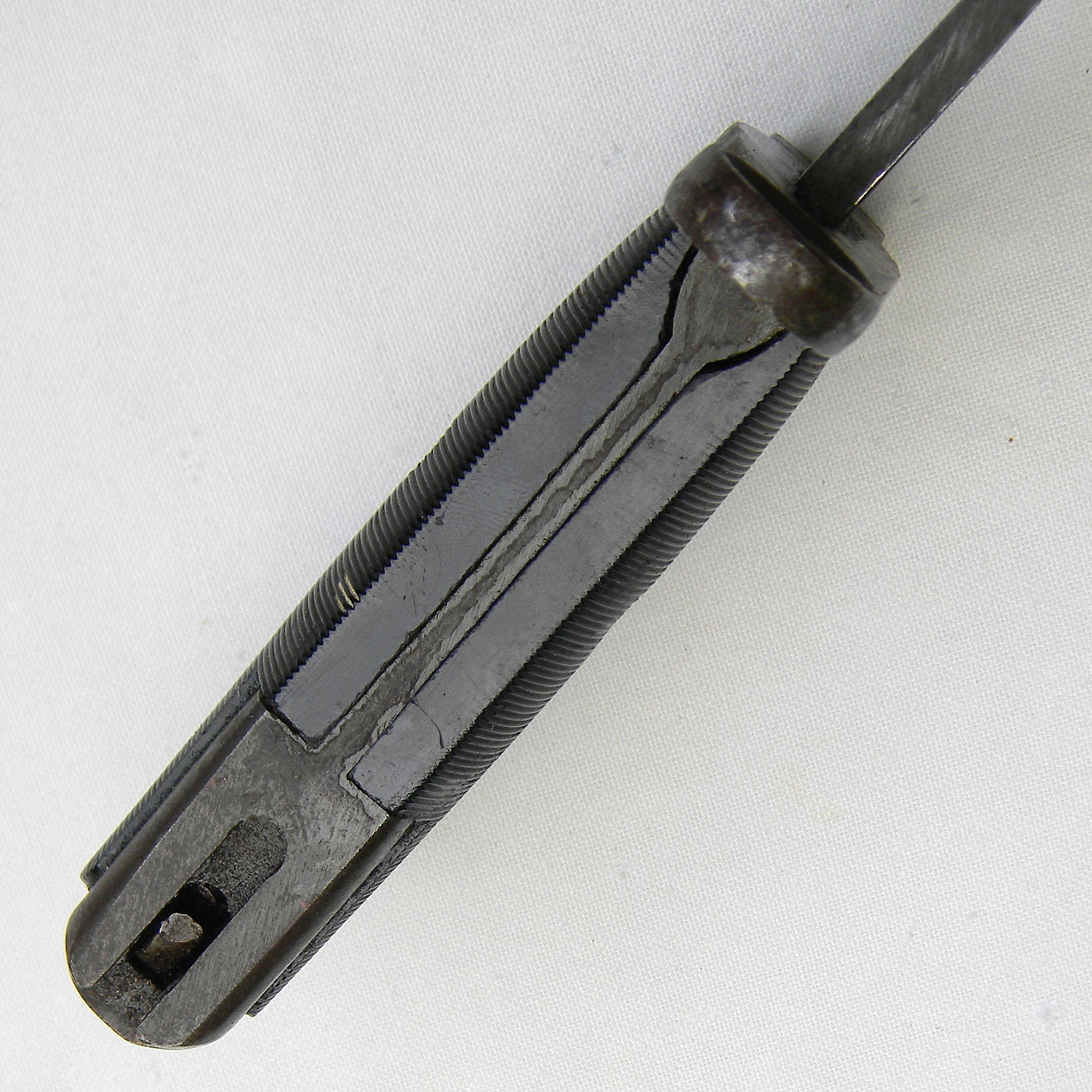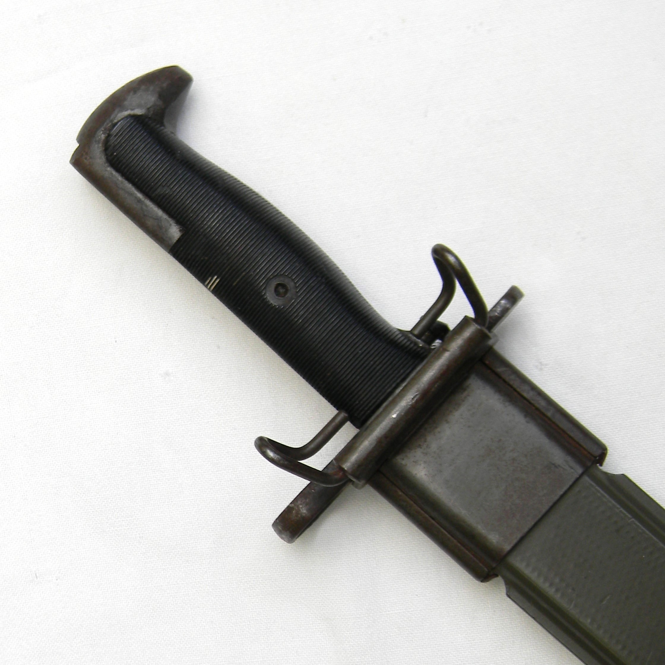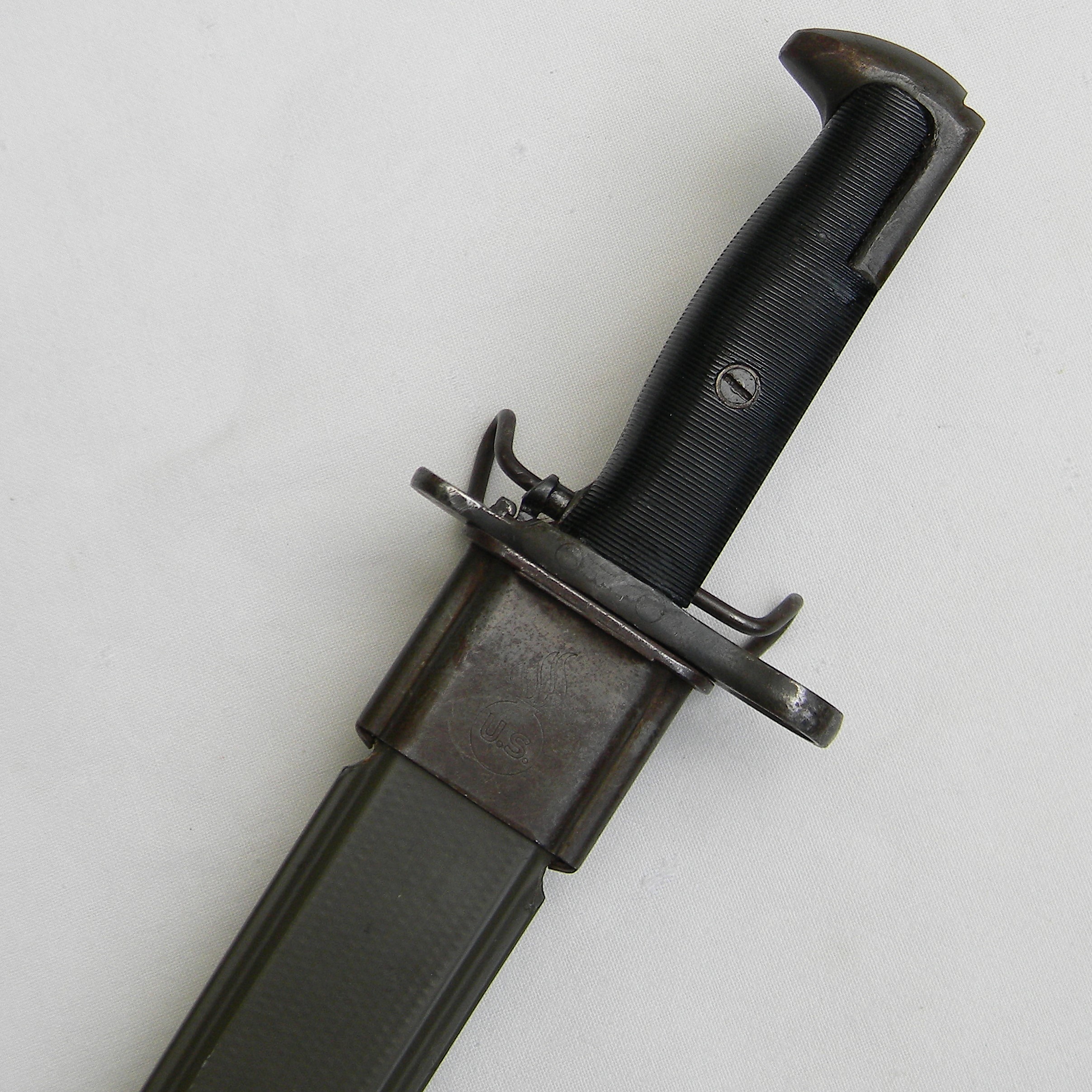 This is a well-made bayonet with crisp lines and a well-defined edge. Ricasso is sharply stamped OL / US “flaming bomb”/ 1942 on one side; a weak old-style round “crossed cannons” cartouche stamp on the other. This bayonet is only slightly used; the blade has been gently re-sharpened, it is very sharp still; the tip is intact. No typical ding marks on the spine or the muzzle ring; some contact marks on the pommel are noted for accuracy. Original black plastic handle grips are near-perfect; all handle parts are tight with no play. The scabbard/bayonet release mechanism is excellent and 100% functional. This specimen is in better than average condition for the type.