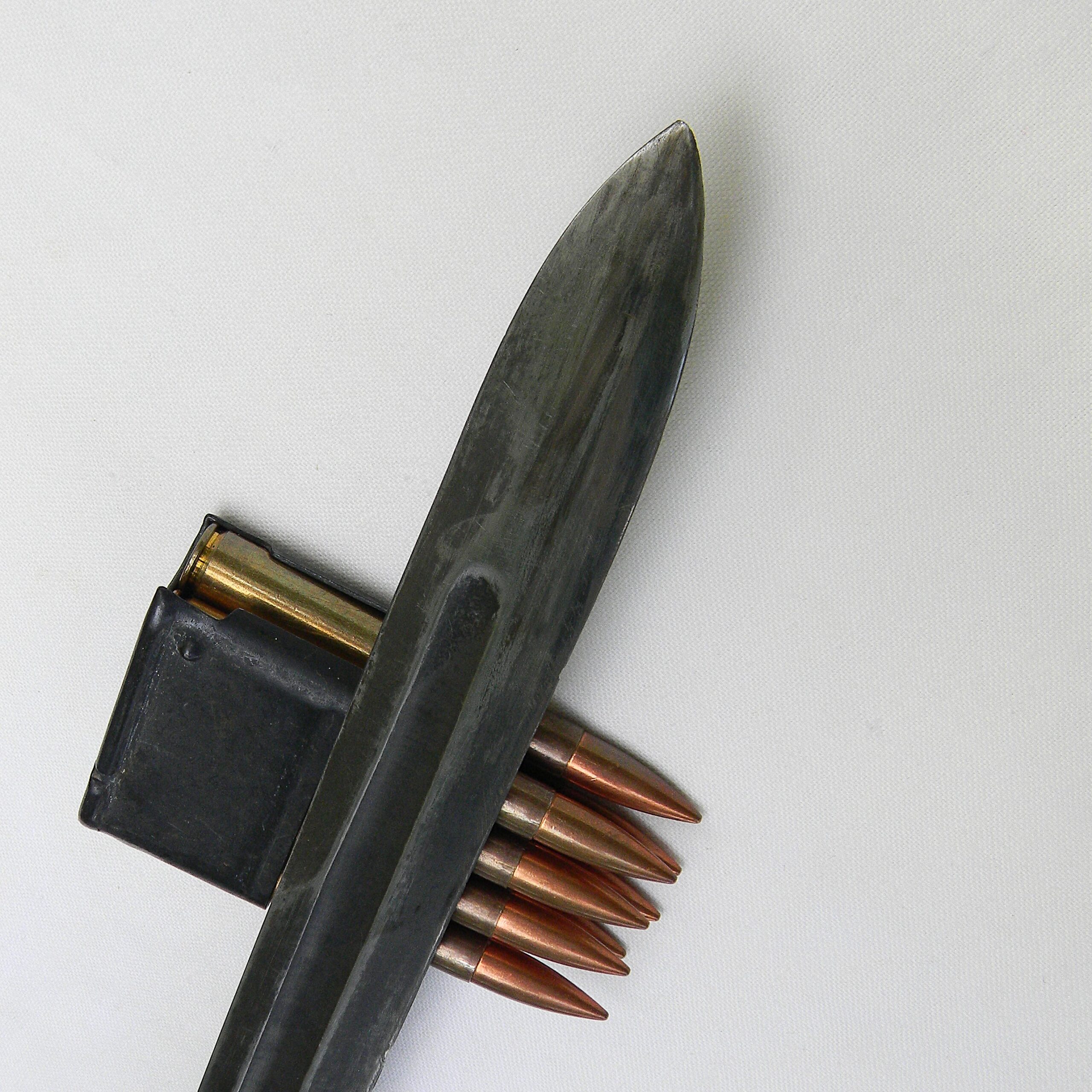 This scarce WW2 Oneida M1905 bayonet has not been cleaned or tampered with in any way, it is in 100% original “as is” condition. These are the actual photos; Garand clips are not included with the lot 😉 I have a few scarce WW1 and WW2 bayonets, fighting knives, daggers and trench knives available for sale – please take a look in my store’s Militaria section.