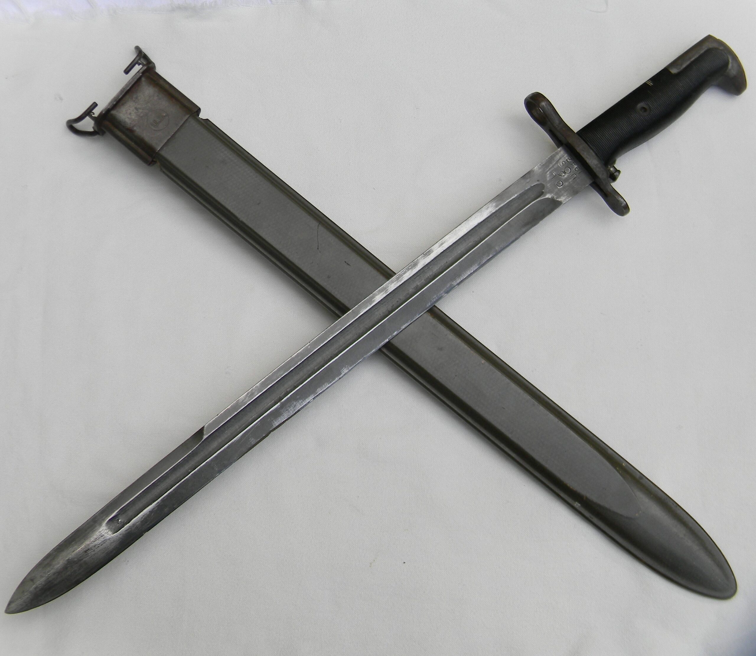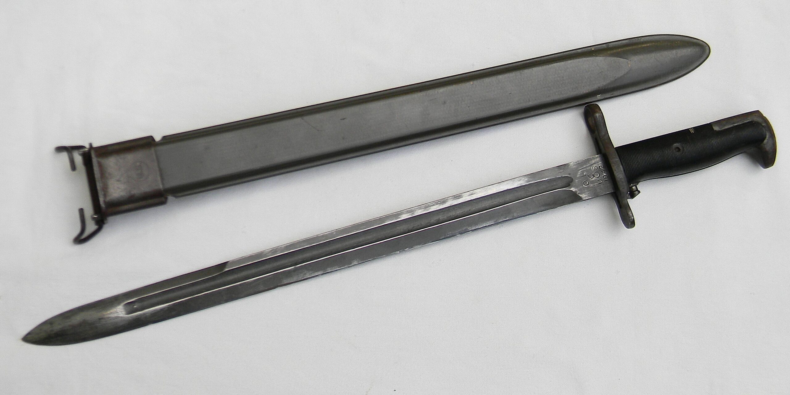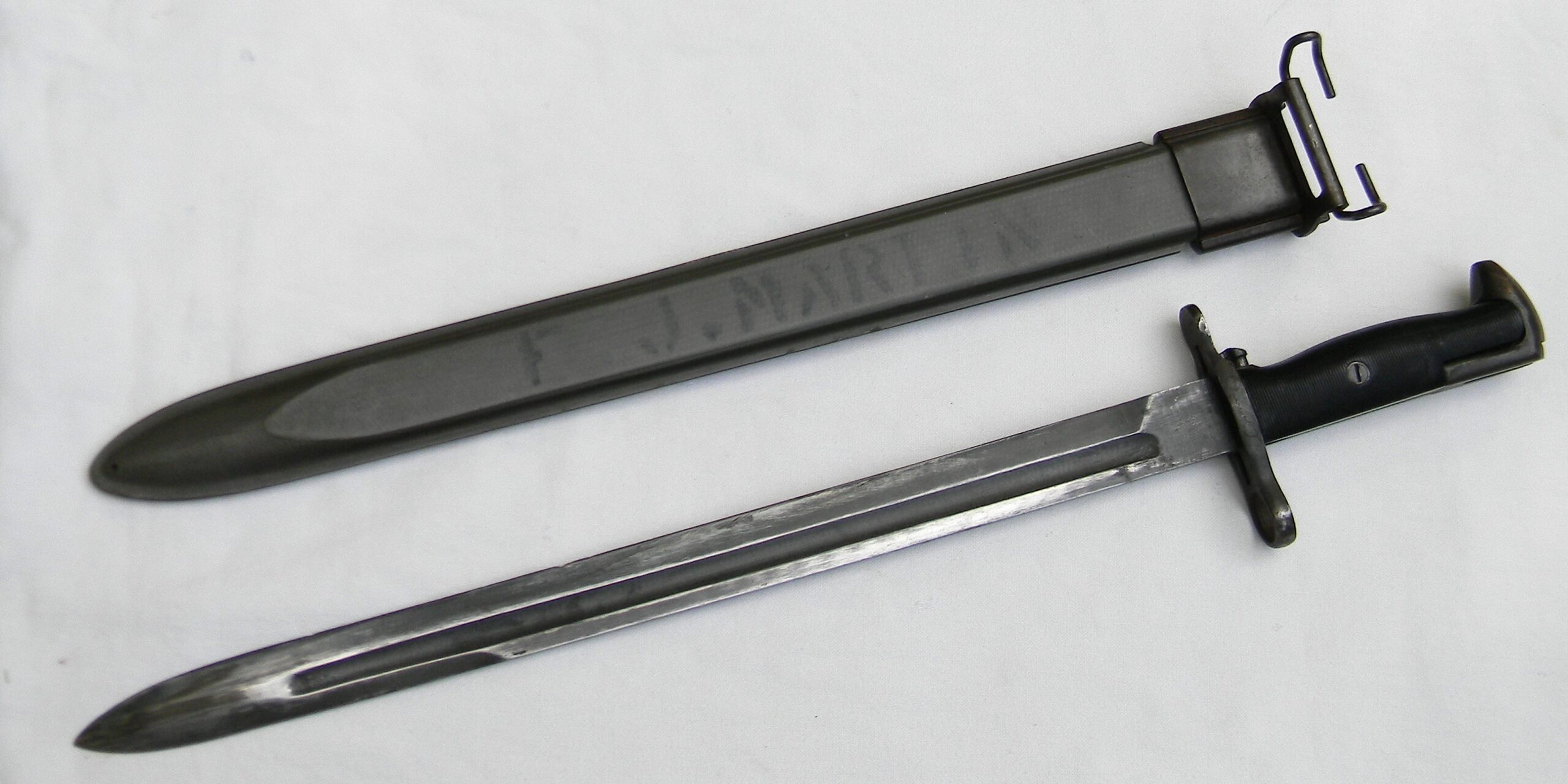 The bayonet is about 20-3/8″ / 51.7 cm overall; the blade is about 15-3/4″ / 40 cm. Original “long” composition scabbard with the US/flaming bomb arsenal logo on the steel throat. The scabbard is in excellent condition; the back is stamped F.J. MARTIN in large bold font. The underside plate is marked B1/4N. Overall, this rare 1942-dated WW2 Oneida M1905 bayonet is in very much serviceable condition still; you will not be disappointed. A desirable and highly collectible type; these uncut Oneida M1905s are rare this nice and complete.