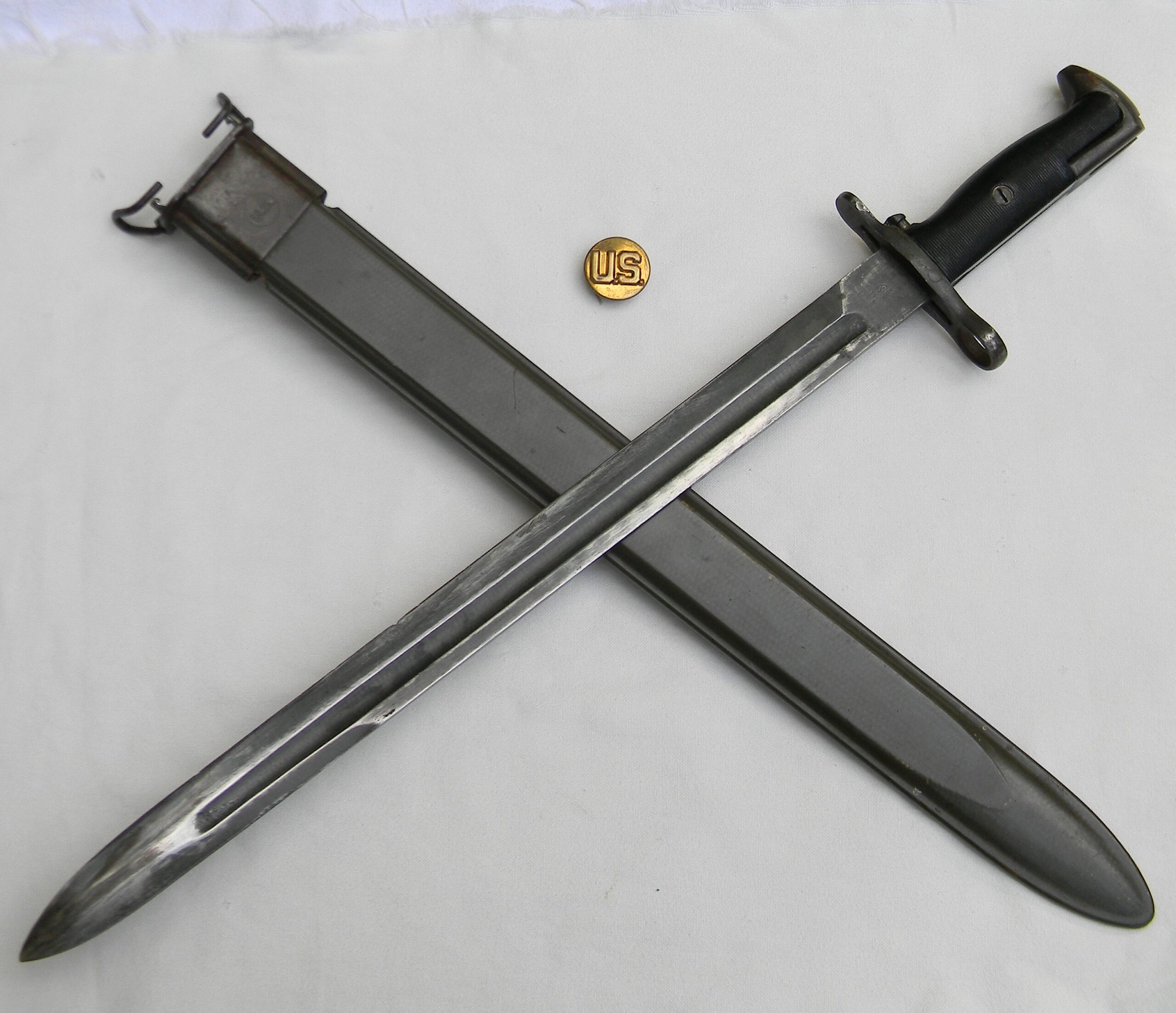 Original WW2 era M1905 bayonet manufactured in 1942 by Oneida Ltd (marked OL on ricasso); scarce uncut 16″-blade specimen in rare only slightly used condition. A scarce bayonet type in general – mid-war most of the original M1905 bayonets were cut-down and re-furbished as the “short pattern” 10-inch blade bayonets often referred to as M1942. Also, this maker – Oneida Ltd – produced just 235,000 M1905 bayonets before it was dropped from the bayonet program altogether in November 1943. Oneida had asked the War Department to be released from the bayonet manufacture program as it simply could not keep its workers steadily employed because of the erratic nature of the stop-ang-go manufacture & bayonets’ recalls for the blade shortening. Most of Oneida’s original “long” 16-inch bayonets have been shortened during the war; uncut OL M1905s are hard to come by nowadays, especially in better grades.