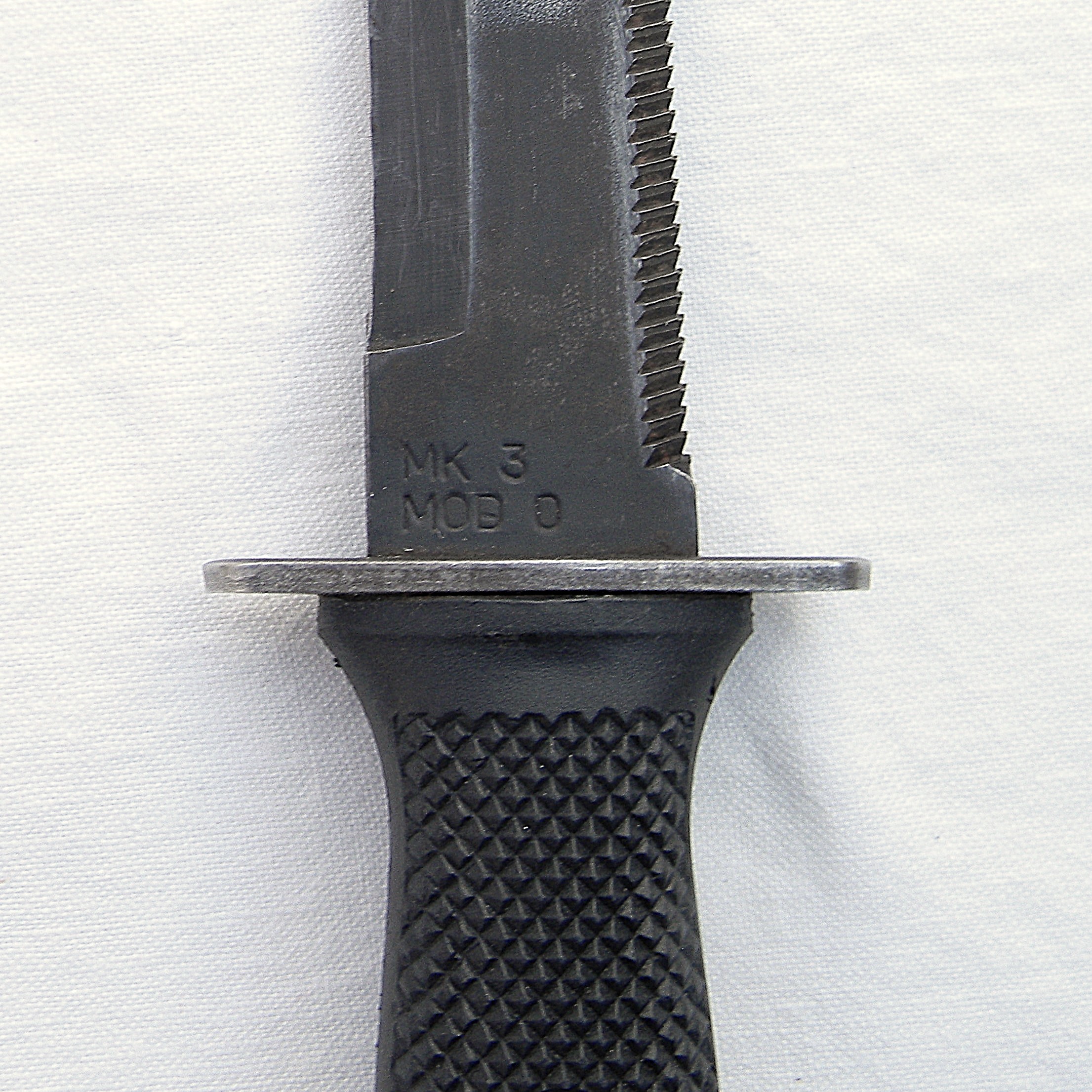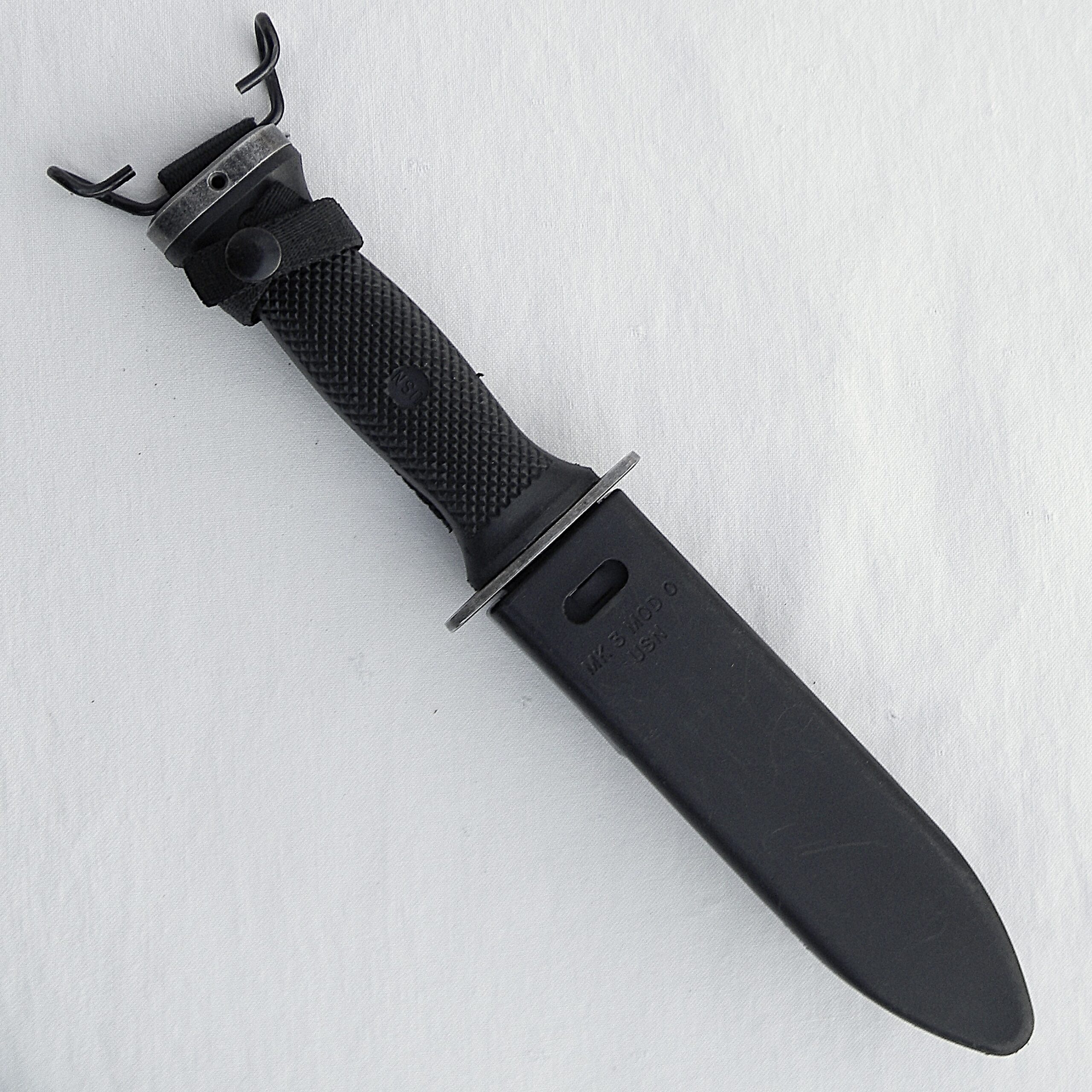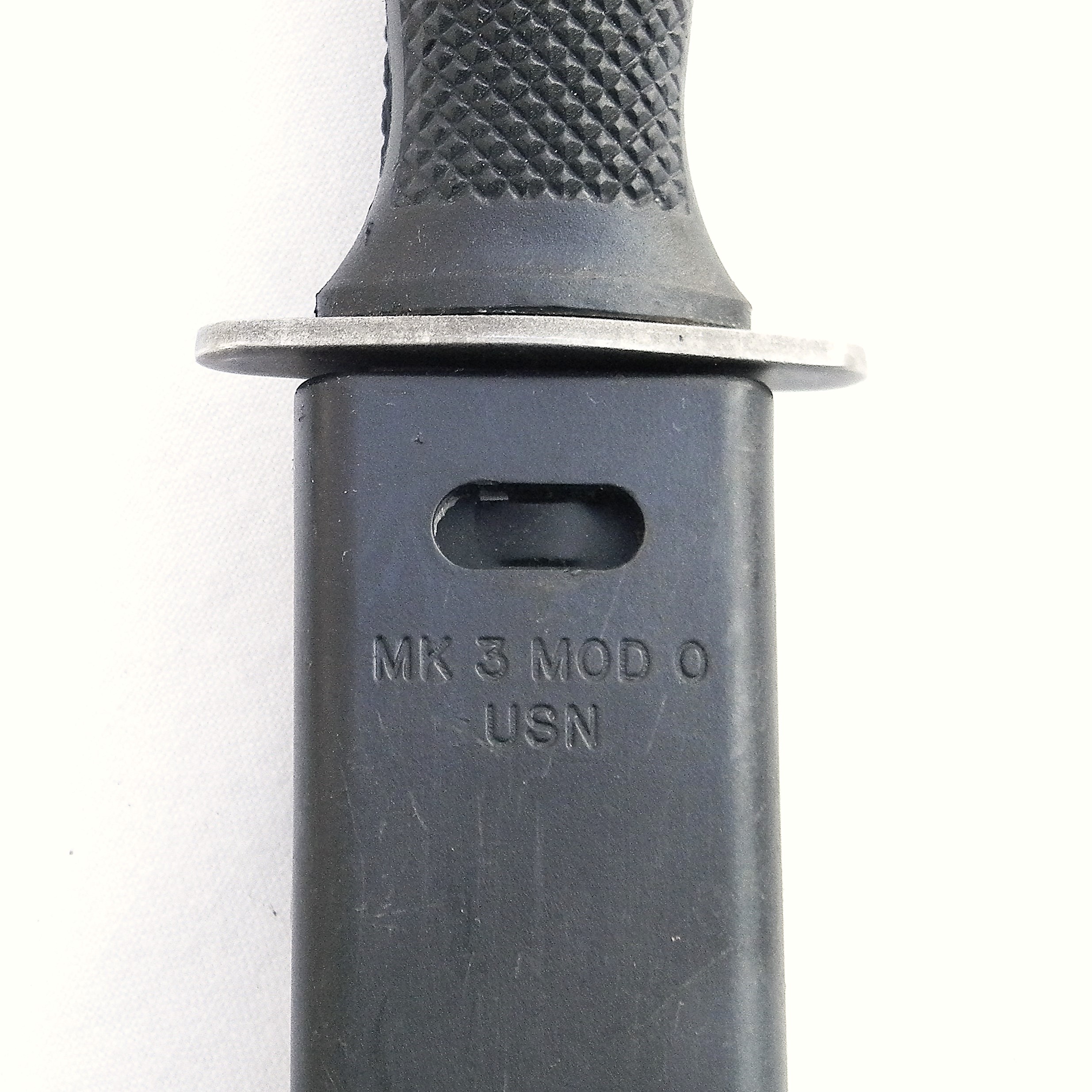 The US Navy issue “Mark 3, Model 0” dive knife was manufactured circa 1980th in the US by Ontario Knife Company. This type was in service from 1975 till early 2000s and in use by the USN SEAL teams in the field. If I’m not mistaken, the left-over stock of MK3s are still being used during training by the USMC Reconnaissance Marines at the Combatant Divers Course near Panama City, FL. This exact type is illustrated on page 333 of THE MILITARY KNIFE & BAYONET book by Homer M. Brett – a well-established expert an author of many books on the subject of US military edged weapons (see the book’s page scan attached).