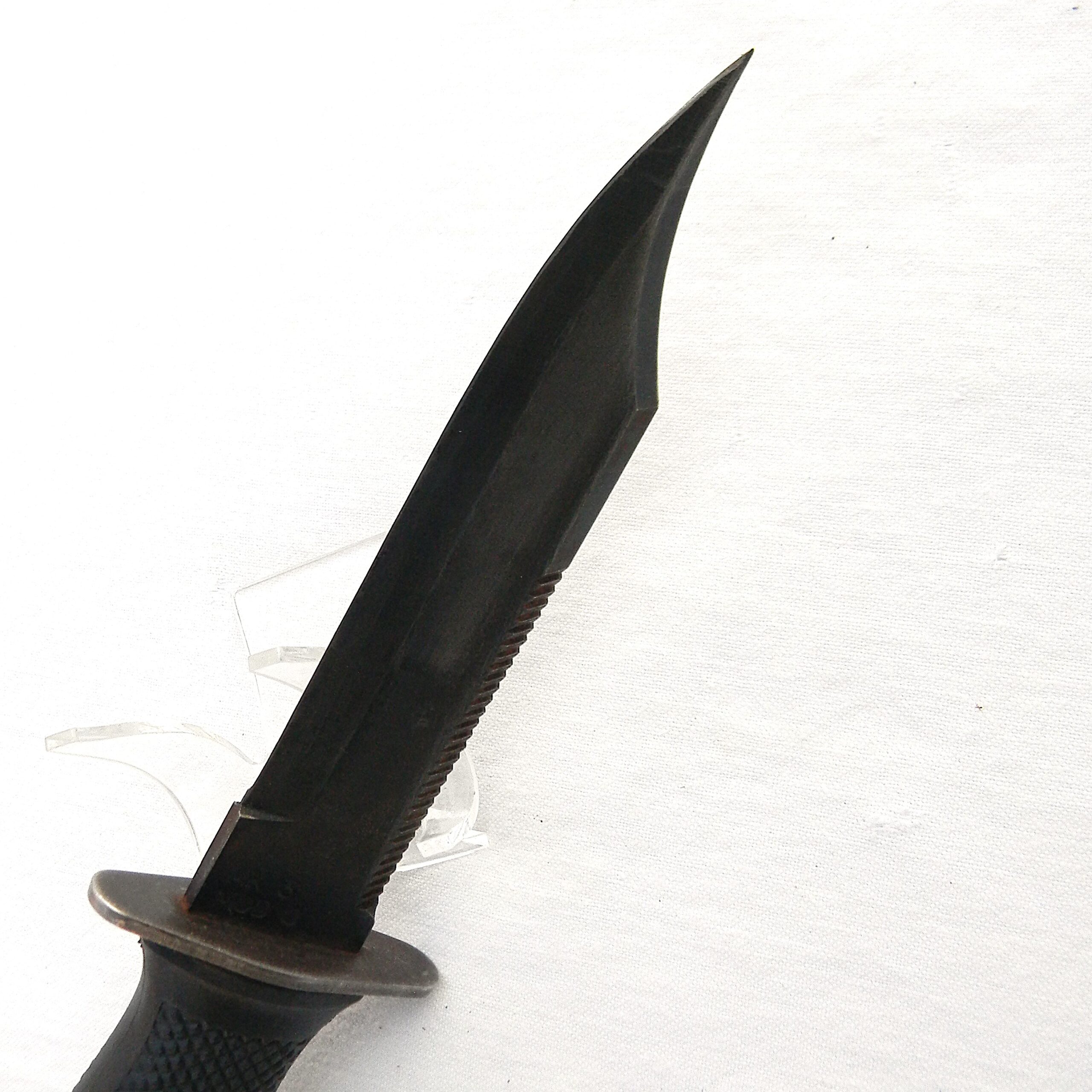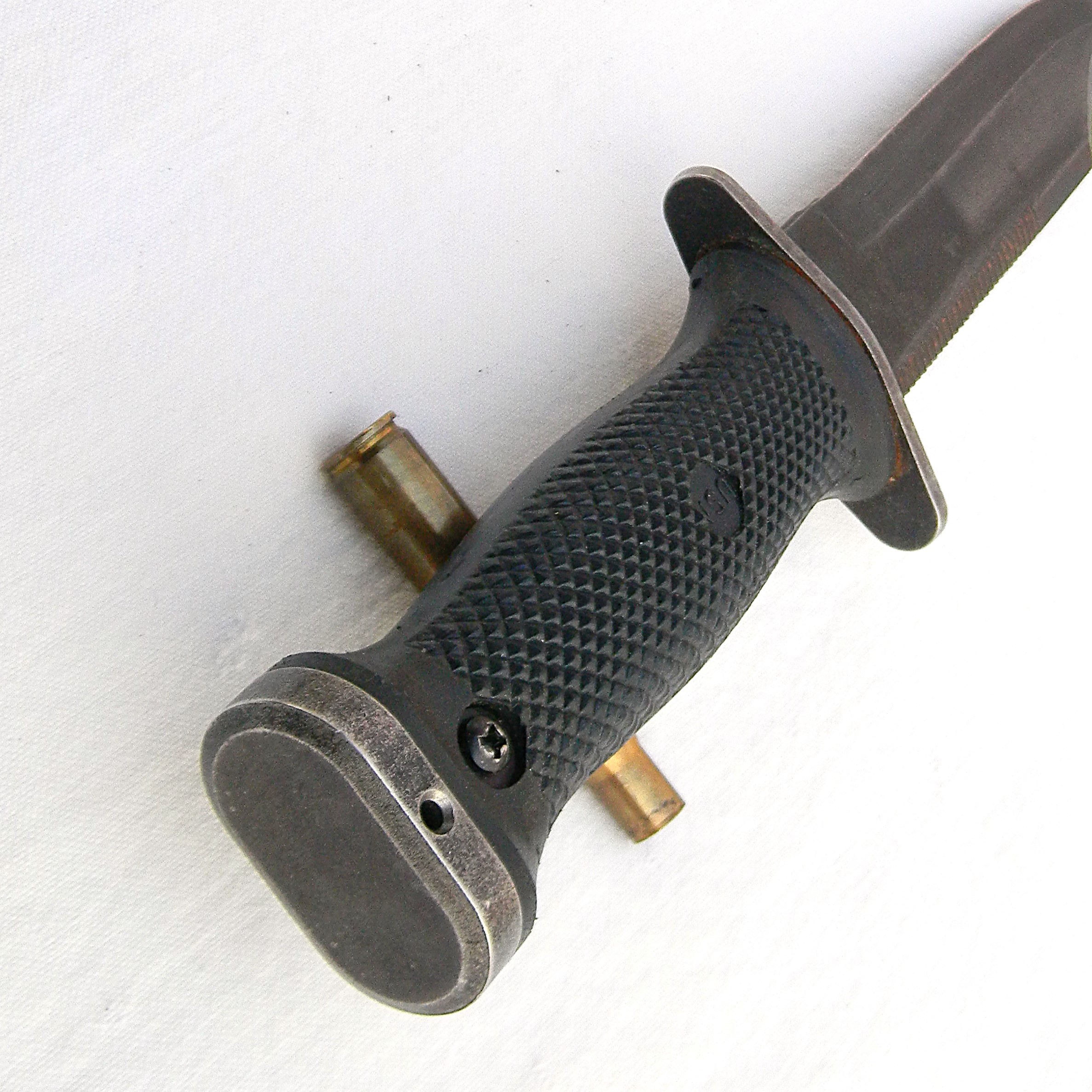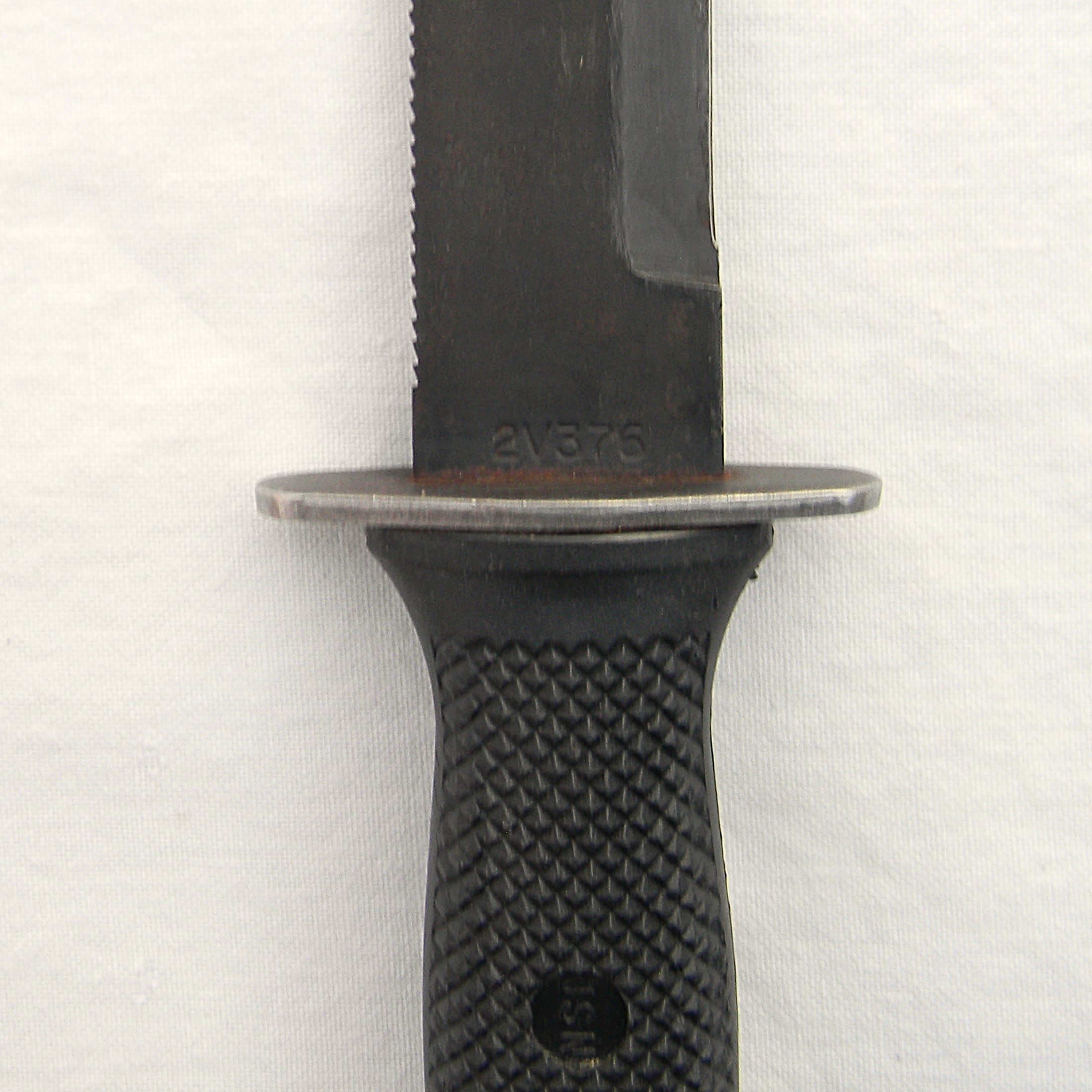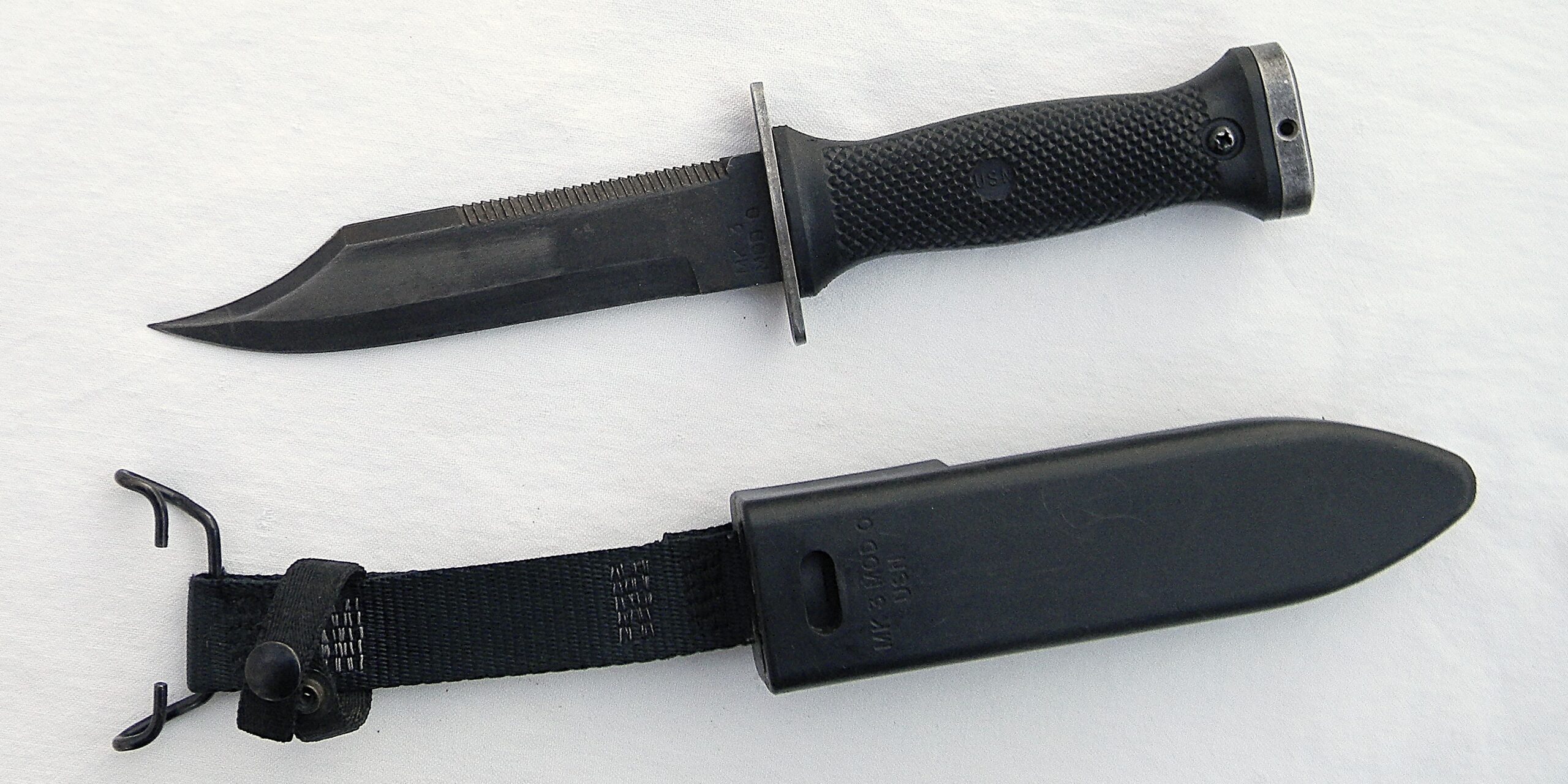 The US Navy issue “Mark 3, Model 0” dive knife was manufactured circa 1980th in the US by Ontario Knife Company. This type was in service from 1975 till early 2000s and in use by the USN SEAL teams in the field. If I’m not mistaken, the left-over stock of MK3s are still being used during training by the USMC Reconnaissance Marines at the Combatant Divers Course near Panama City, FL. This exact type is illustrated on page 333 of THE MILITARY KNIFE & BAYONET book by Homer M. Brett – a well-established expert an author of many books on the subject of US military edged weapons (see the book’s page scan attached).