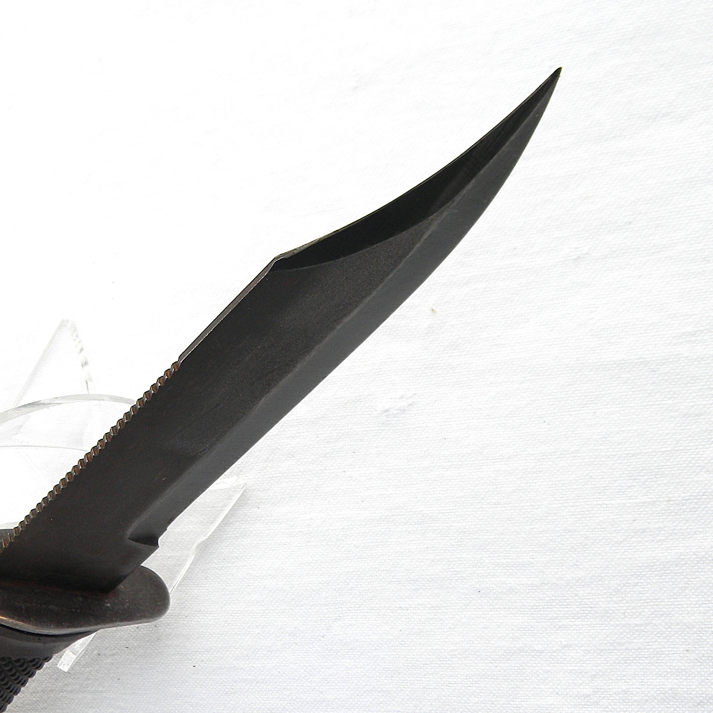This is a well-made and practical knife; it’s the perfect size and weight for what it was designed for. The knife is gently used with just a few light scratches and abrasions on the edges and ridges; the blade is 440 stainless tempered to 49-54 HRC with black iron oxide for the non-reflective finish and added rust-resistance. The handle is molded black plastic – it’s in excellent shape with no cracks or chips; heavy-duty hammer-like pommel is a chunk of solid hardened steel; all parts are tight with no play. The knife is about 10-3/4″ / 27.3 cm overall; the blade is about 5-7/8″ / 15 cm long. The blade has not been re-sharpened; original factory edge is razor-sharp; the tip and the spine saw are intact; a few abrasions on the edges and ridges are noted for accuracy. Ricasso is marked MK 3 / MOD 0 on one side, 2V376 on the other. Original USN MK3 MOD 0 molded black plastic scabbard with nylon webbing and brass wire belt hanger coated with black iron oxide. The scabbard is also unused; black nylon tie-down cord is included as well.