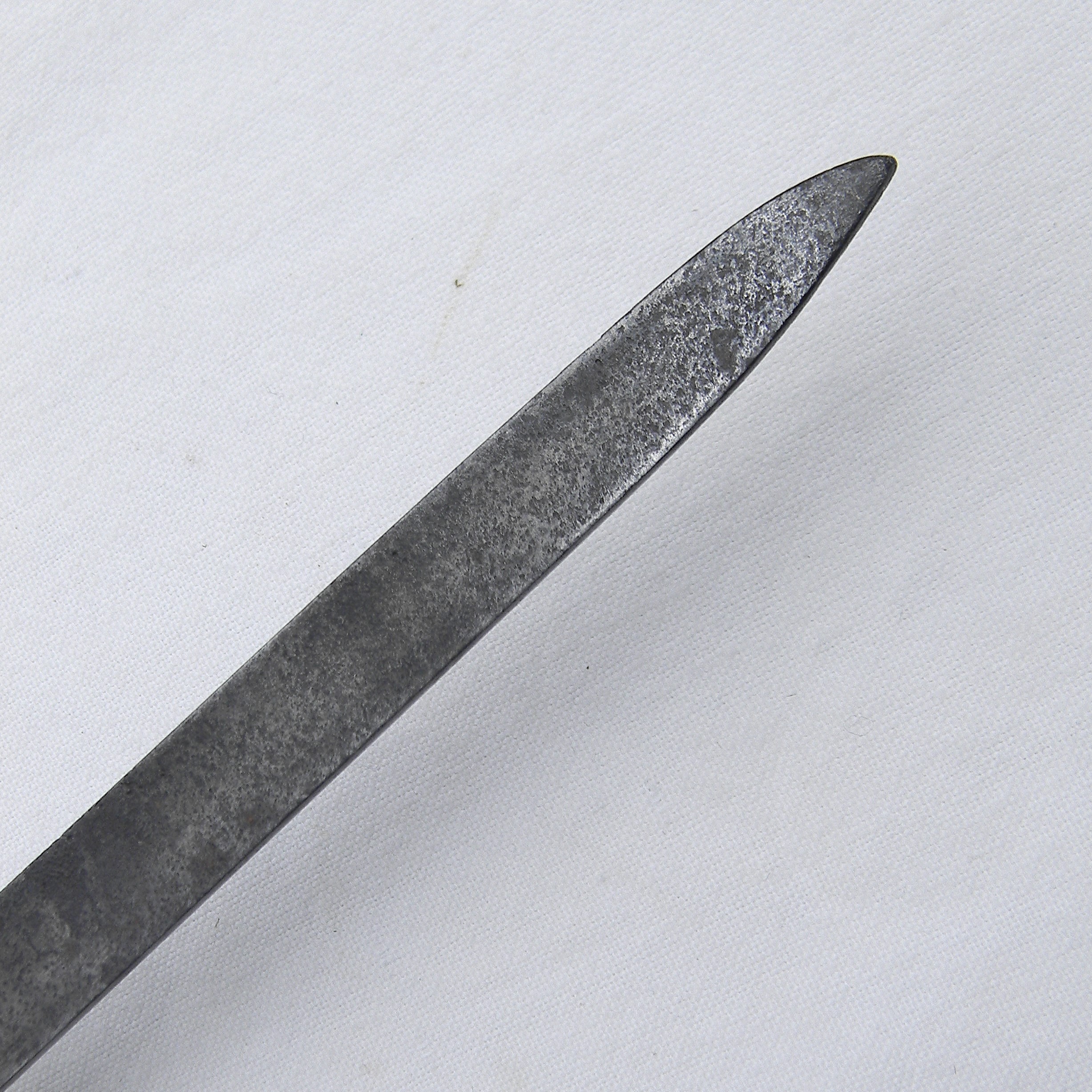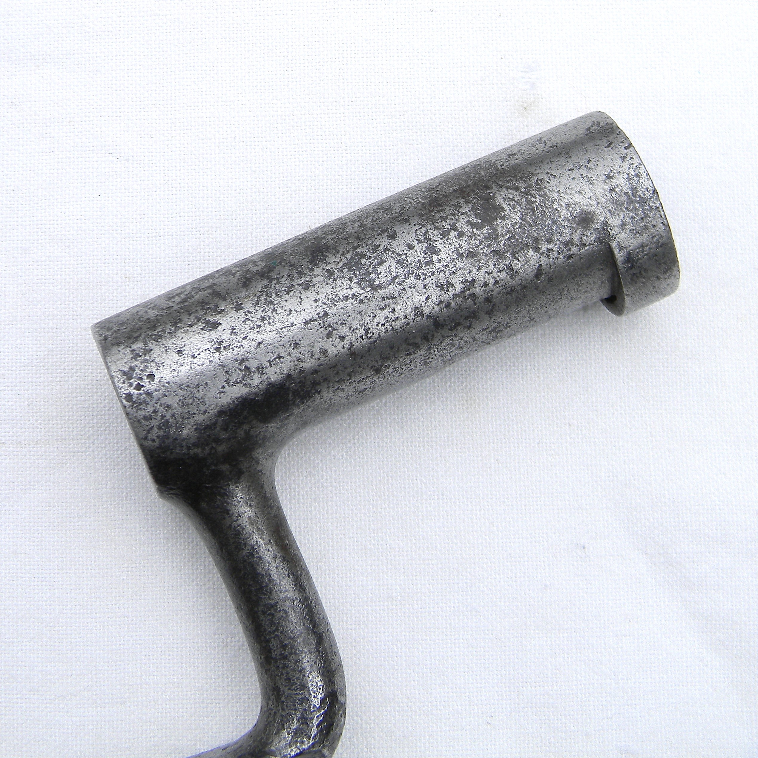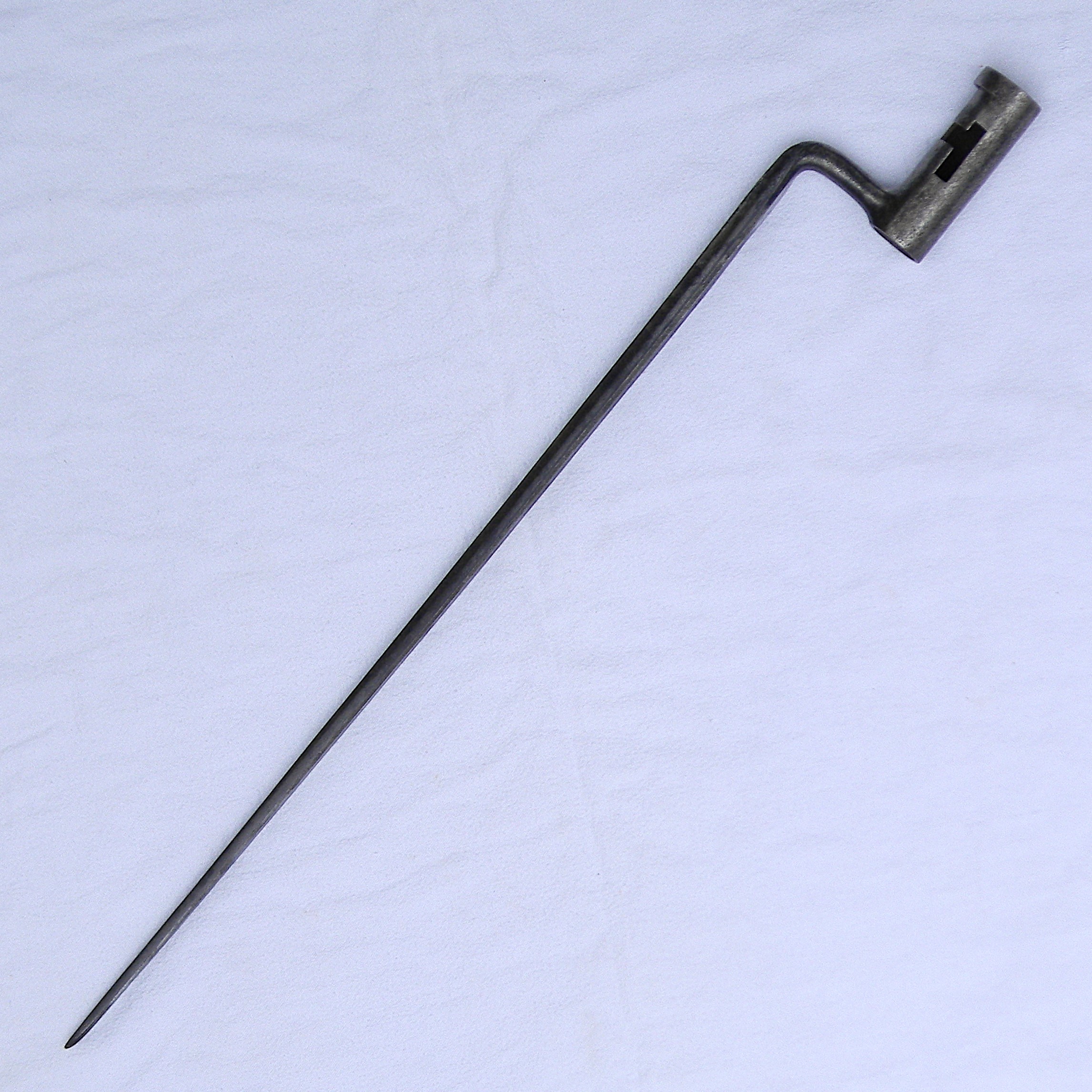 Original Civil War era US M1816 socket bayonet for .69 caliber M1816 flintlock musket. This bayonet is used, but it is in very good overall condition for the type. The blade is about 18-1/2” / 47 cm long; the bayonet is about 21-1/8” / 53.5 cm overall; socket length is about 3″ / 76 mm. The blade is straight with no nicks or dings on the spine or edges; original tip is intact. The blade is weakly sharply stamped US on ricasso. There is no scabbard. During WW2 years a lot of surviving M1816 and M1873 “spike” bayonets were cut-up to make trench daggers and fighting knives like this one; this type is scarce this nice and complete.