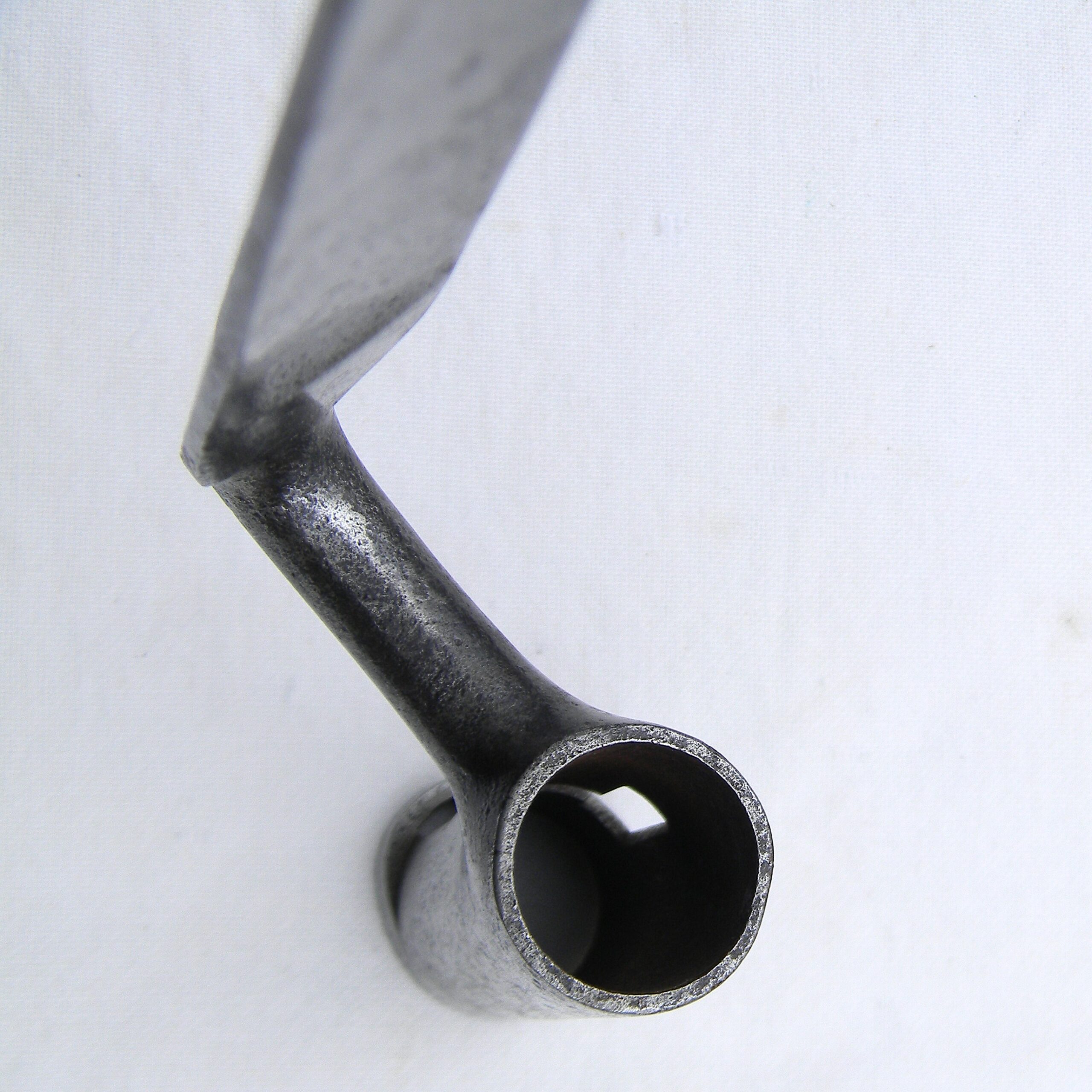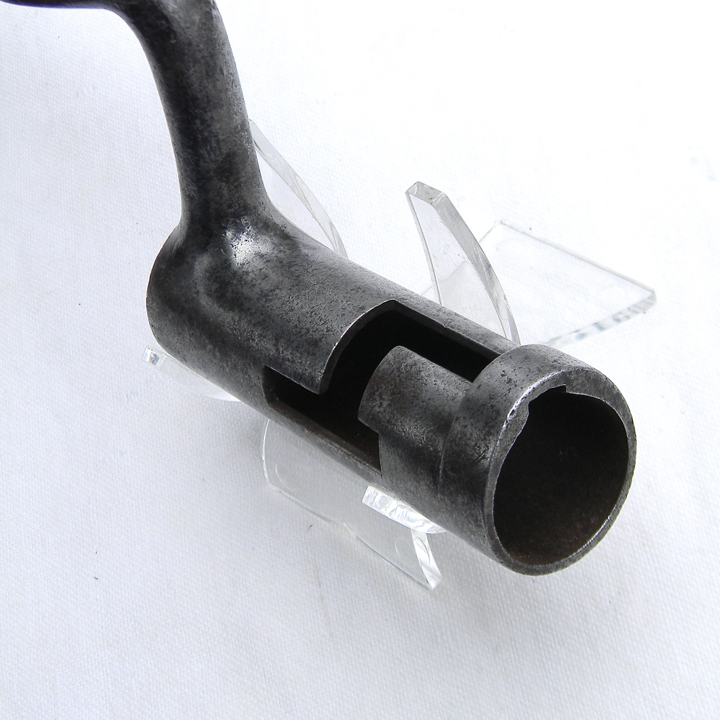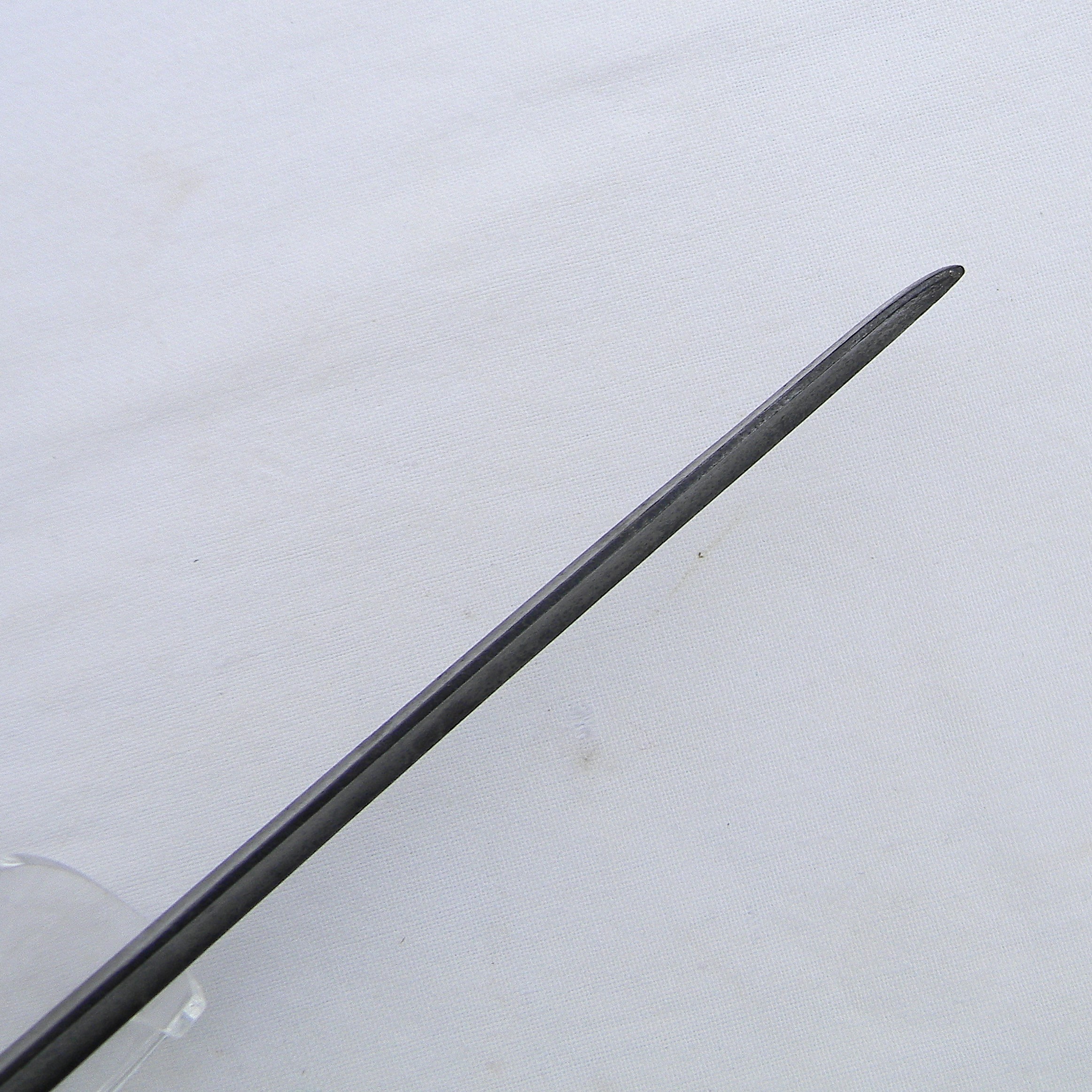 Original Civil War era US M1816 socket bayonet for .69 caliber M1816 flintlock musket. This bayonet is used, but it is in very good overall condition for the type. The blade is about 18-1/2” / 47 cm long; the bayonet is about 21-1/8” / 53.5 cm overall; socket length is about 3″ / 76 mm. The blade is straight with no nicks or dings on the spine or edges; original tip is intact. The blade is weakly sharply stamped US on ricasso. There is no scabbard. During WW2 years a lot of surviving M1816 and M1873 “spike” bayonets were cut-up to make trench daggers and fighting knives like this one; this type is scarce this nice and complete.