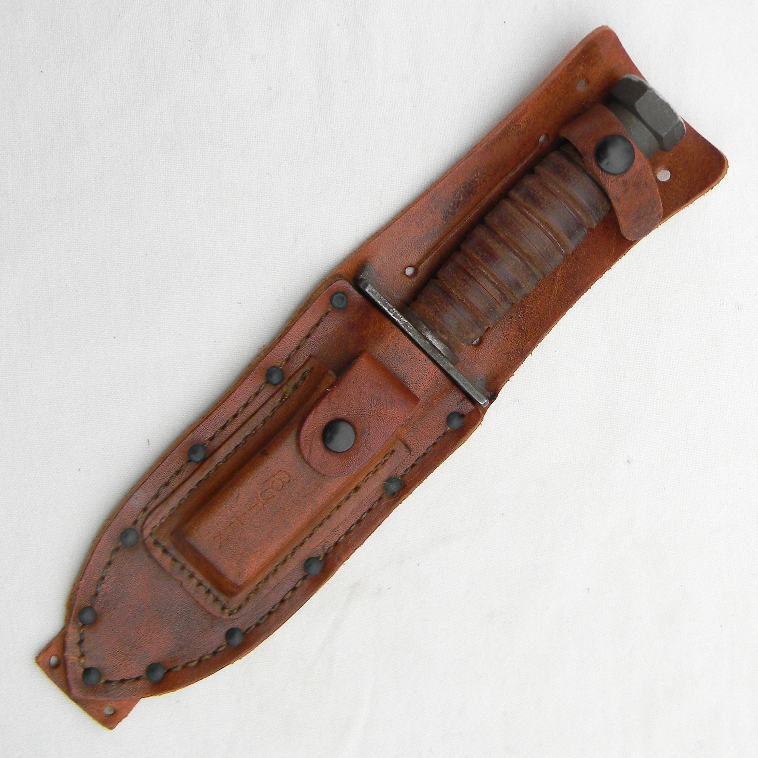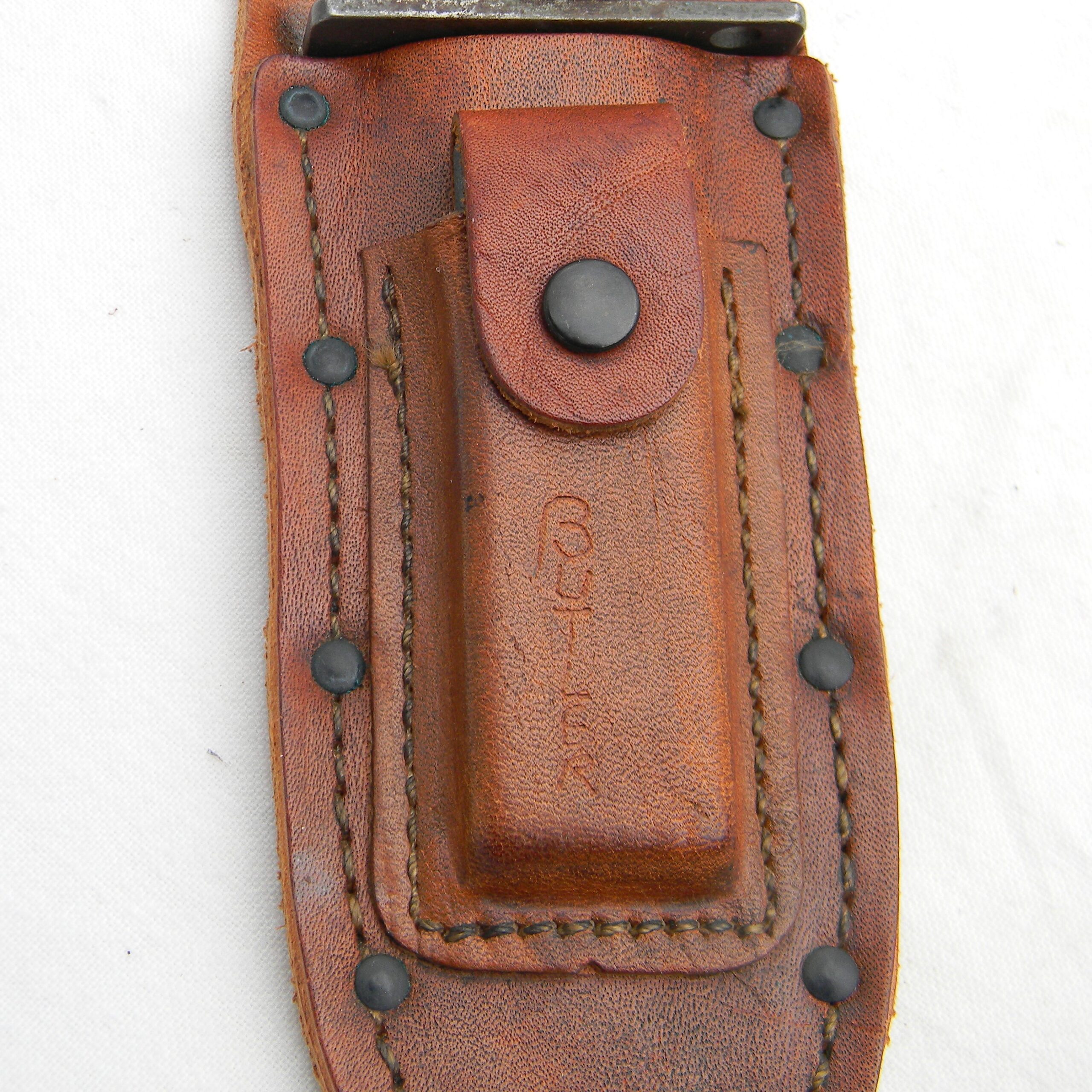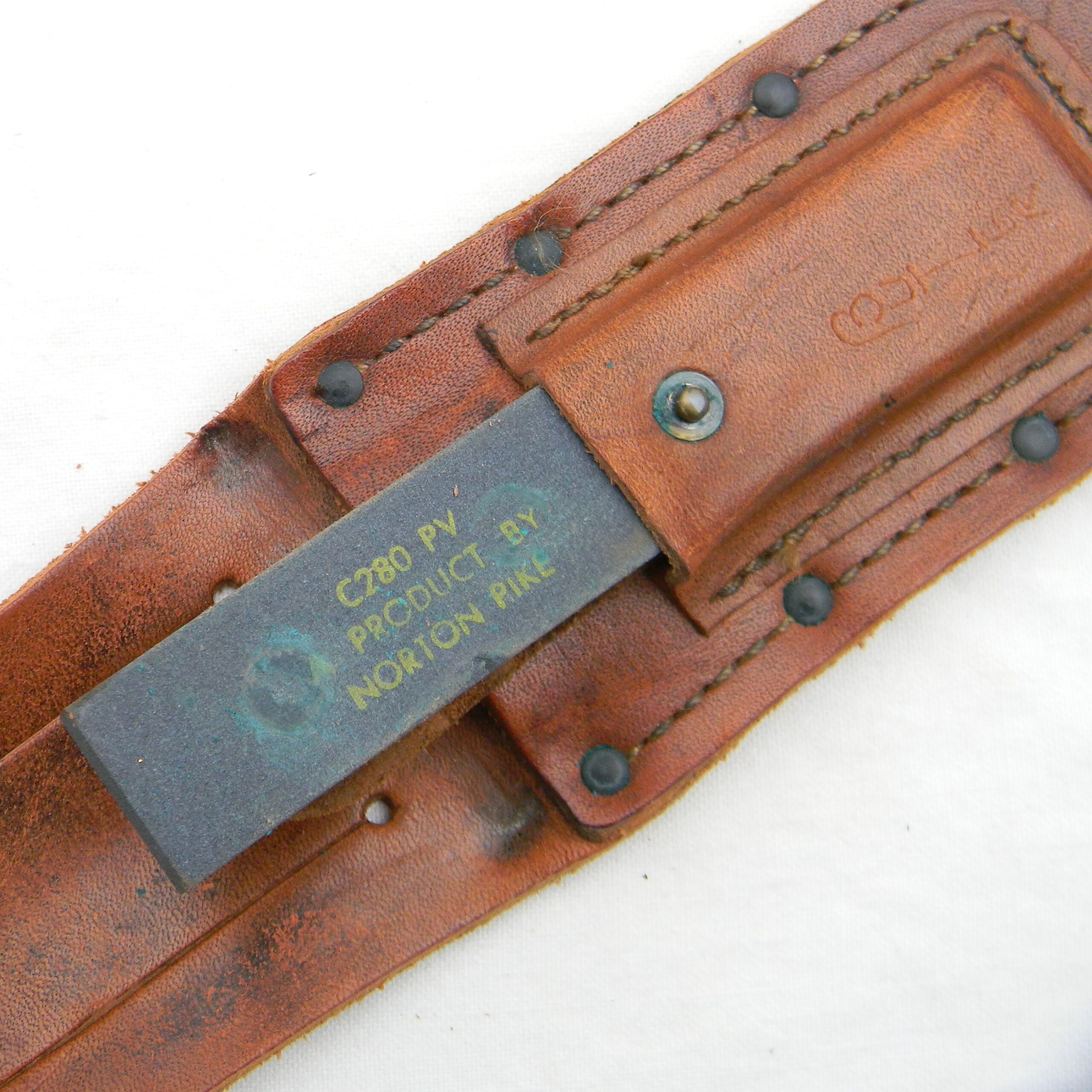 This rare early Vietnam War 1960s Camillus Jet Pilot Knife with original leather scabbard and Pike honing stone has not been cleaned or tampered with in any way, this set is in 100% original “as is” condition; these are the actual photos. I have a few Vietnam War era knives and bayonets, as well as some American, British, Commonwealth, and German WW2 era combat knives and bayonets and several scarce WW1 and WW2 fighting daggers / trench knives – please take a look in the Militaria section.